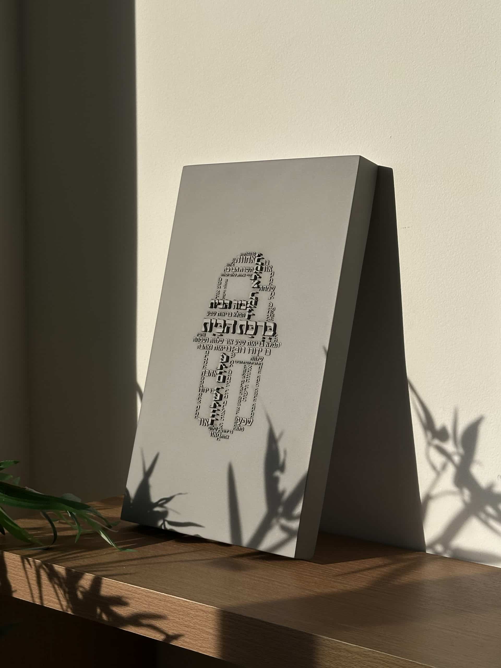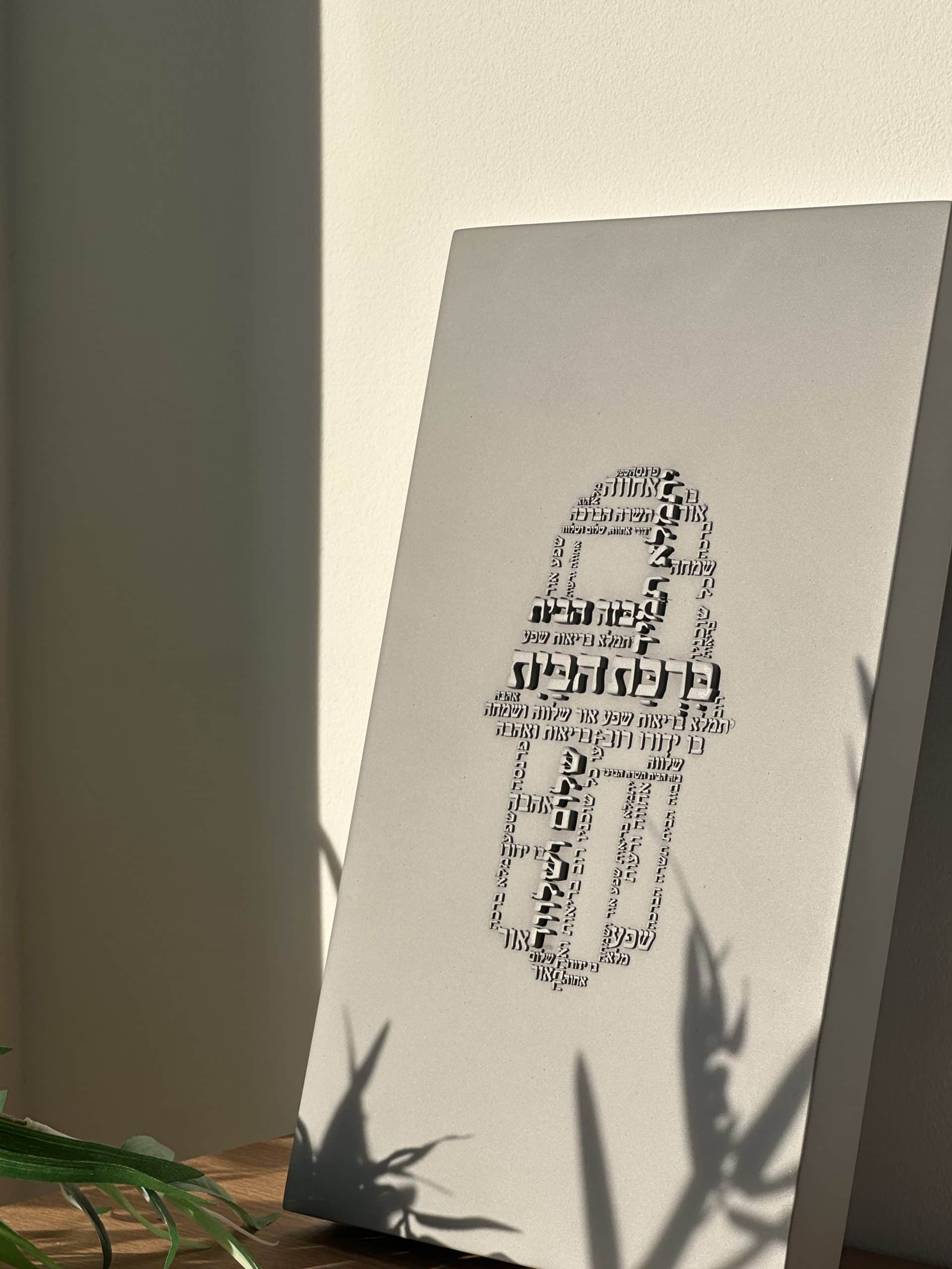 ברכת הבית דגם חמסה מבטון , גוון אפור , אורך 35 ס”מ , רוחב 21 ס”מ .