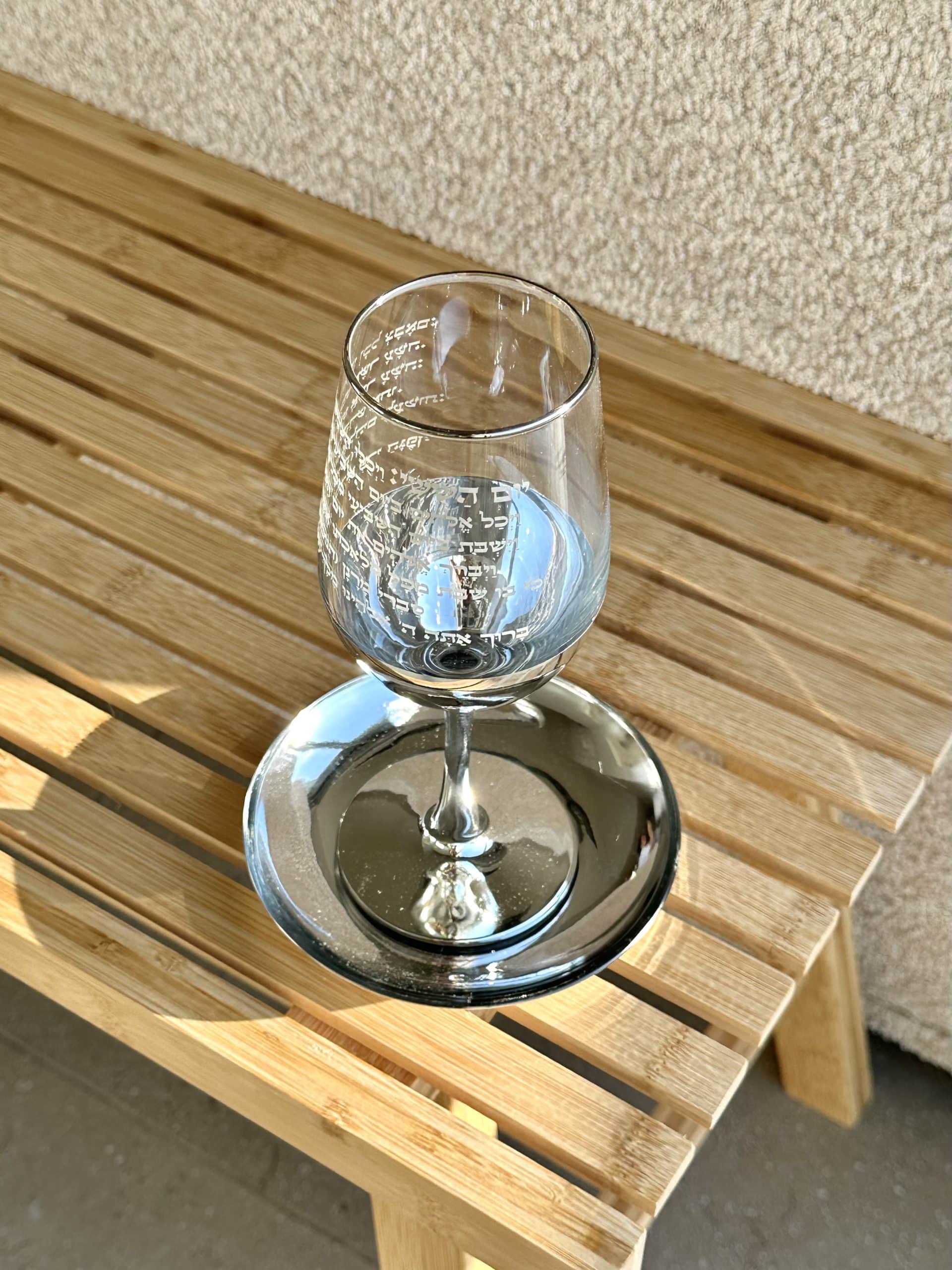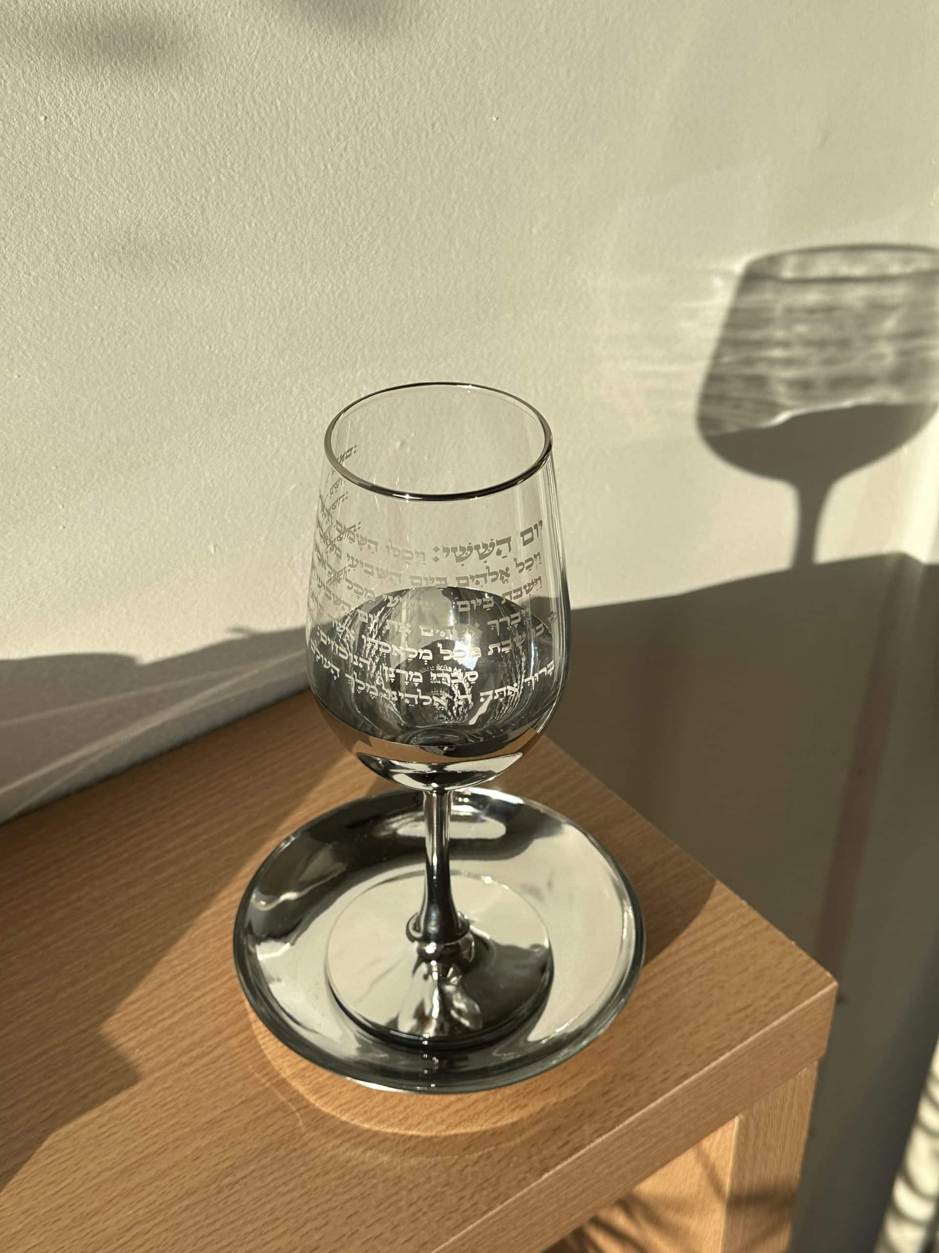 גביע קידוש ״יום השישי״ גוון שקוף עם כסף,  גובה 21 ס”מ .