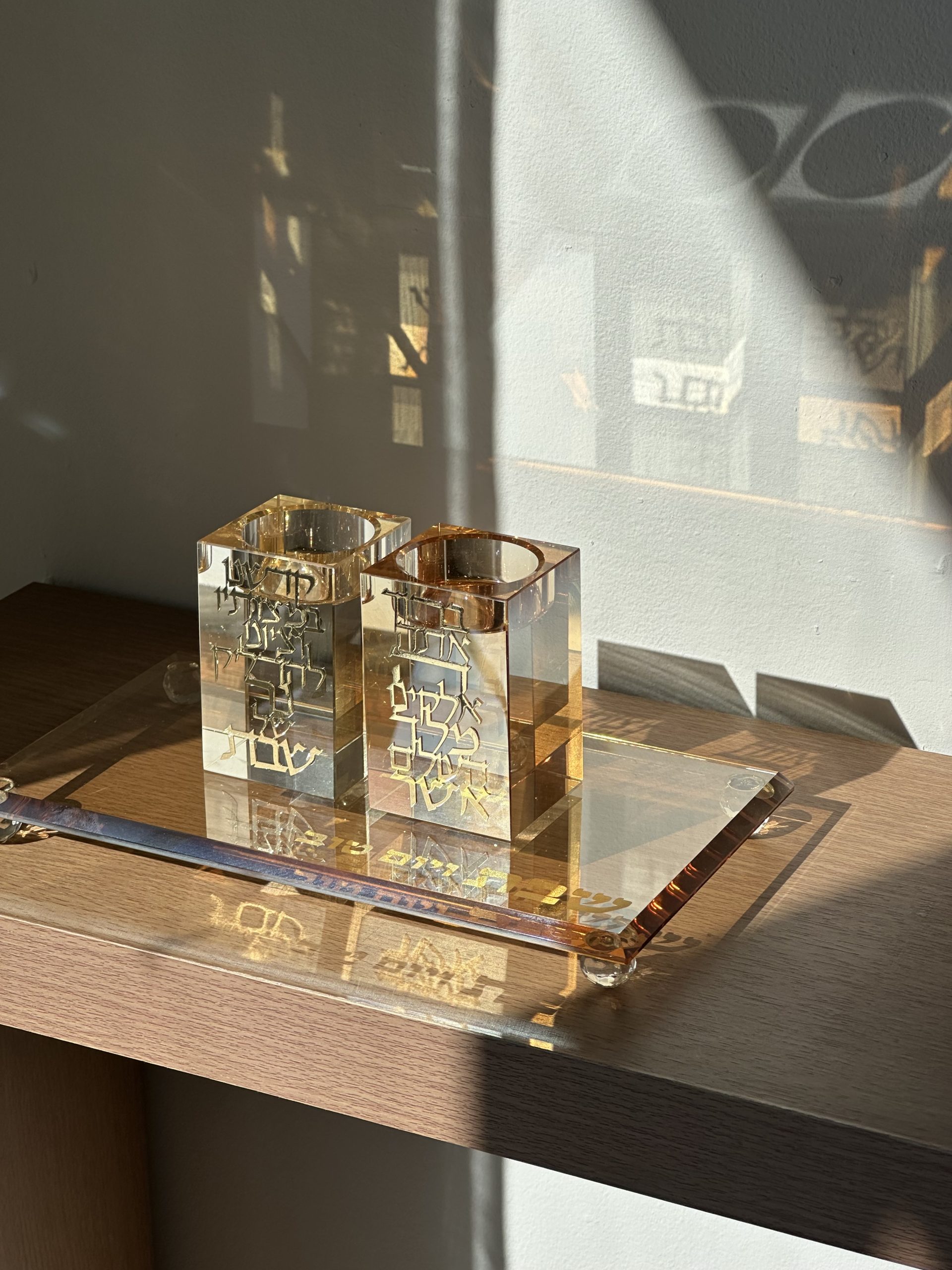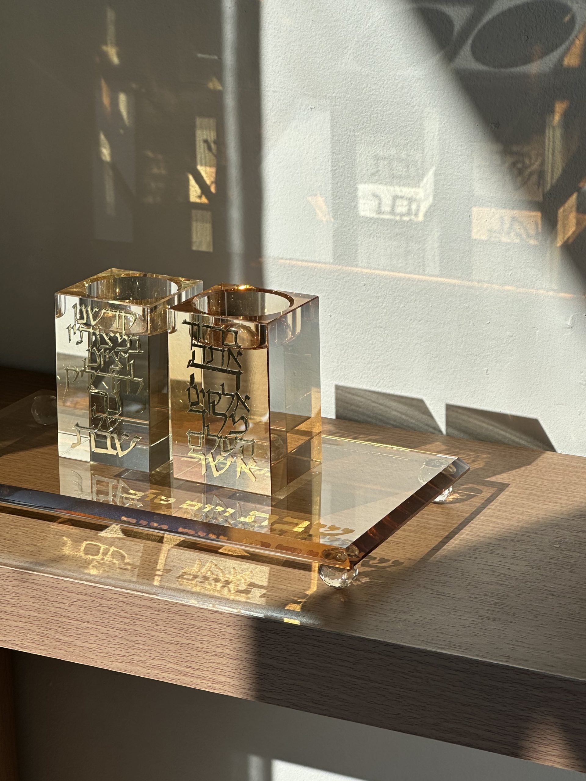 זוג פמוטים קריסטל מרובע עם פלקטה ” הדלקת נרות “, גוון רוז גולד , גובה 8 ס”מ .