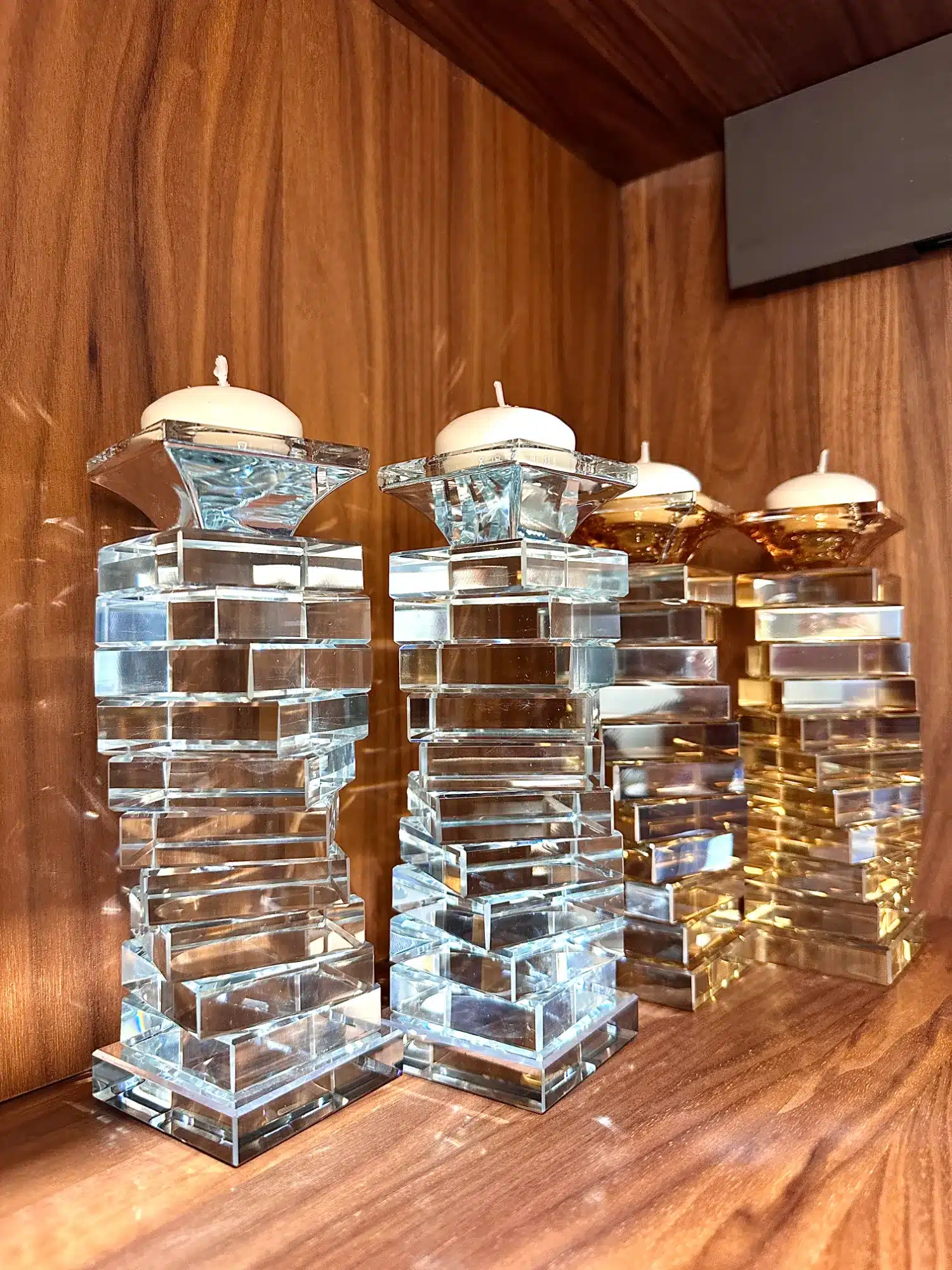 זוג פמוטי קריסטל מדורגים מרובעים , גוון שקוף , גובה 19.5 ס”מ .