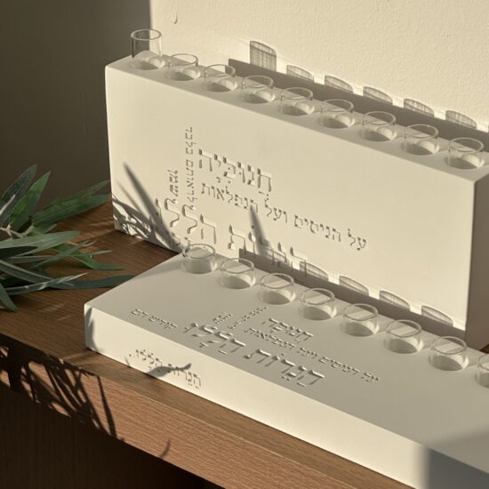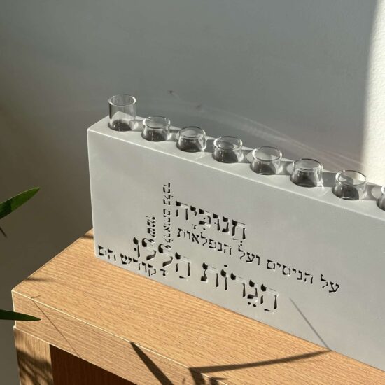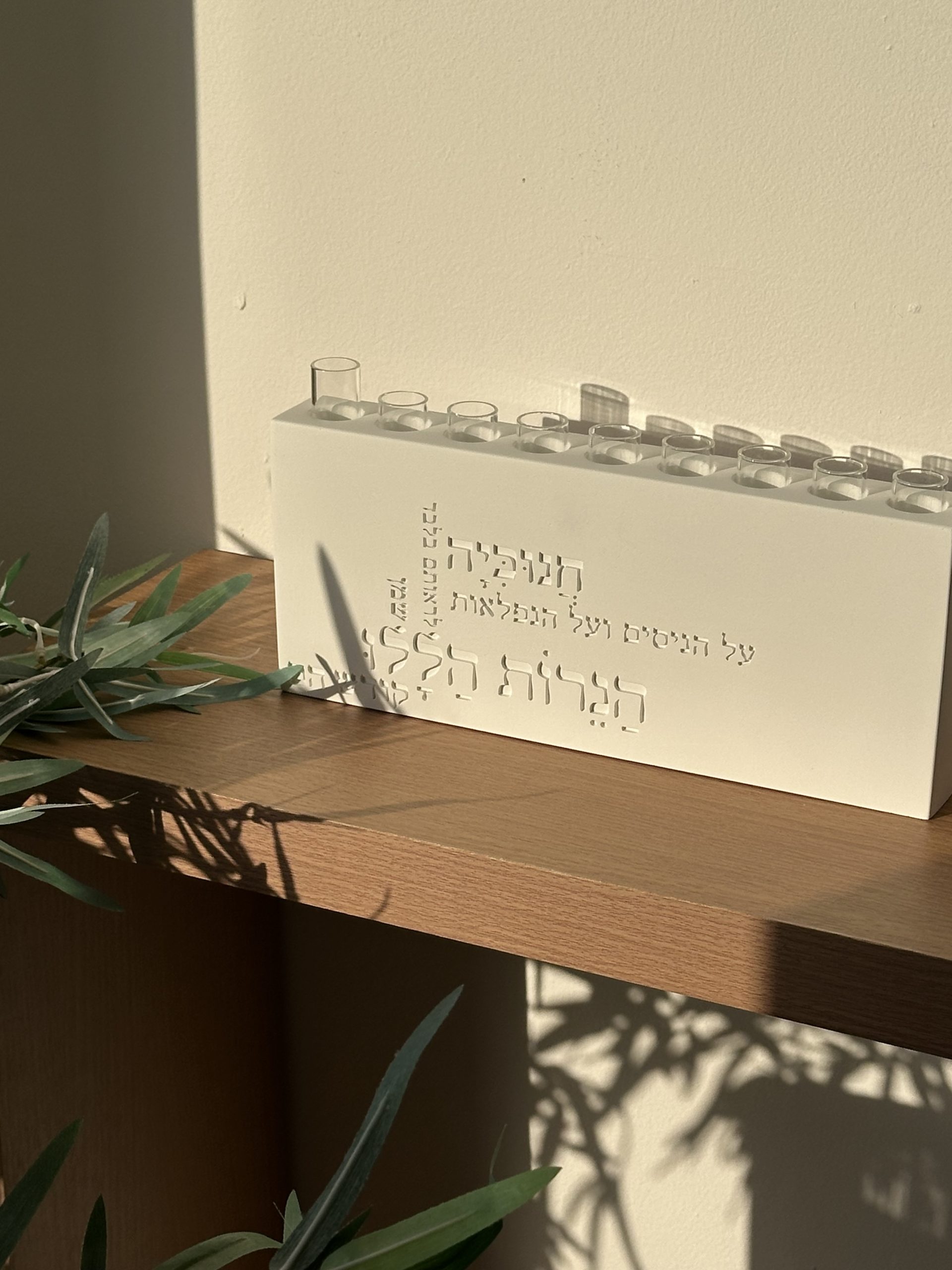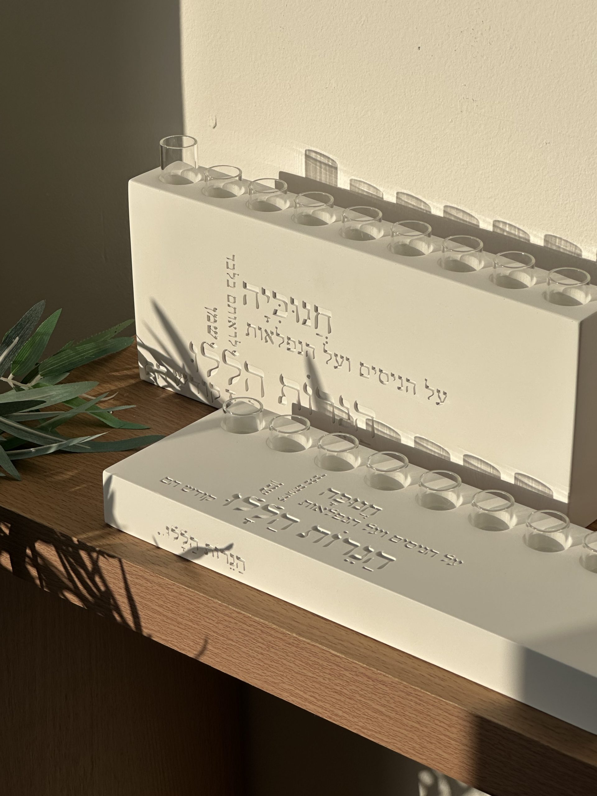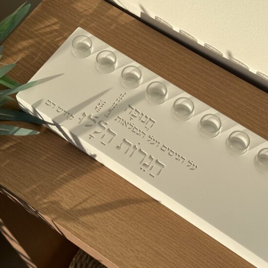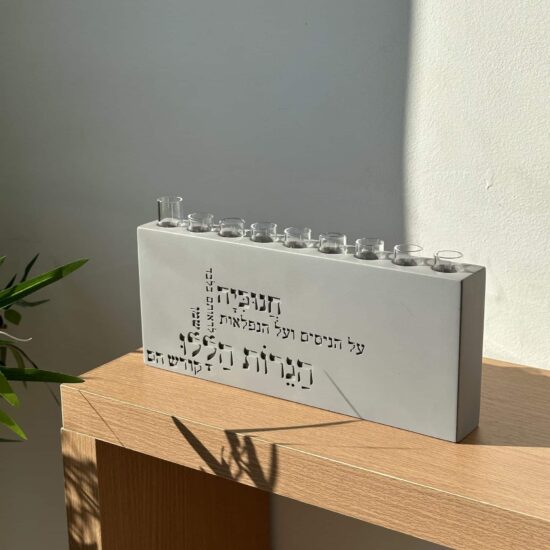 חנוכייה דגם טופוגרפיה + 9 כוסיות זכוכית , גוון לבן , רוחב 4 ס״מ , אורך 28 ס״מ , גובה 12 ס״מ .
