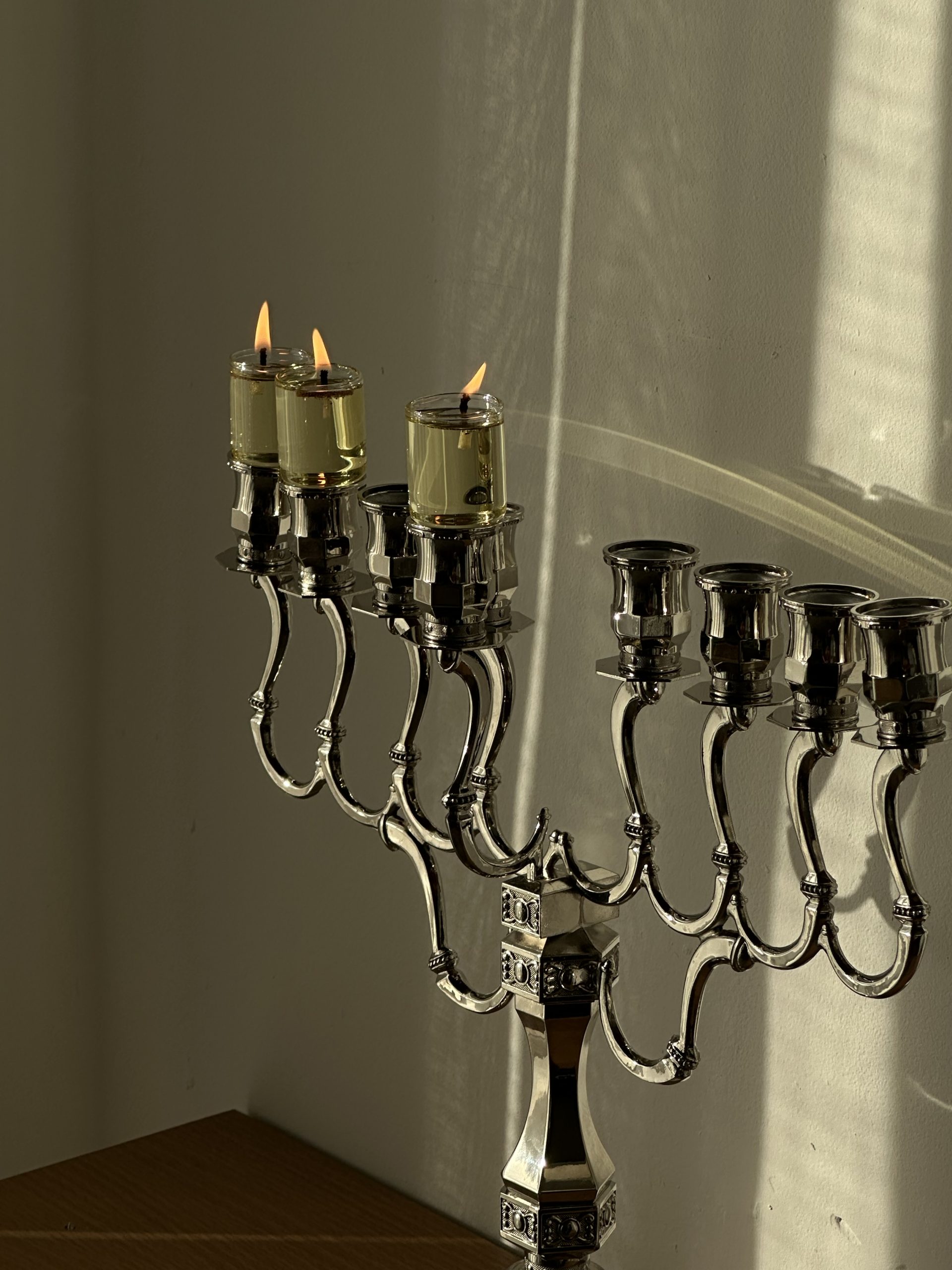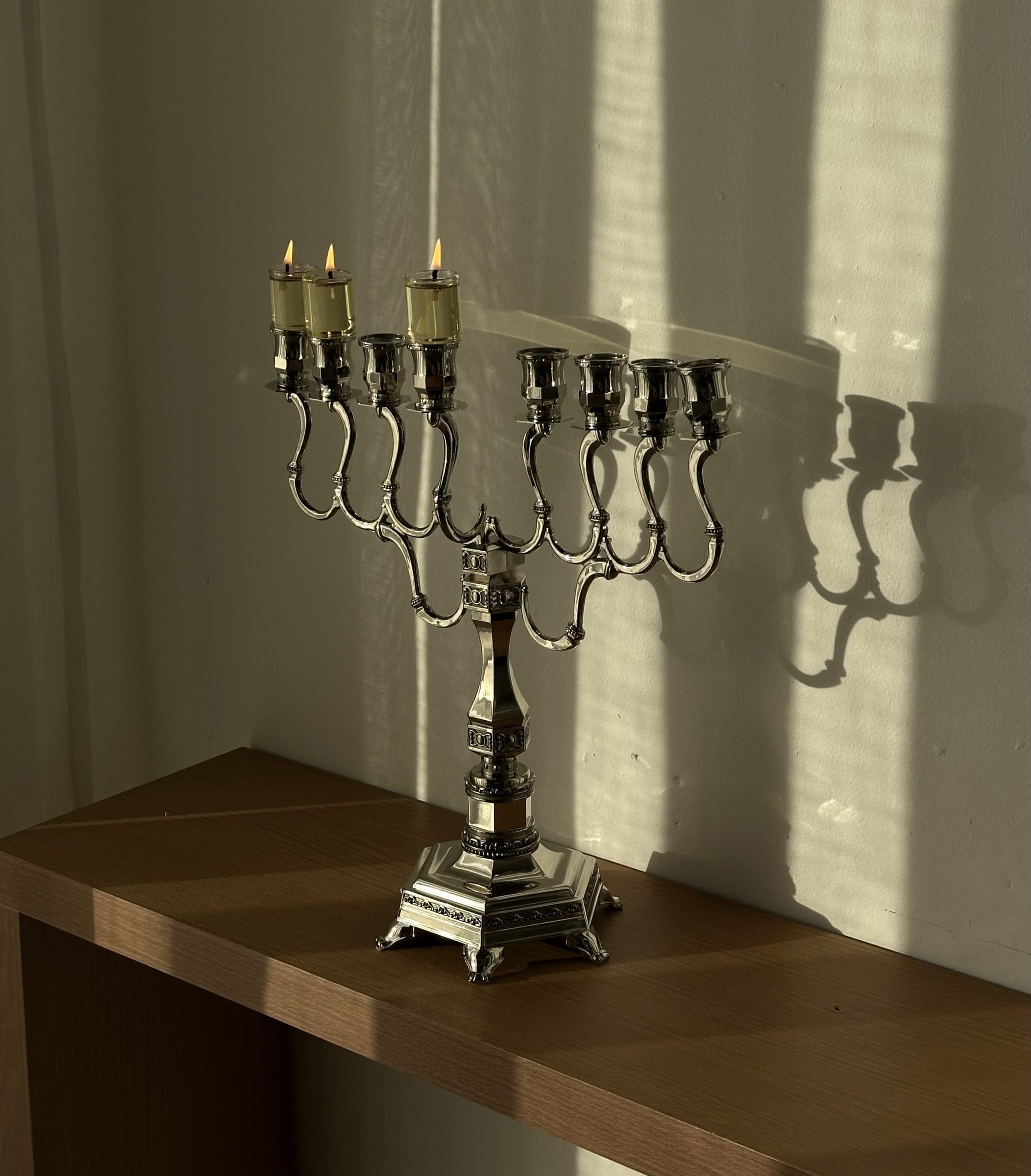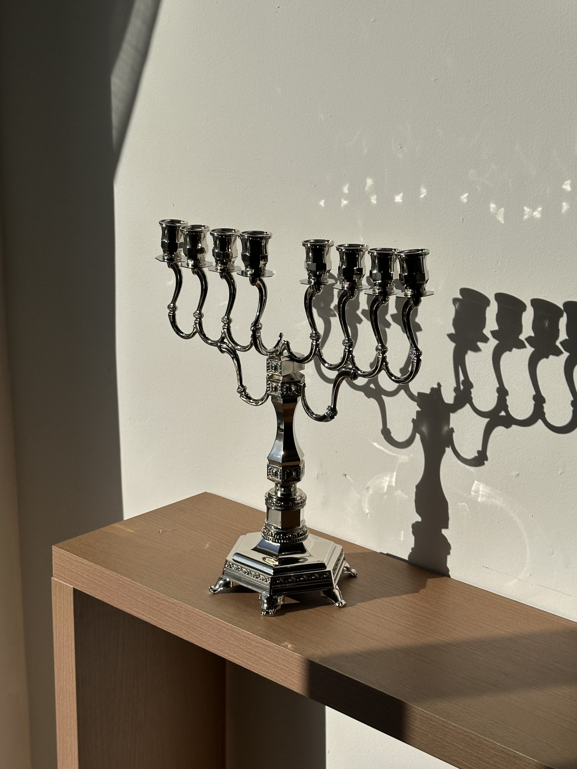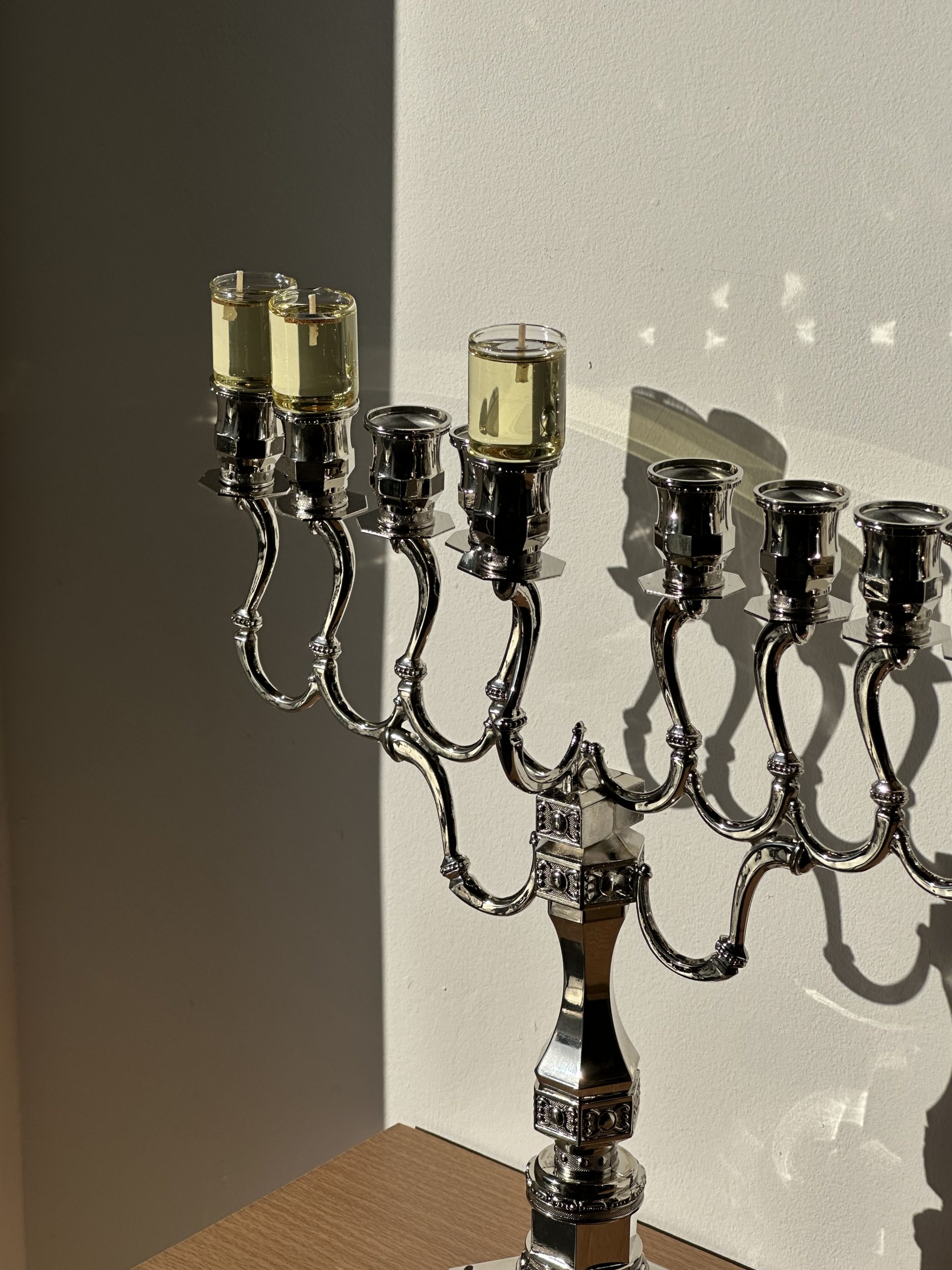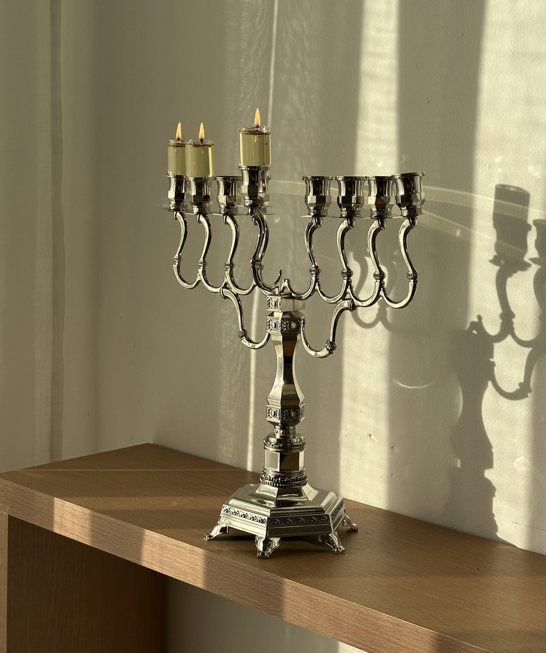 בסיס החנוכייה מצופה ניקל איכותי (בגוון כסף ) המעניק עמידות וברק נקי ואלגנטי במיוחד – שילוב של מסורת , אור וקדושה !