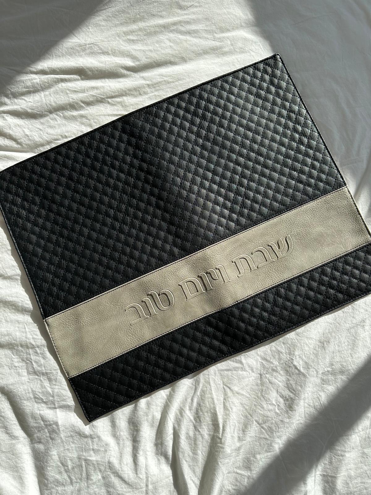 כיסוי חלה מהודר ” שבת ויום טוב ” דמוי עור , גוון שחור ובז’ , 52 ס”מ על 42 ס”מ .