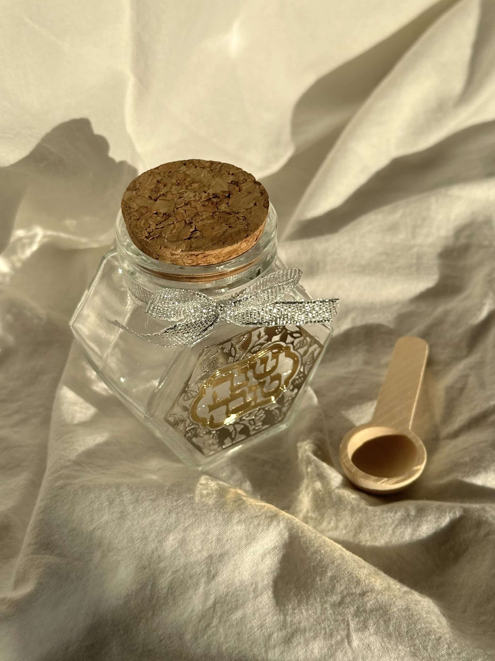כלי לדבש מזכוכית דגם רימון + כפית עץ , גוון רוז גולד , אורך 8 ס״מ , רוחב 6 ס״מ .