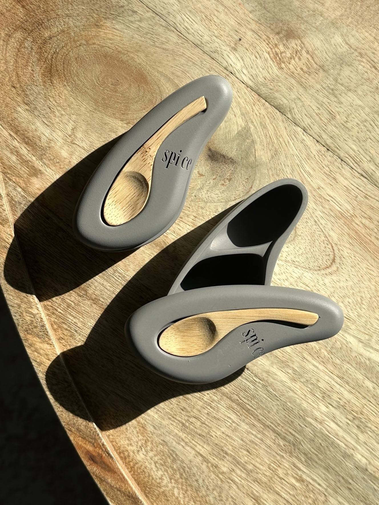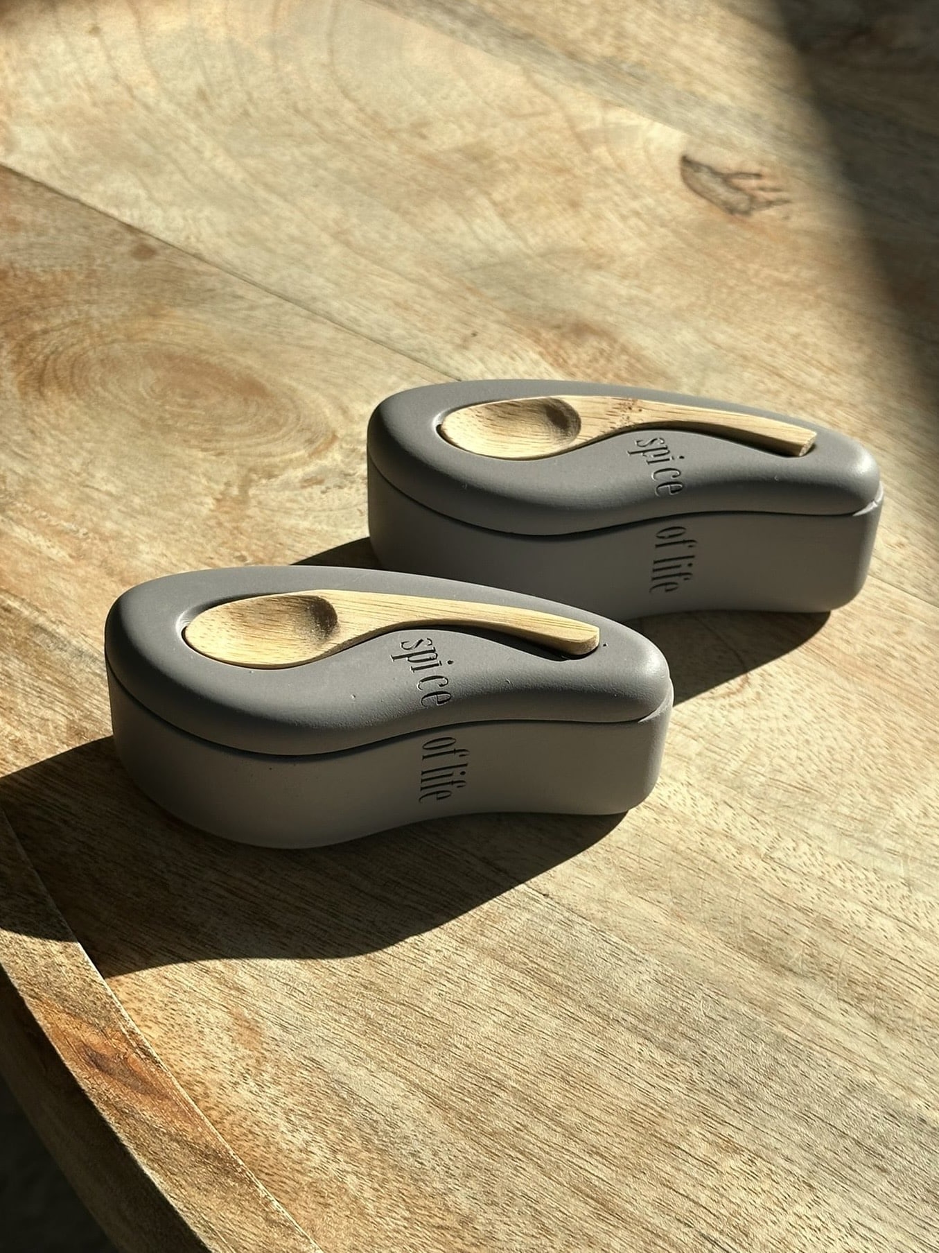 כלי לתבלינים מבטון + כפית מעץ , גוון בטון , אורך 4.5 ס״מ , רוחב 10 ס״מ .