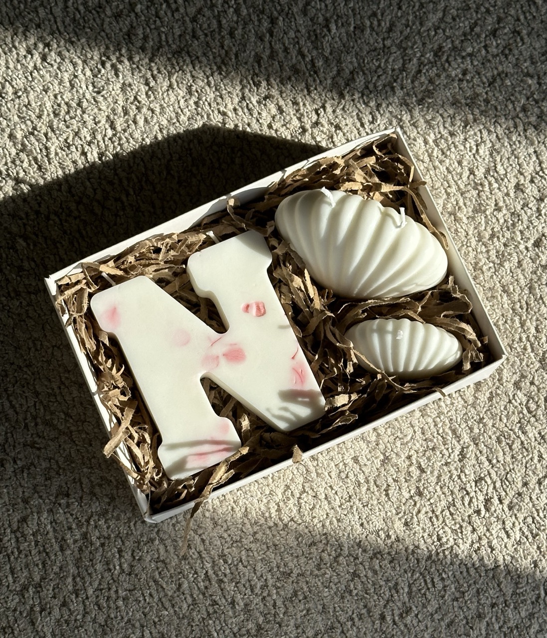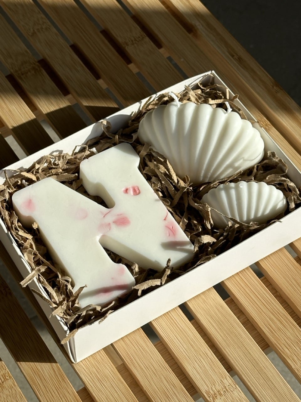 המארז כולל צדפה גדולה בצבע לבן. גובה: 8 ס״מ רוחב: 10.5 ס״מ. בנוסף כולל נר אות עם פרחים יבשים. גובה: 10 ס״מ רוחב: 8-9 ס״מ.