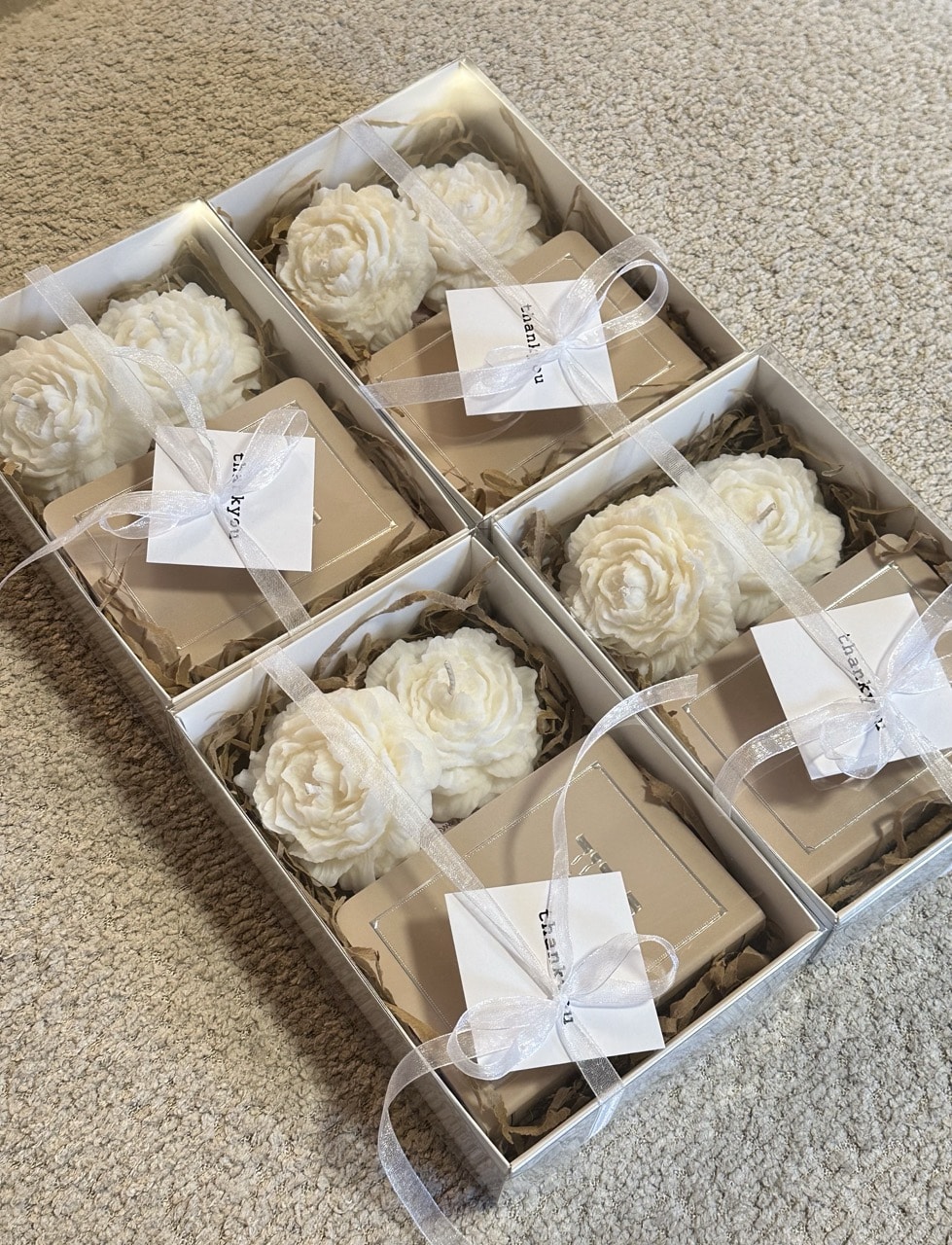 בנוסף כולל זוג נרות פרחים בגוון לבן בניחוח מדהים . קוטר 8 ס״מ .