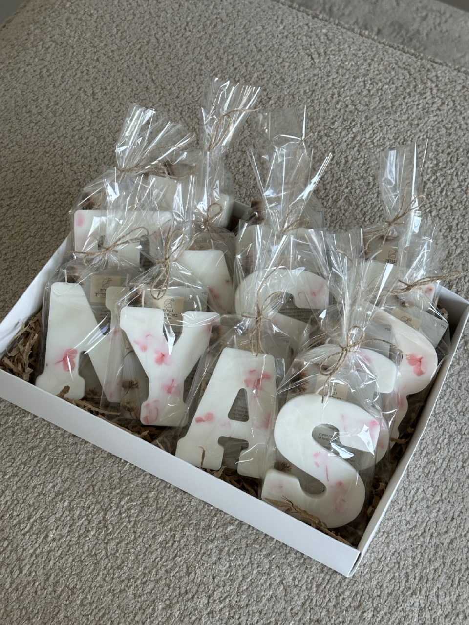 נרות האותיות שלנו עשויים משעוות סויה ומגיעים עם ריח ממכר ומגוון פרחים בצבעים שונים ונותנים משמעות לכל אחד ואחת.