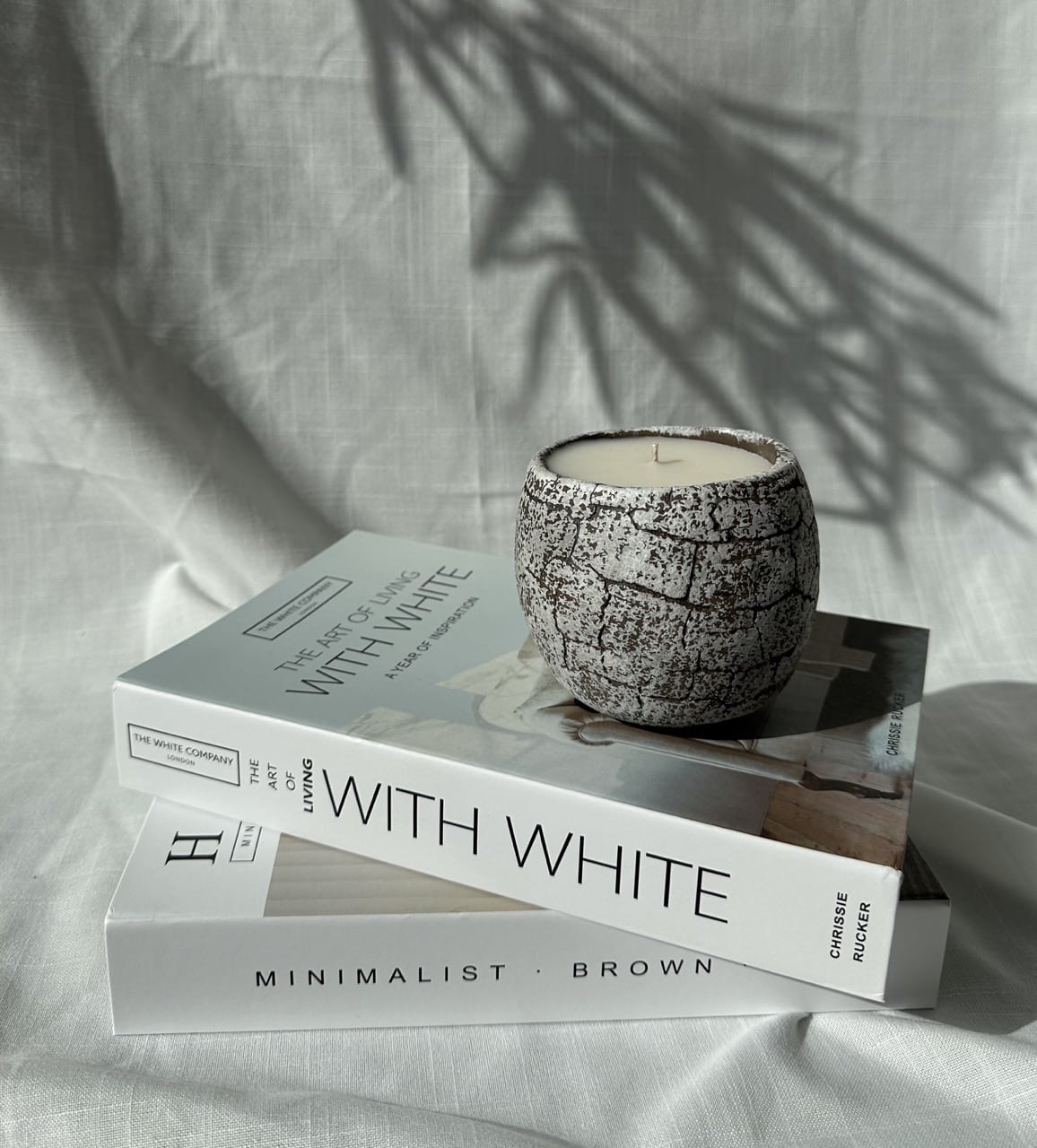 נר ריחני עשוי משעוות סויה המגיע בכד חרס בצורת קוקוס בצבעים משולבים של חום ולבן.