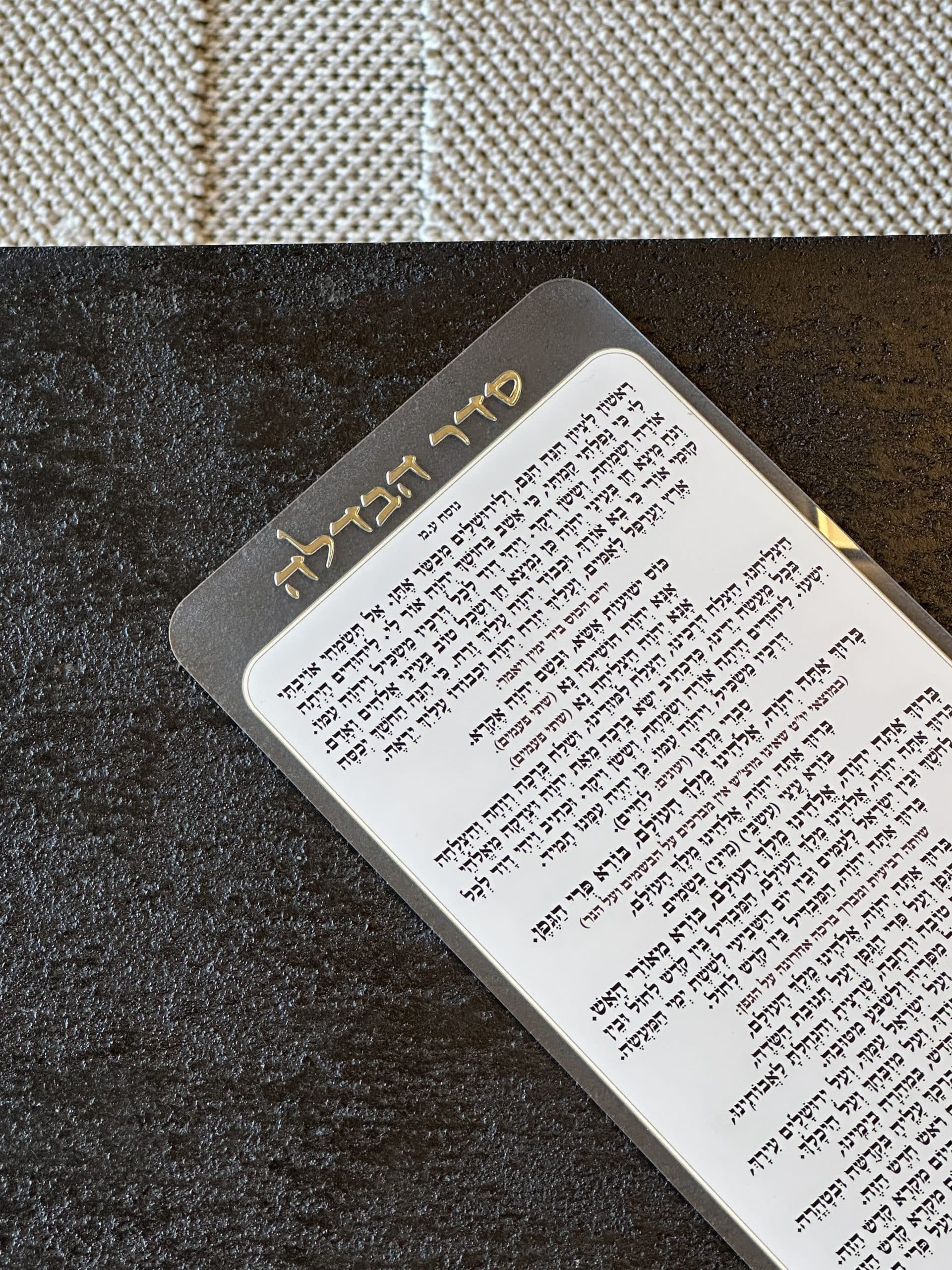 סדר הבדלה מפרספקס , נוסח עדות המזרח , אורך 27 ס״מ , רוחב 15 ס״מ .