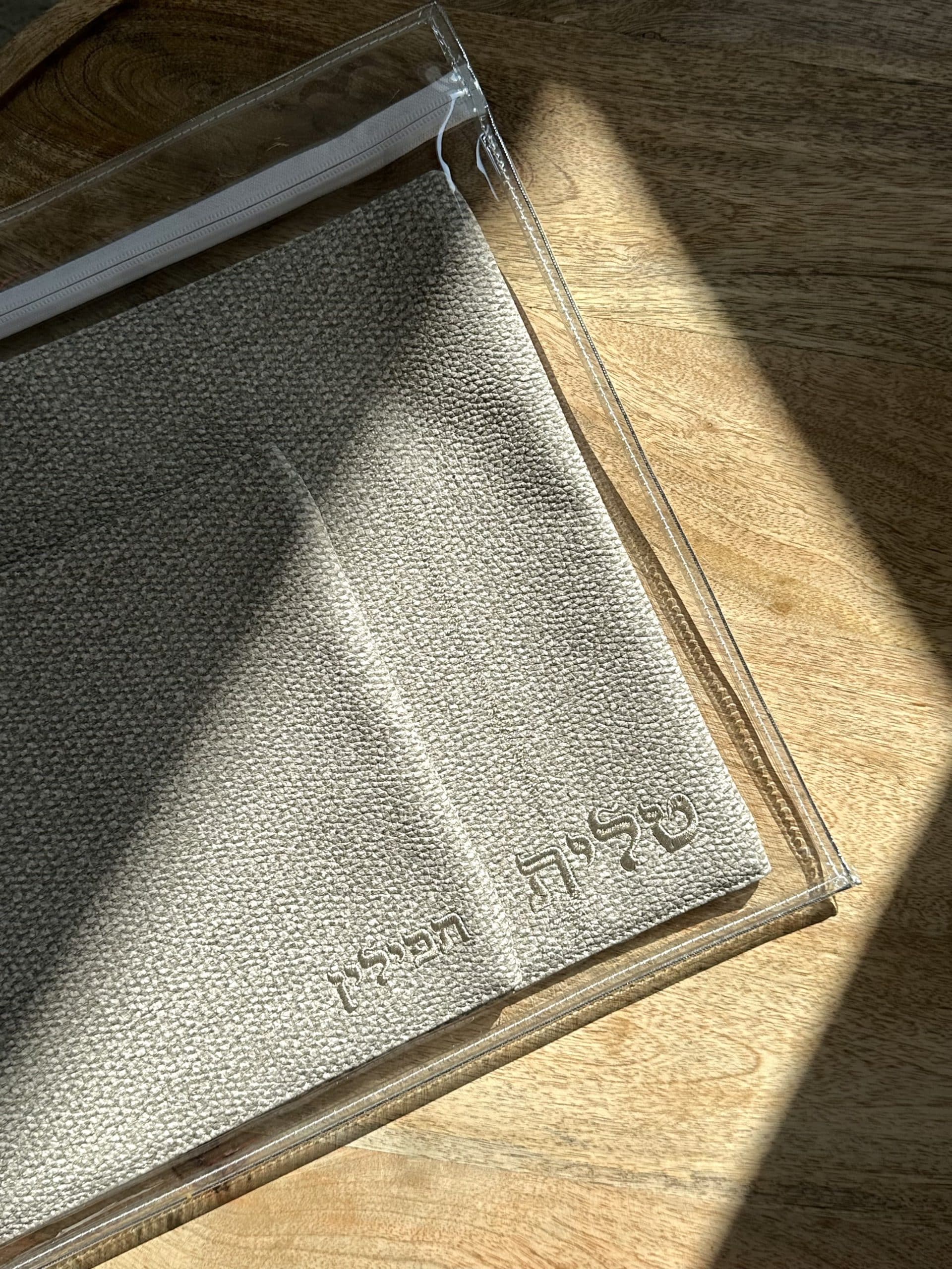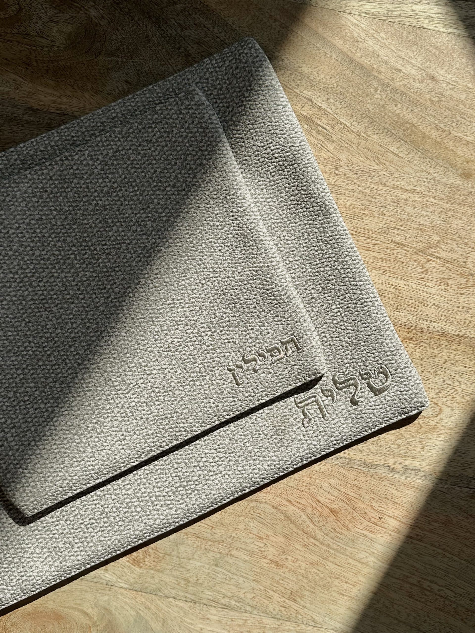 סט טלית ותפילין מפואר , דמוי עור , גוון אפור , אורך 36 ס”מ , רוחב 29 ס”מ .