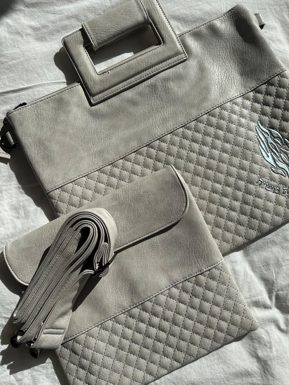 סט טלית ותפילין מפואר ” האש שלי ” עם הבלטה , דמוי עור , גוון אפור, אורך 38 ס”מ , רוחב 31 ס”מ .