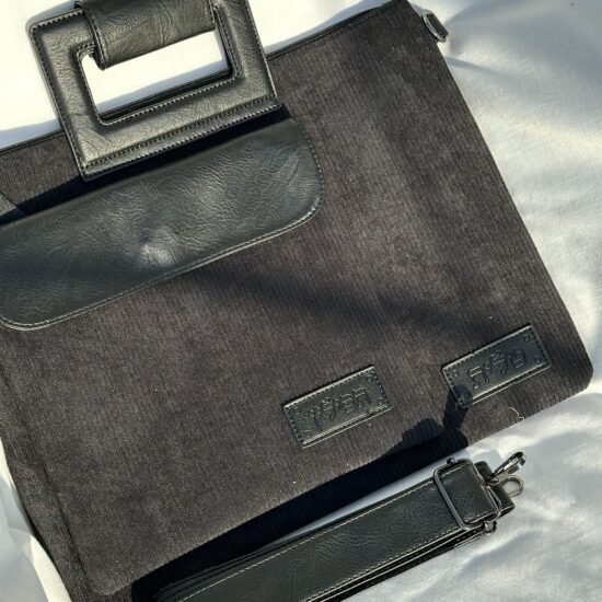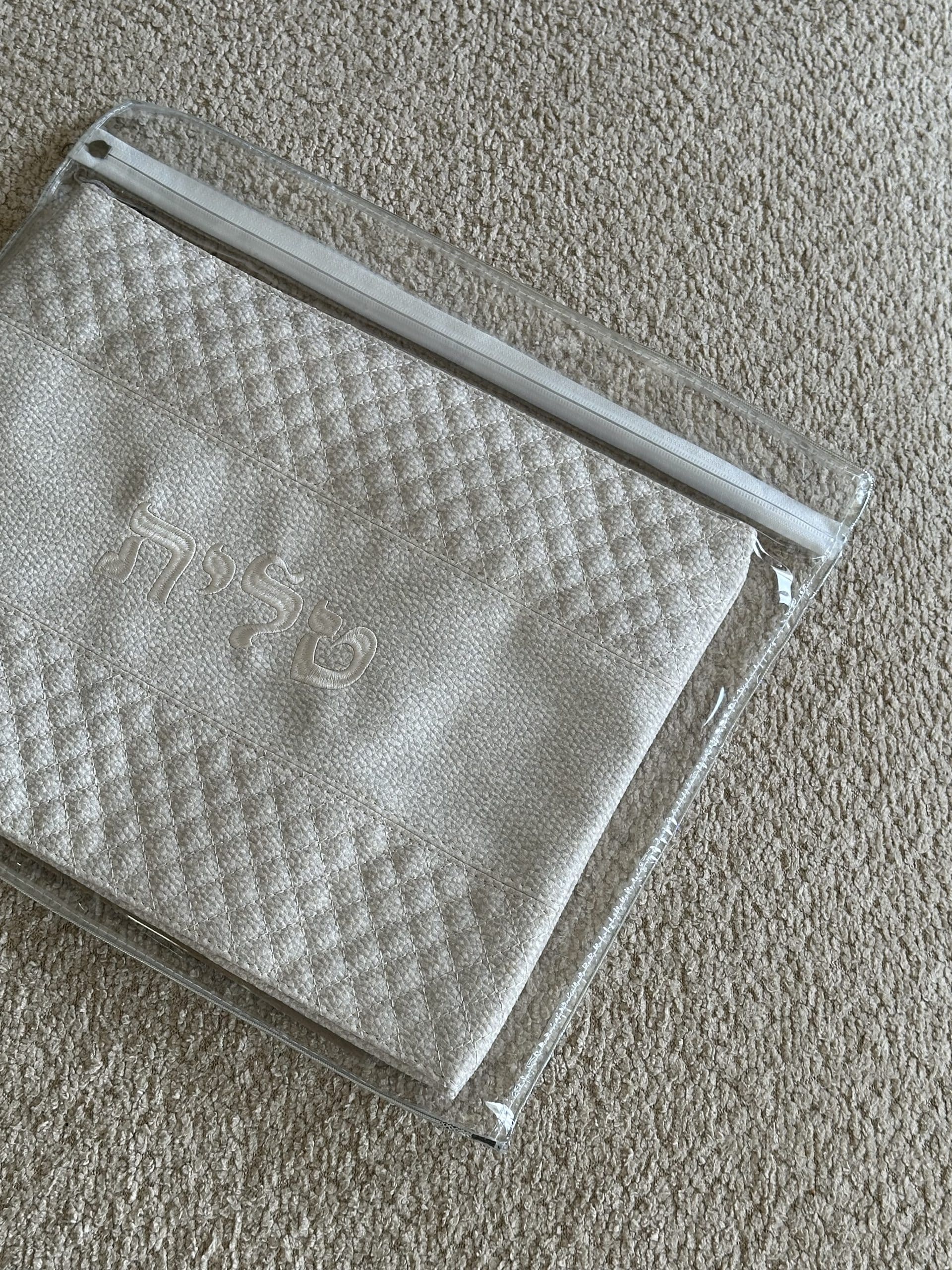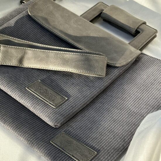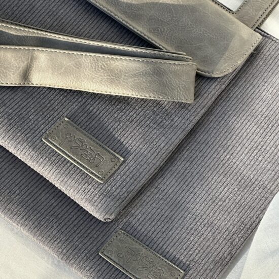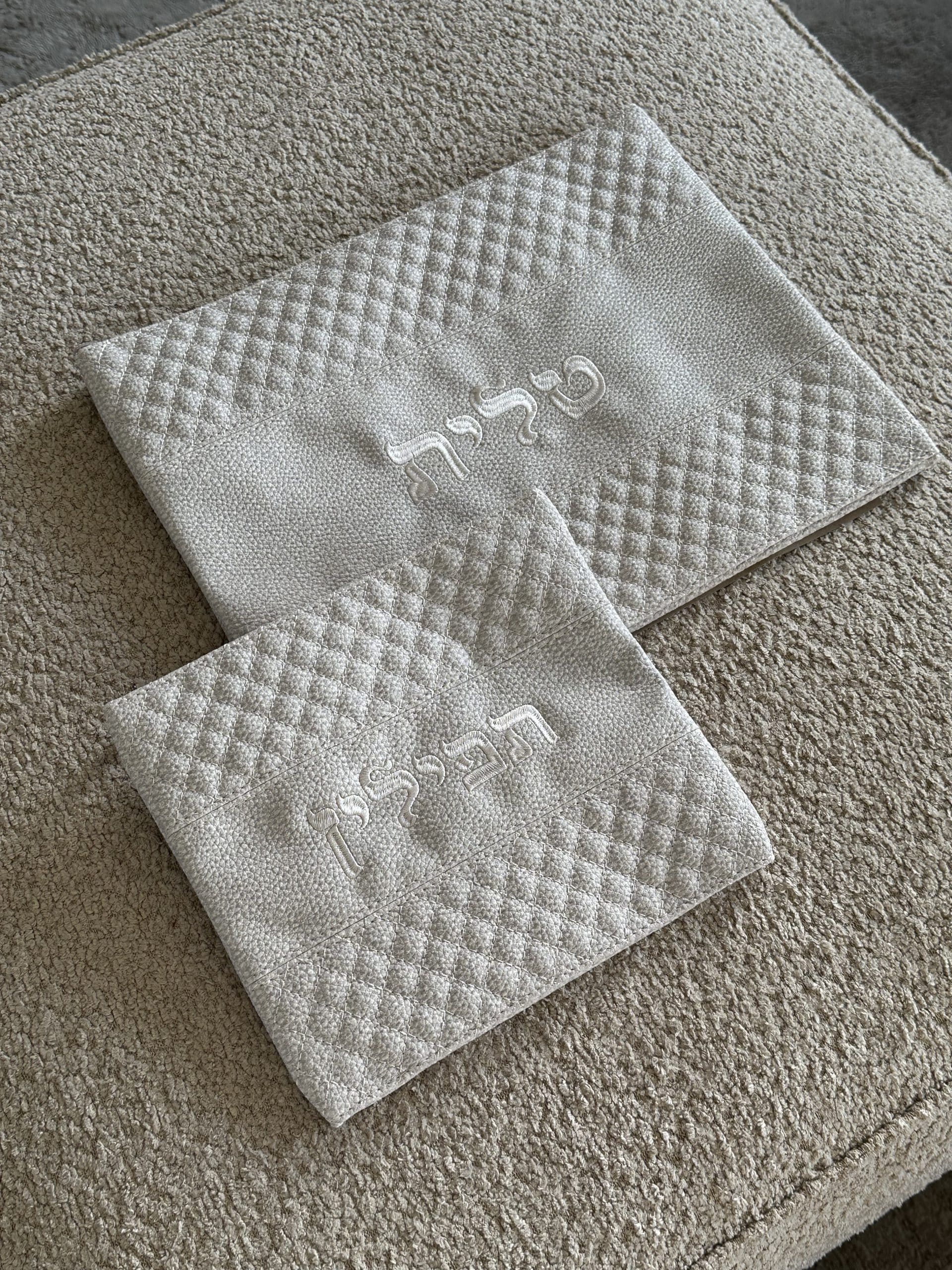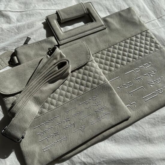 סט טלית ותפילין מפואר , דמוי עור , גוון אפור בהיר , אורך 36 ס”מ , רוחב 29 ס”מ .