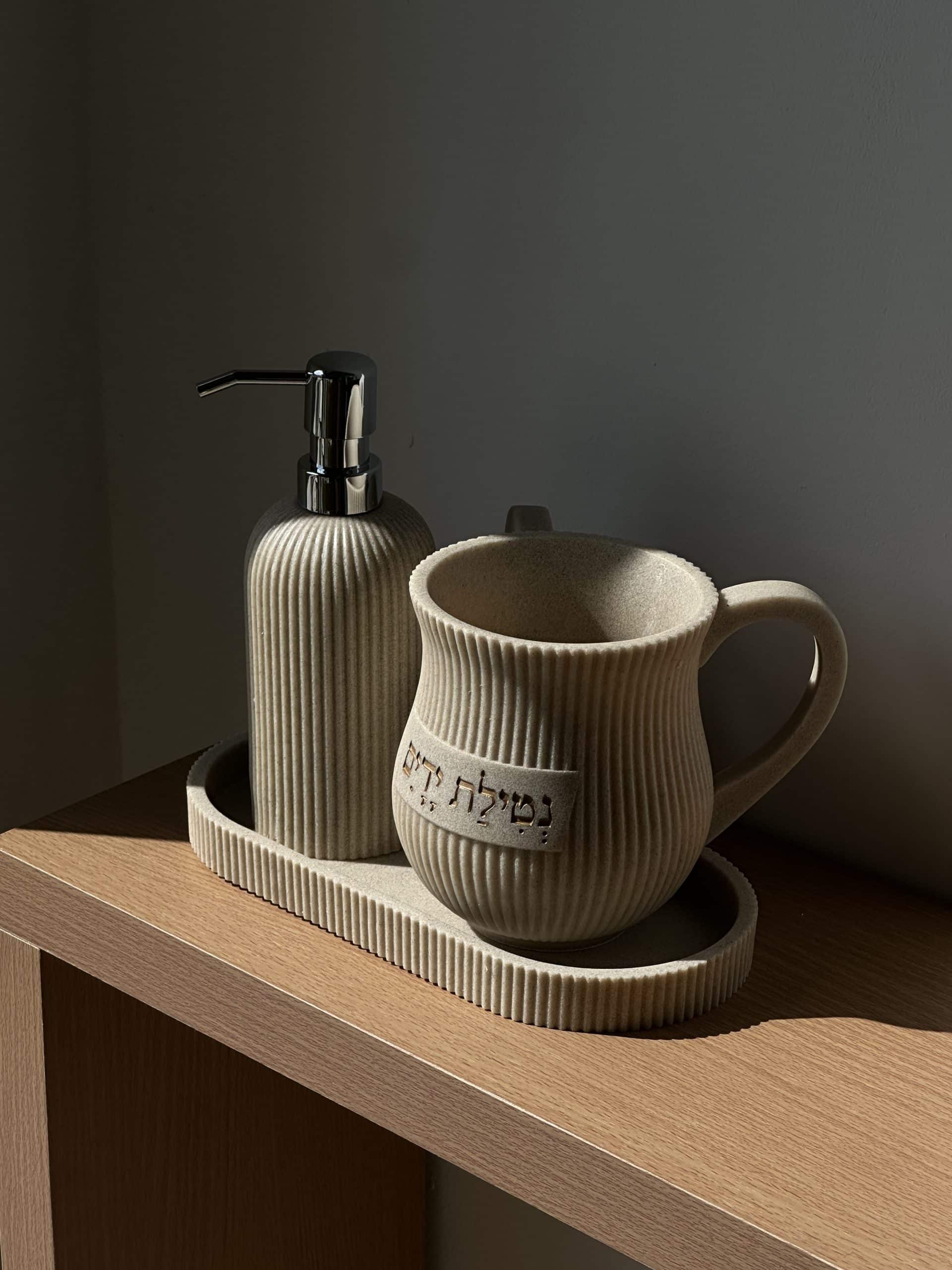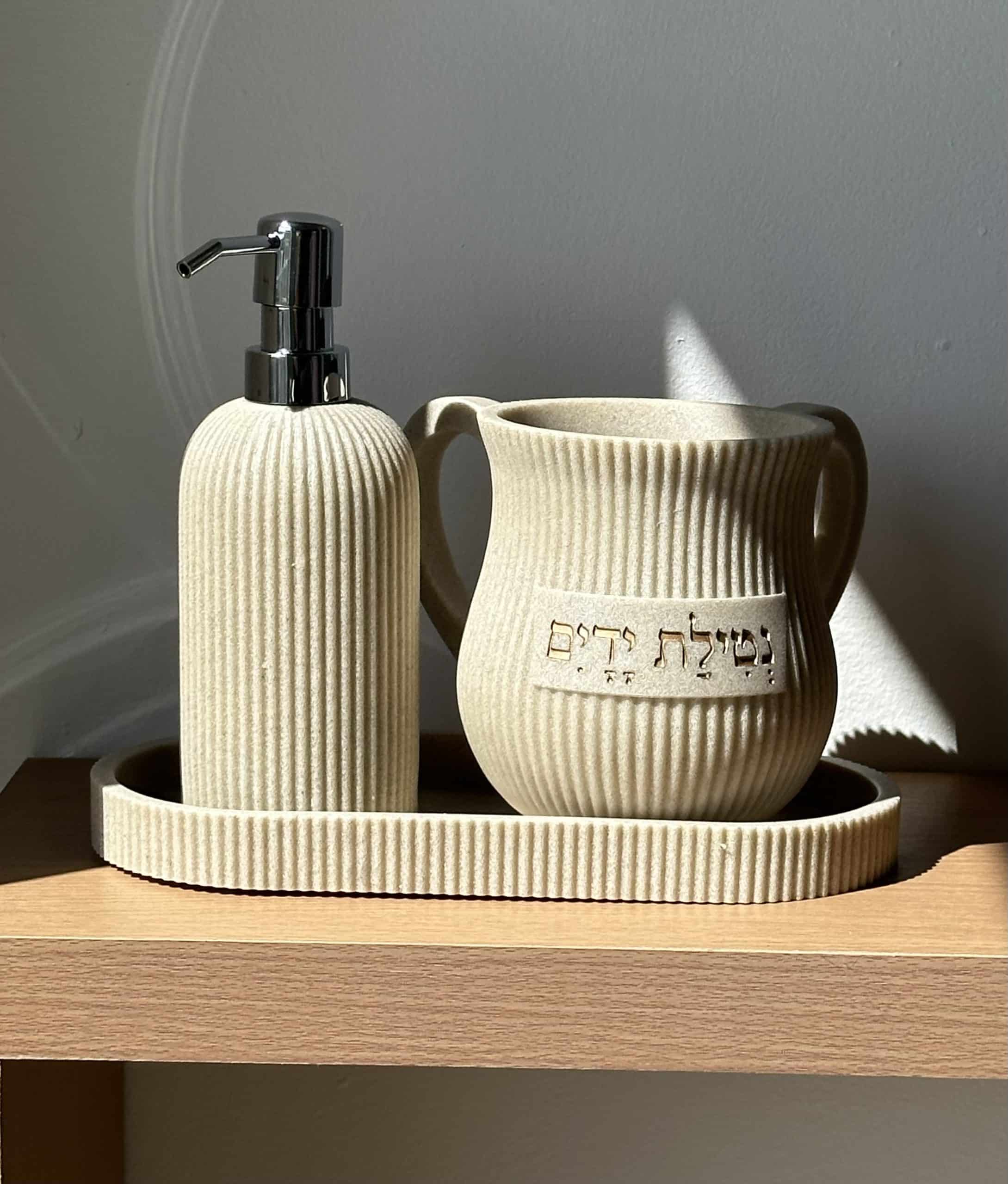 סט נטלה וסבוניה , גוון שמנת , כיתוב זהב .