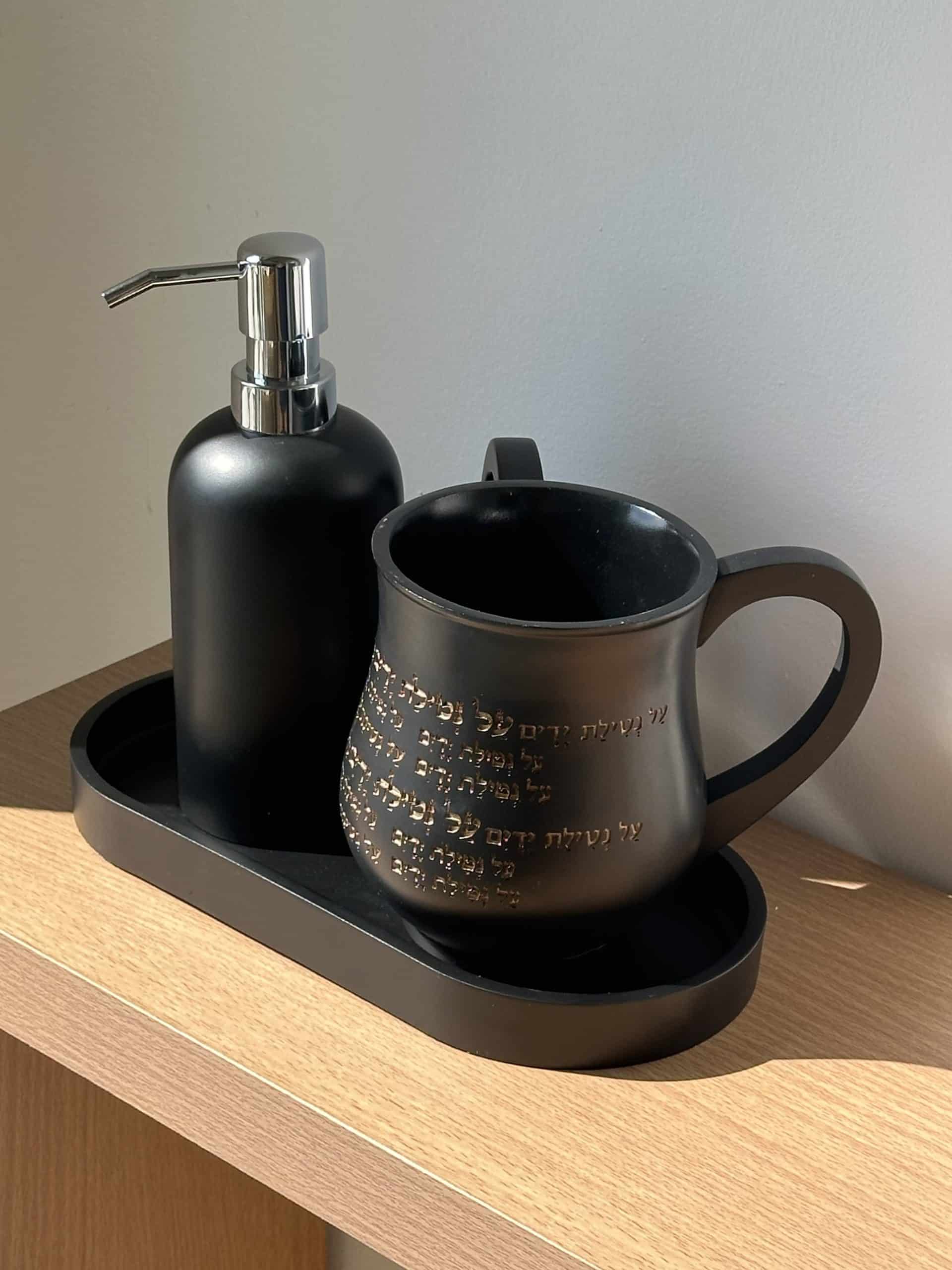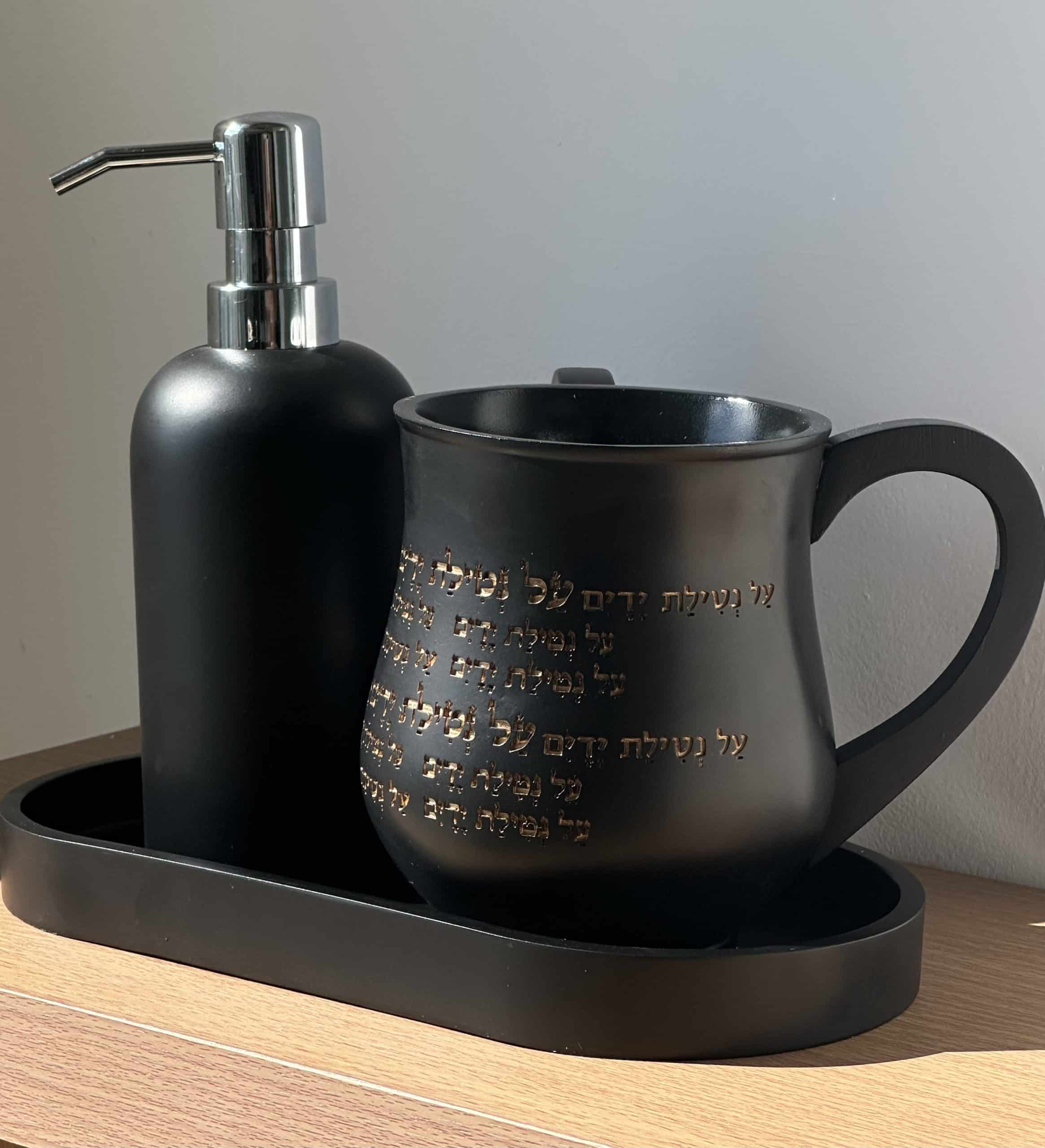 סט נטלה וסבוניה , גוון שחור , כיתוב זהב .