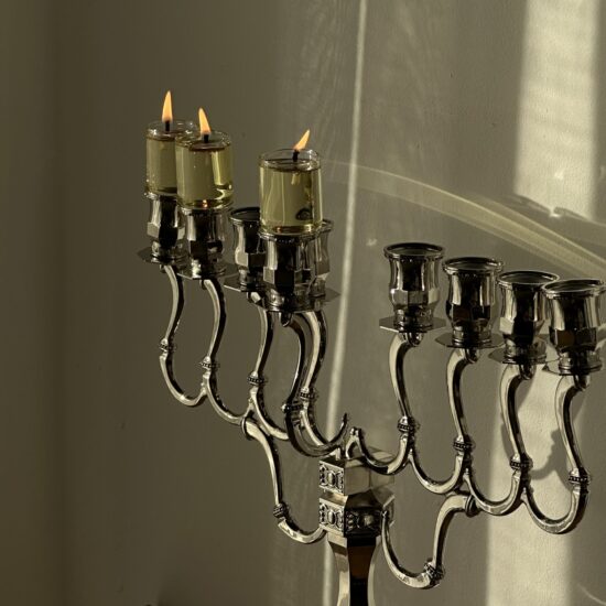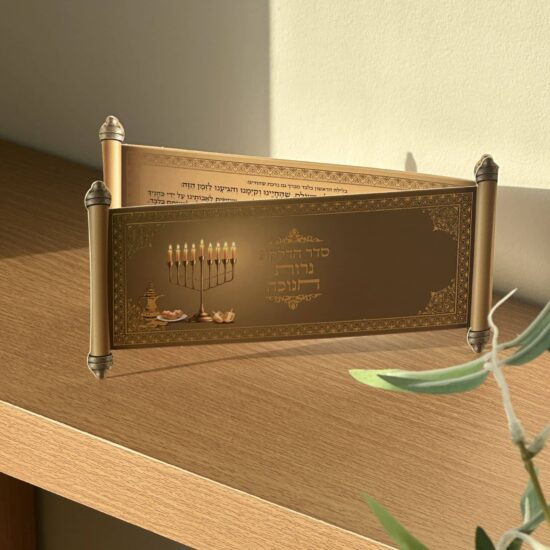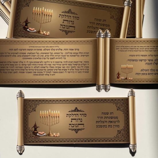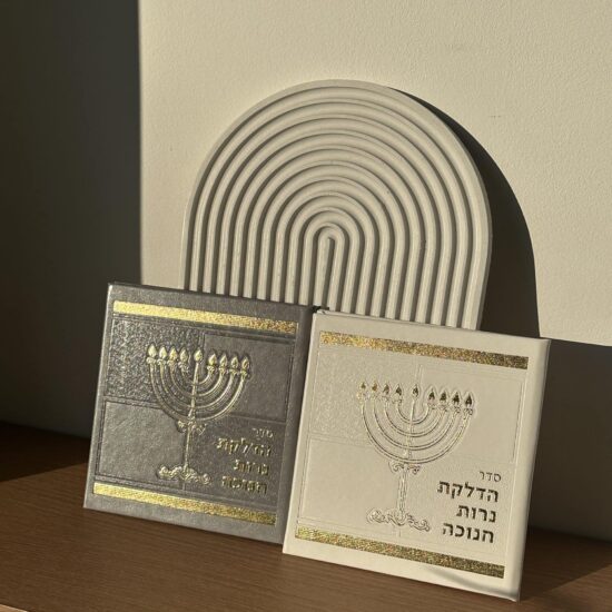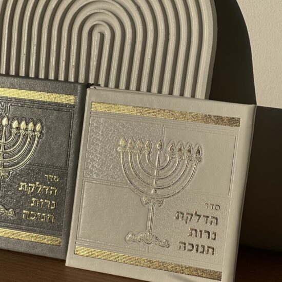 ספרון הדלקת נרות חנוכה – כריכה קשה , קיים בגוון אפור כסף ובגוון שמנת זהב , גובה 15 ס״מ , רוחב 15 ס״מ .