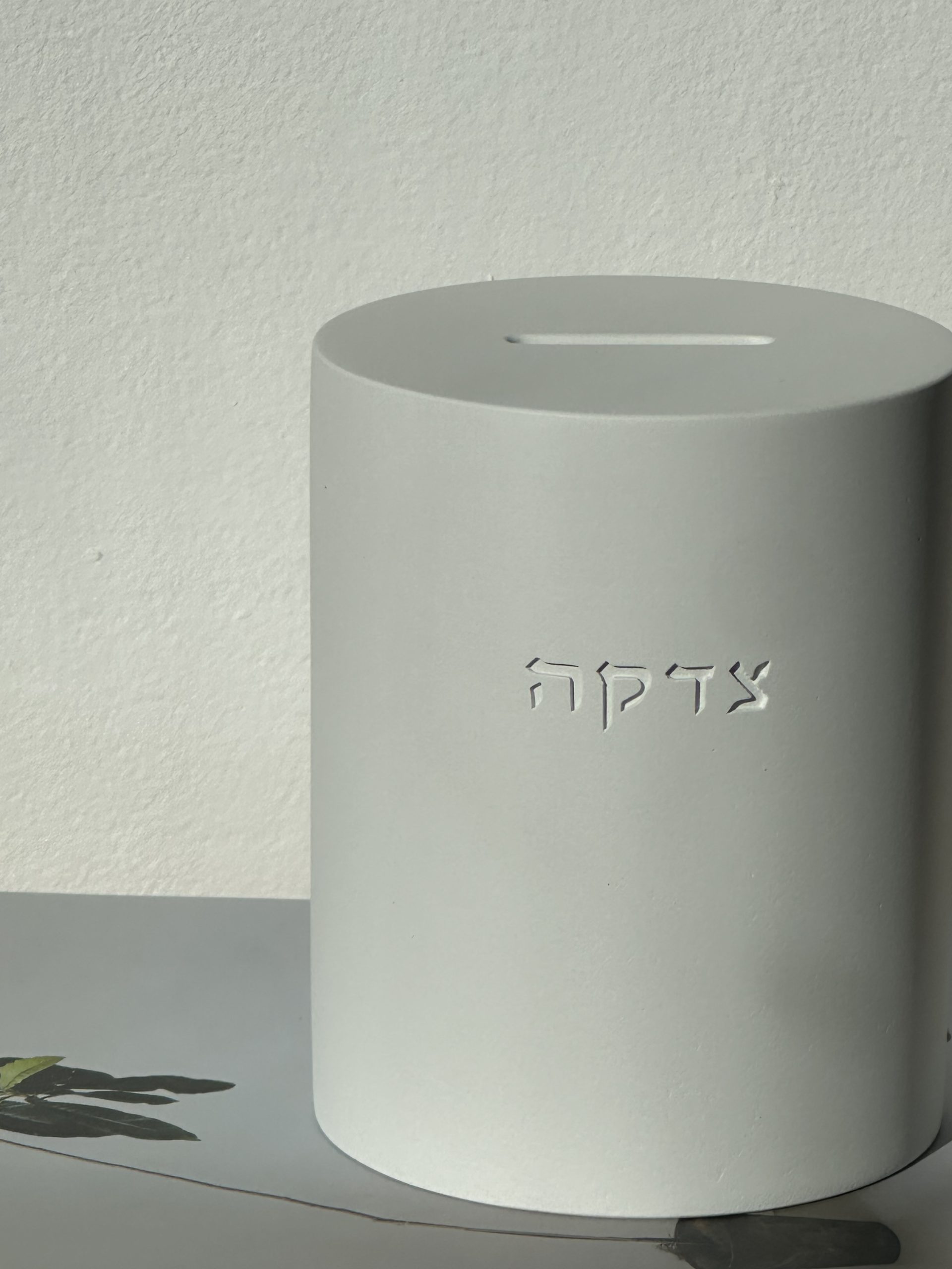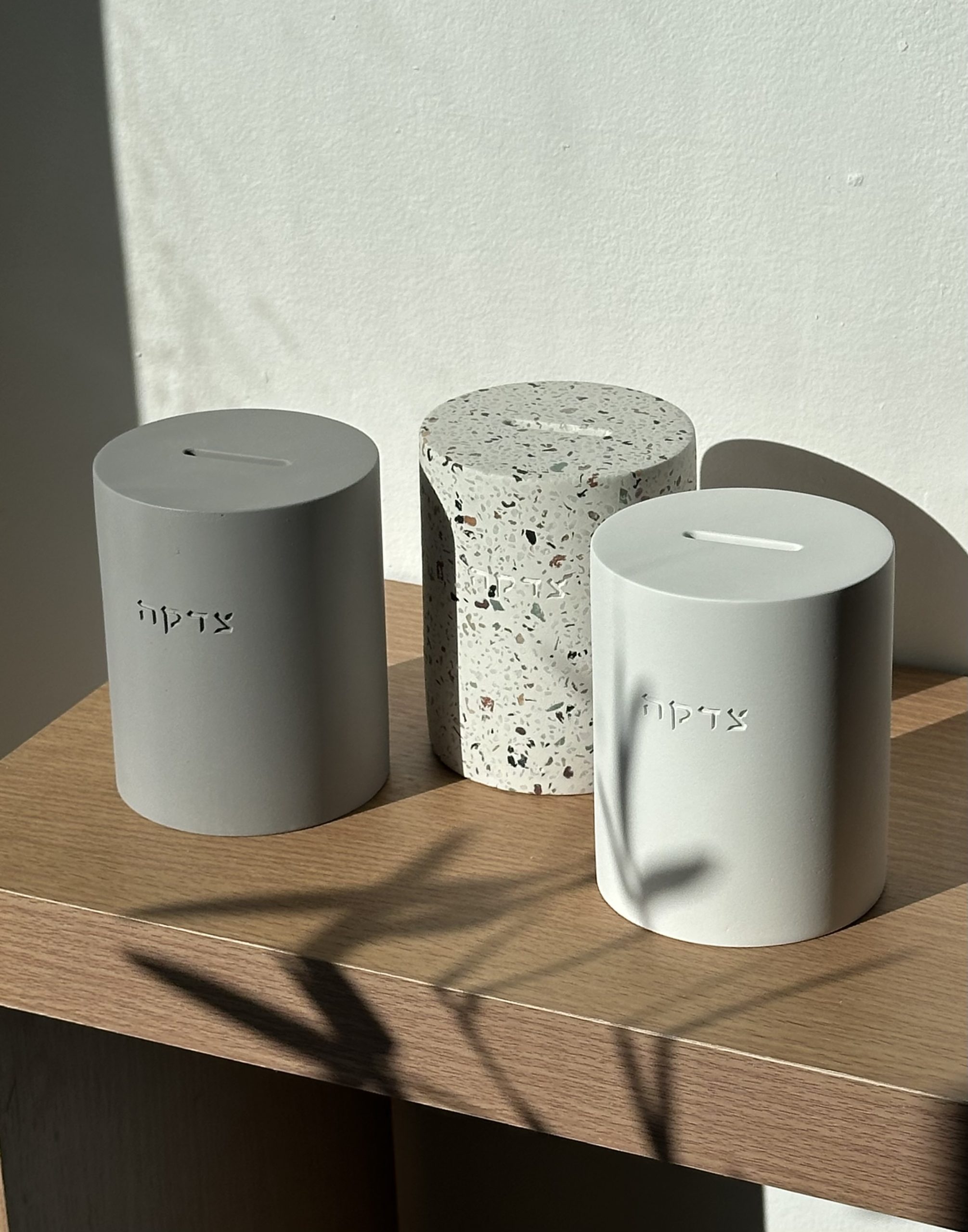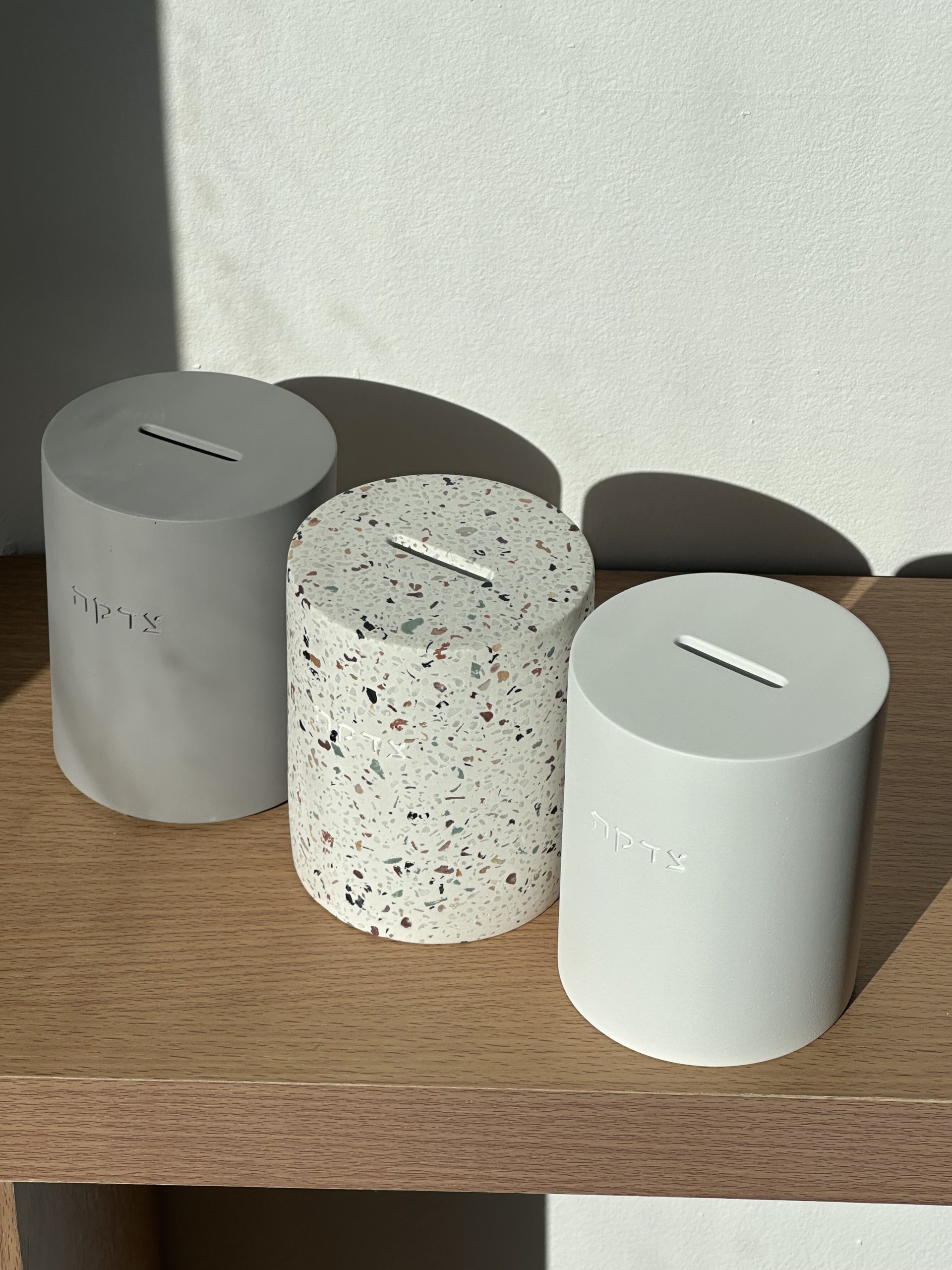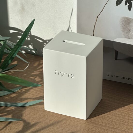 קופת צדקה יוקרתית מבטון , מגיעה בגוון לבן אפור וטרצו צבעוני .