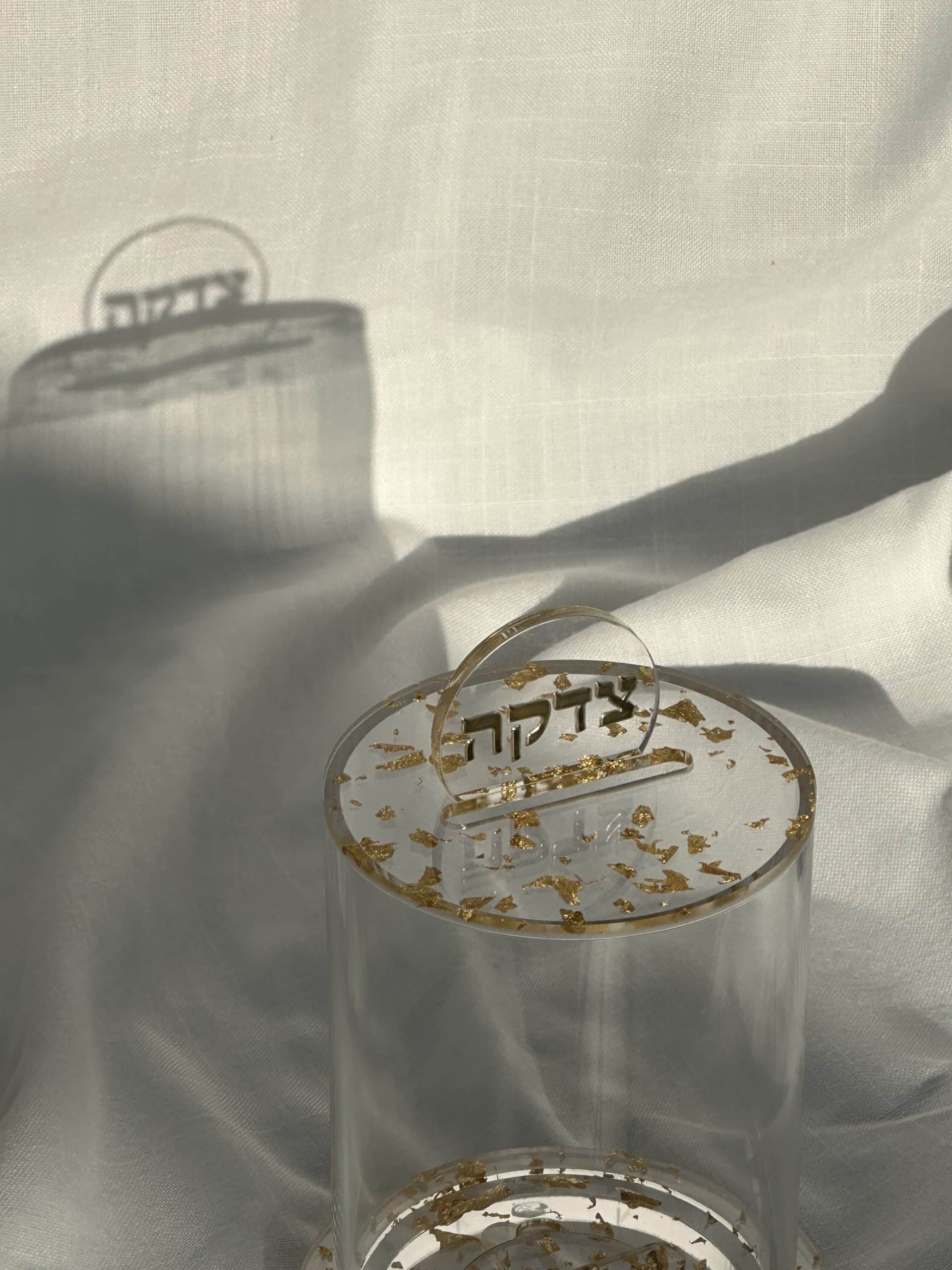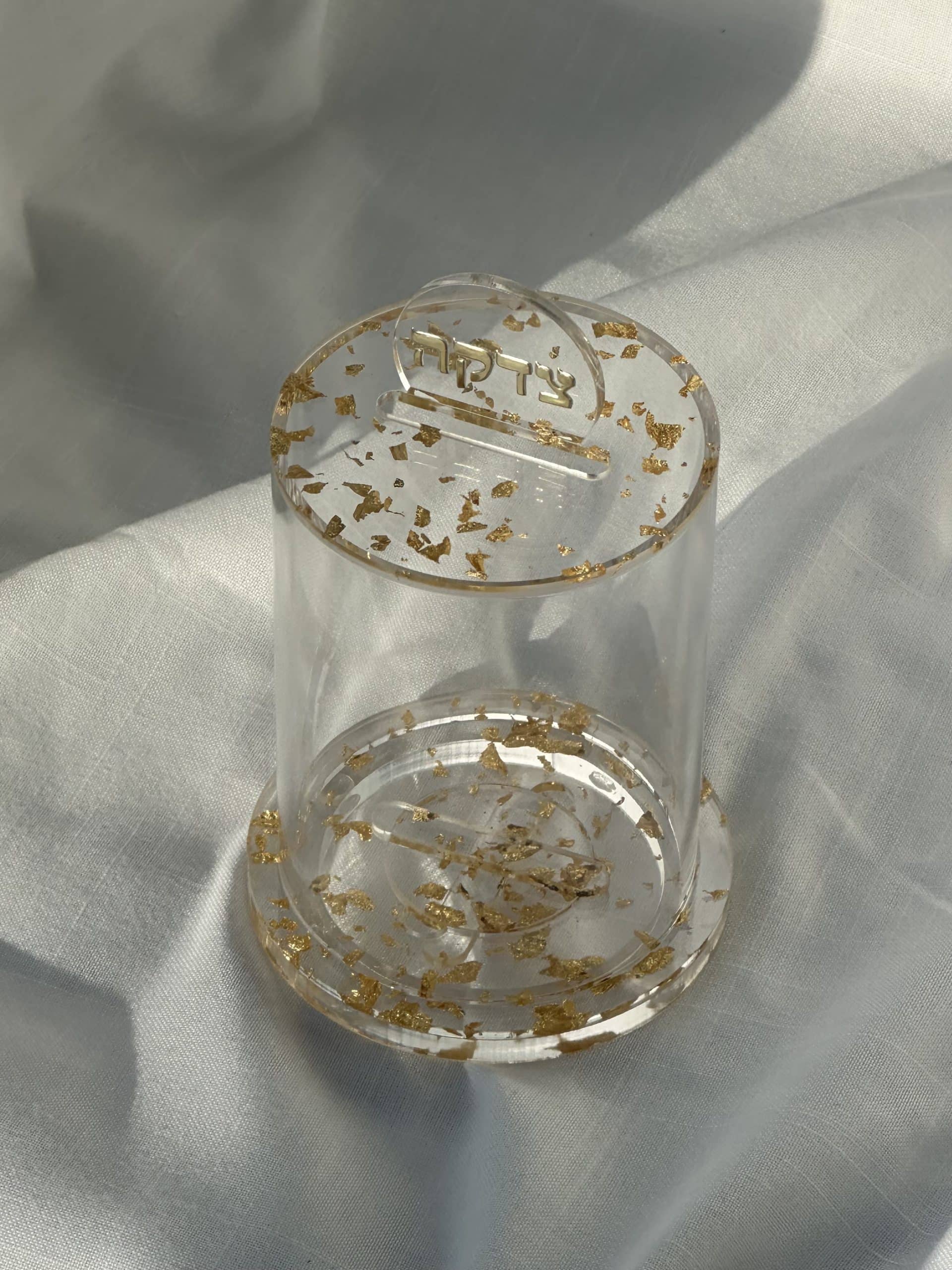 קופת צדקה פרספקס נצנצים זהב , גובה 16 ס”מ .