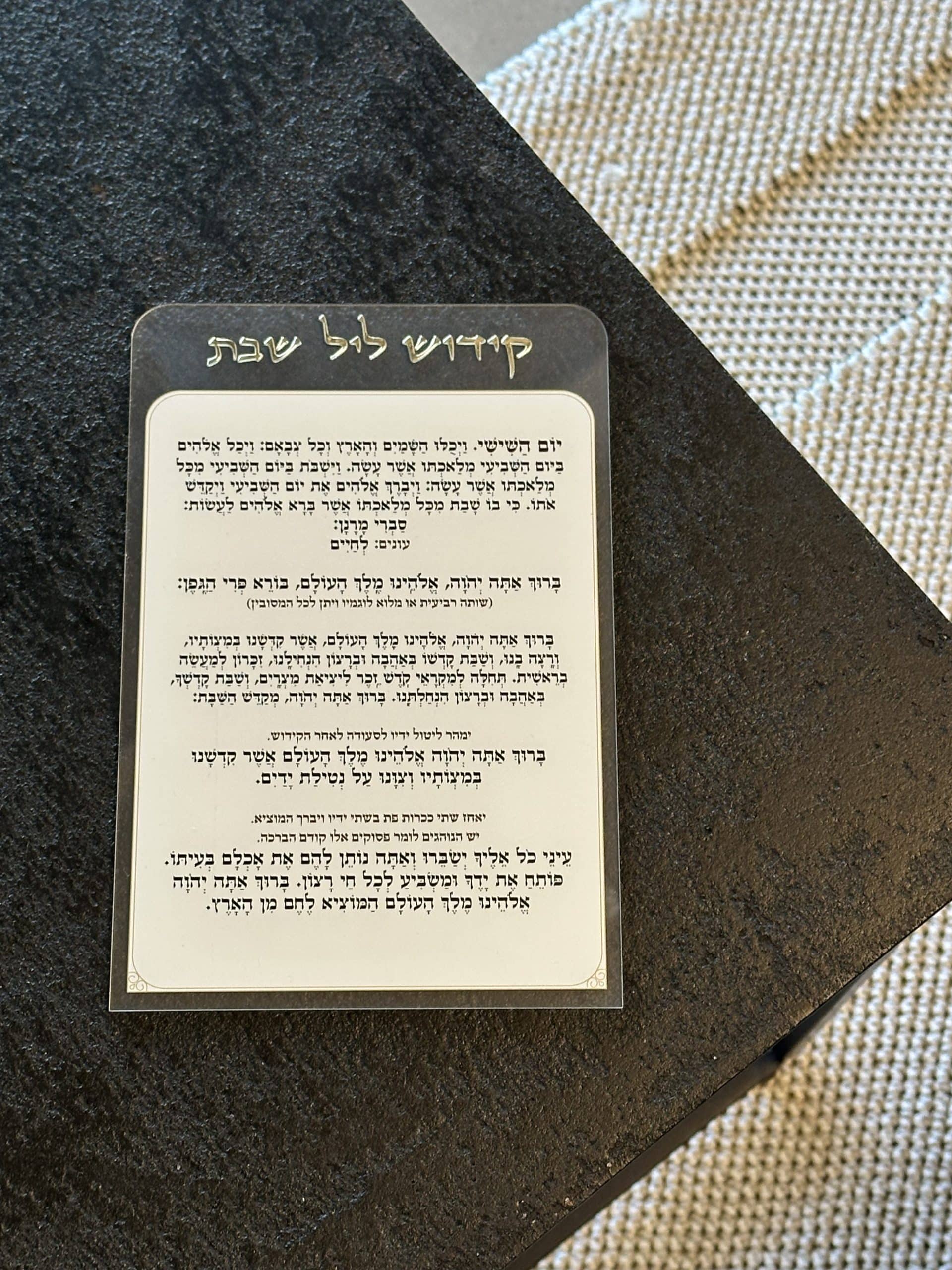 קידוש ליל שבת מפרספקס , נוסח עדות המזרח , אורך 22 ס״מ , רוחב 15 ס״מ .