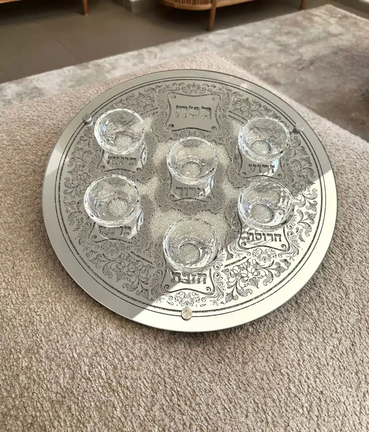 קערת פסח זכוכית מהודרת + 6 קעריות , 40 ס”מ .