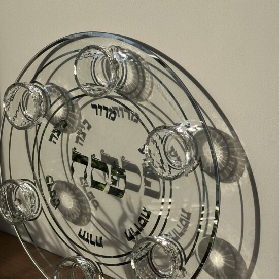 קערת פסח מזכוכית + 6 קעריות , מסגרת כסף , 40 ס”מ .