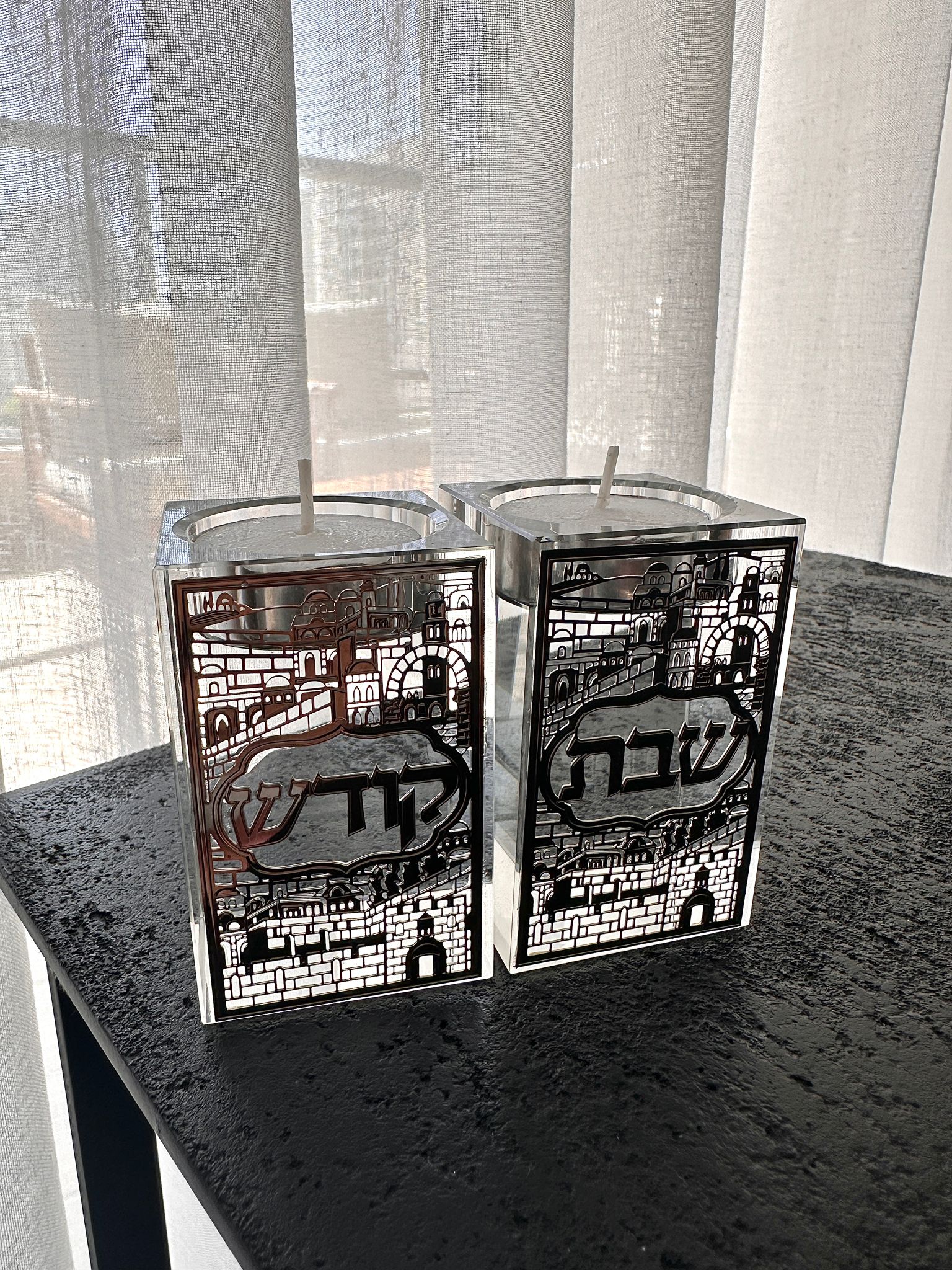 זוג פמוטים קריסטל מרובע עם פלקטה ” ירושלים “, גוון כסף , גובה 8 ס”מ .