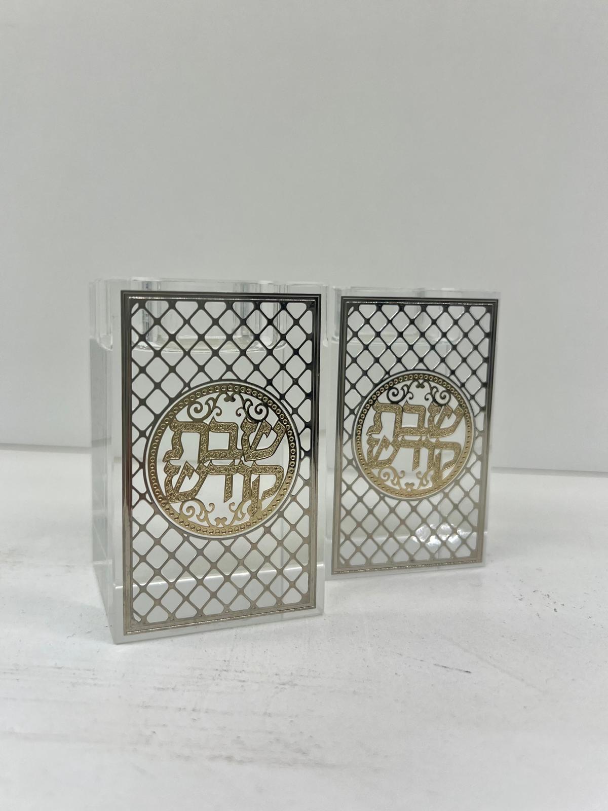 זוג פמוטים קריסטל מרובע עם פלקטה ” עיטור “, גוון רוז גולד , גובה 8 ס”מ .