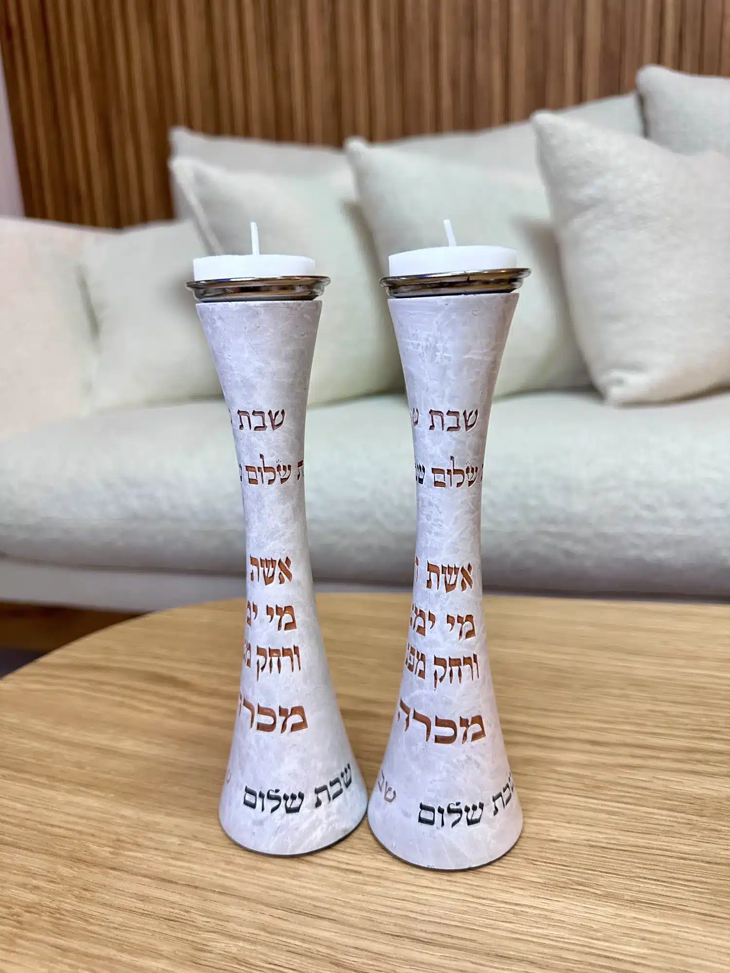 זוג פמוטים ” שבת שלום ” פולימר , גוון לבן , גובה 19 ס”מ .