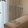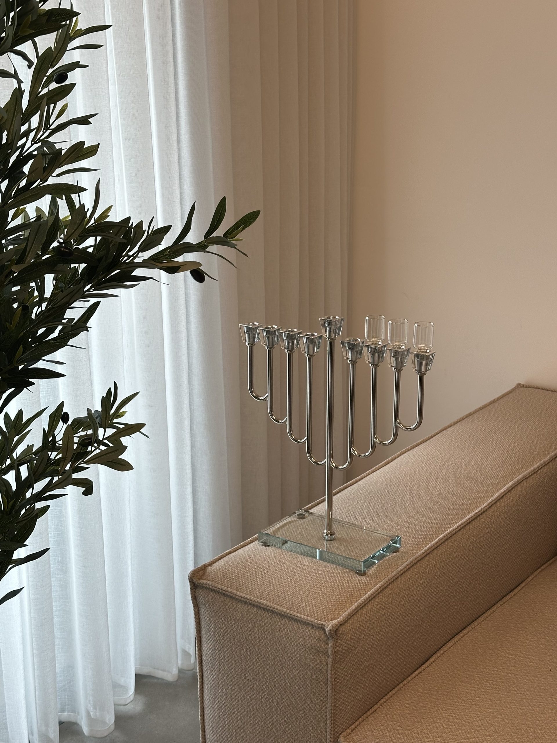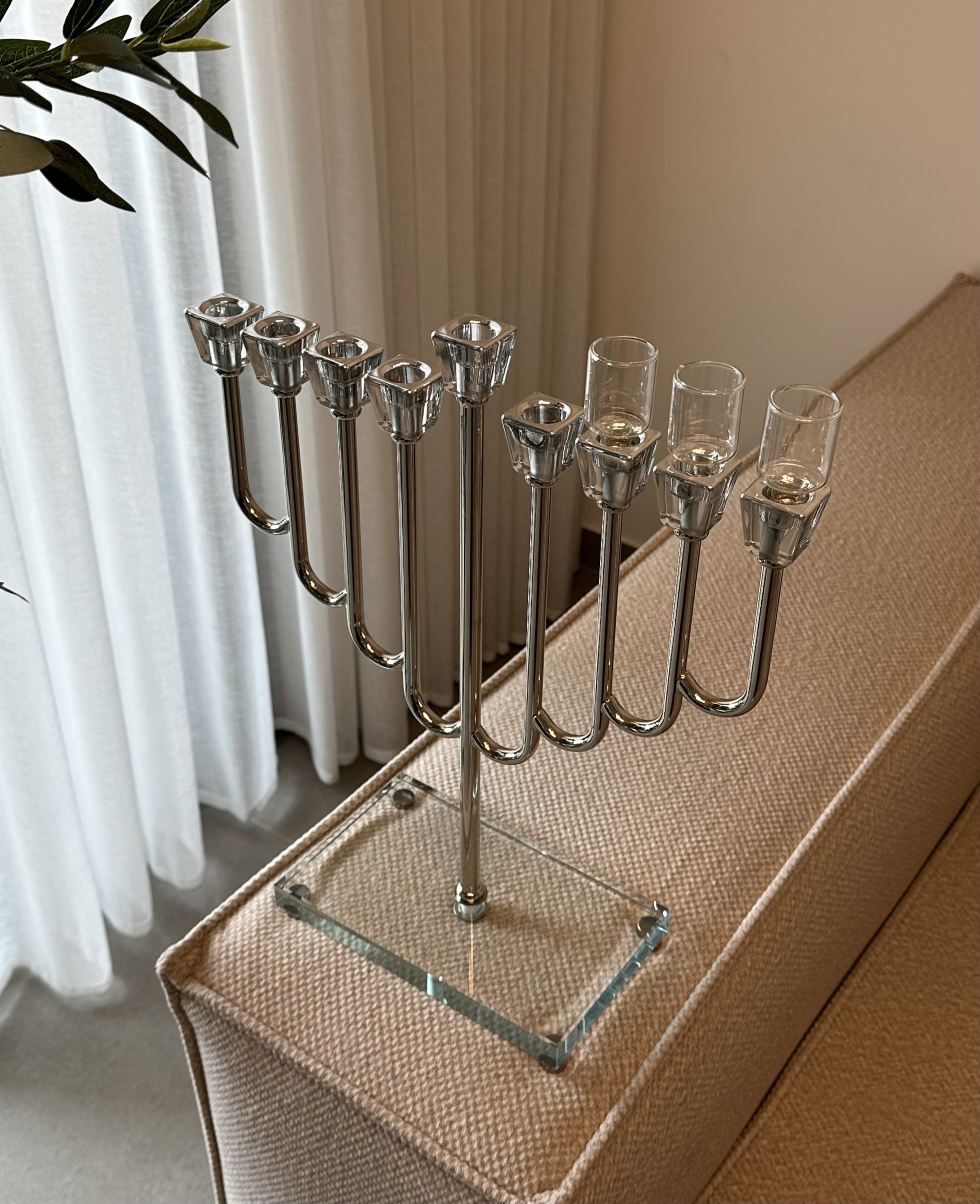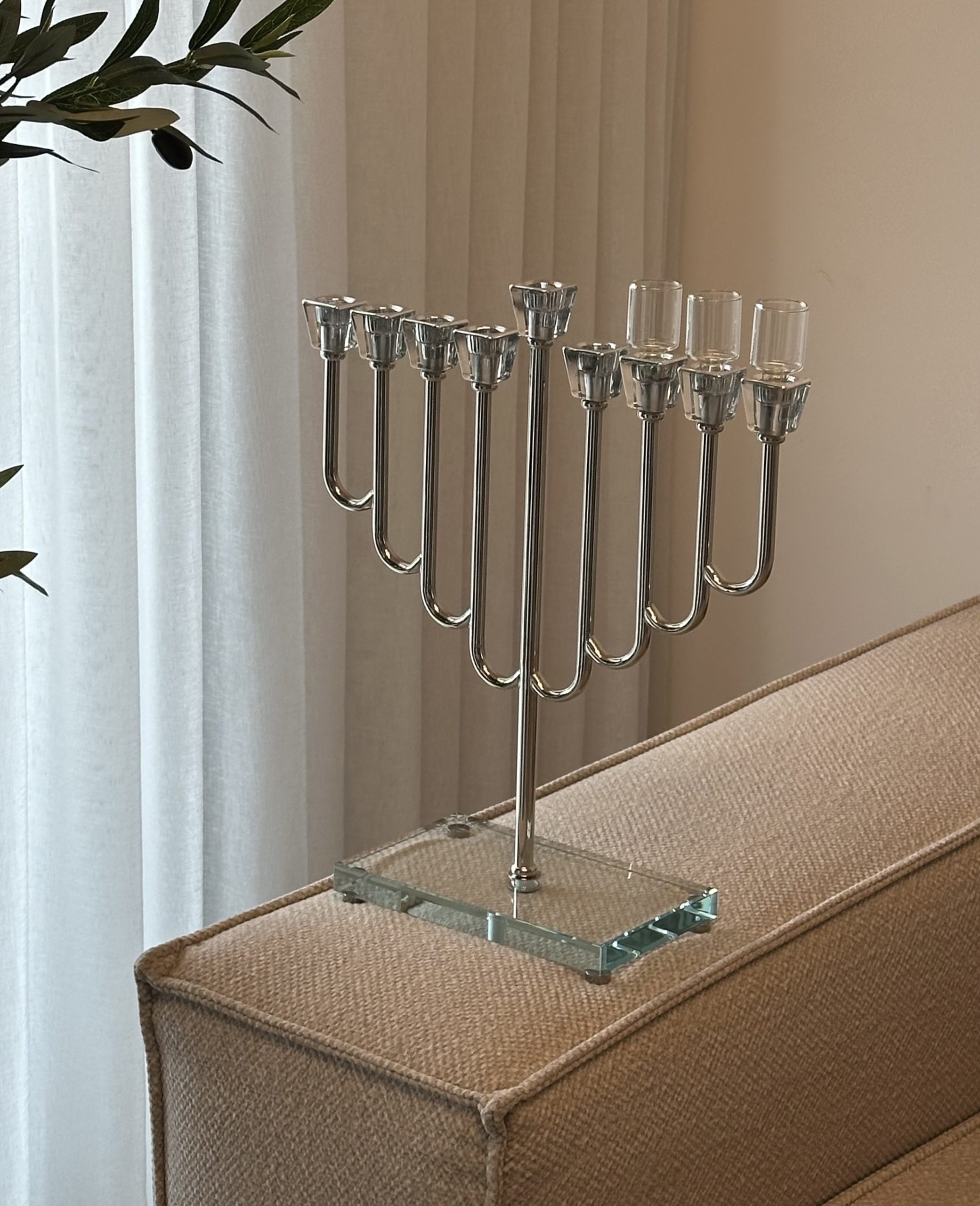 חנוכייה מהודרת דגם יהלום , קנים ותחתית החנוכיה מזכוכית , גוון כסף ( ניקל ) , גובה 36 ס”מ.