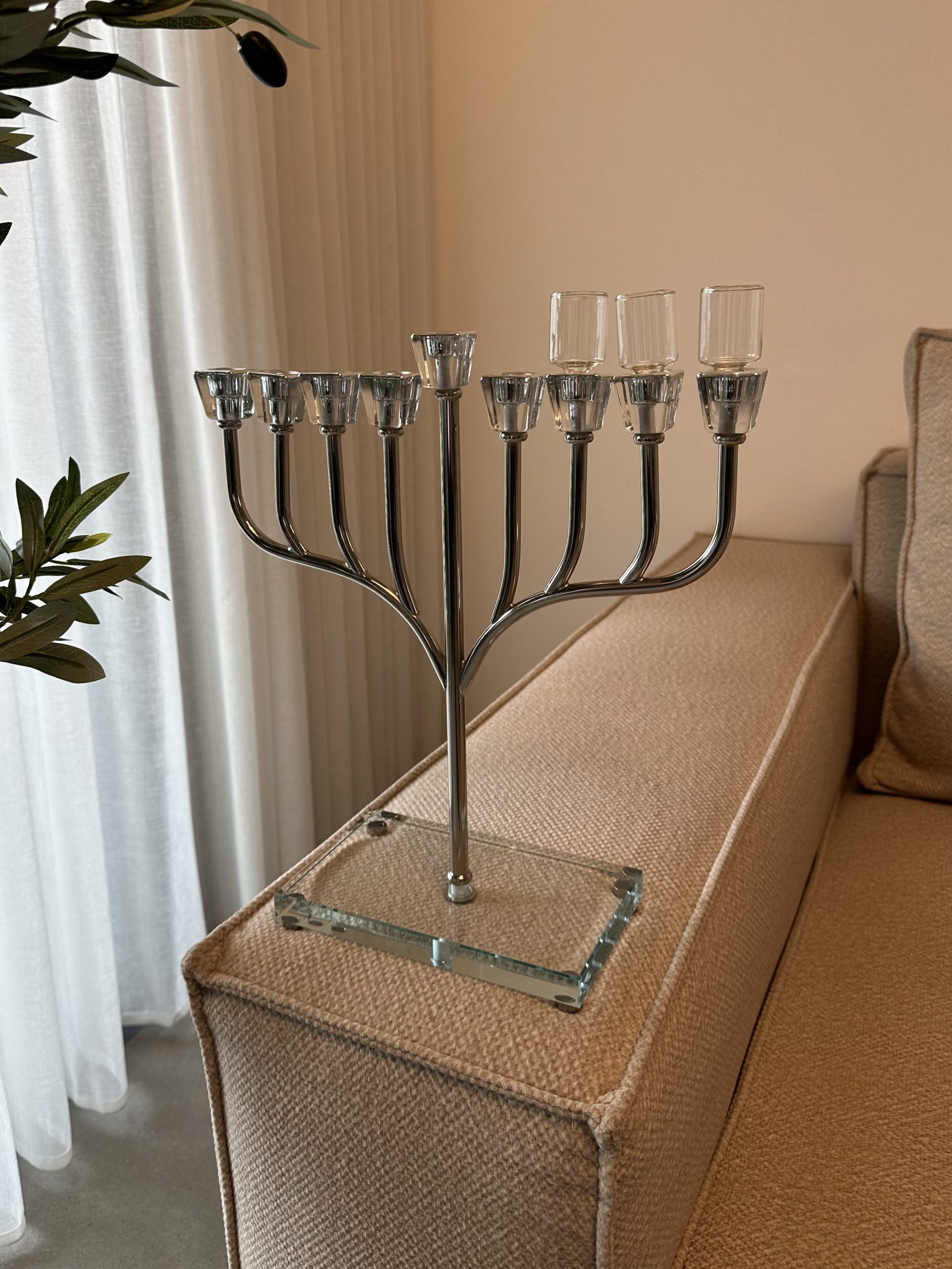 חנוכייה מהודרת דגם ספיר , קנים ותחתית החנוכיה מזכוכית , גוון כסף ( ניקל ) , גובה 37 ס”מ.