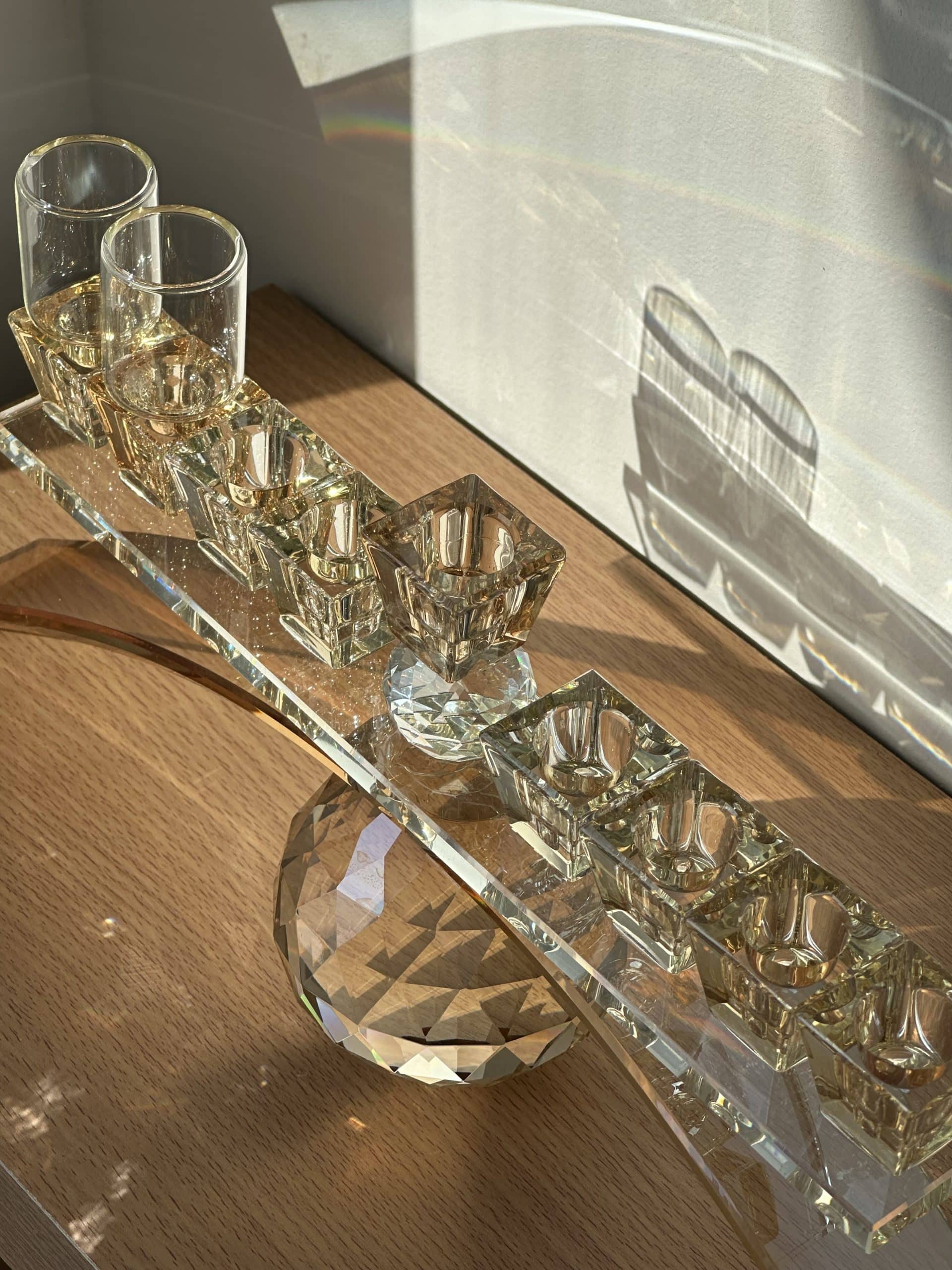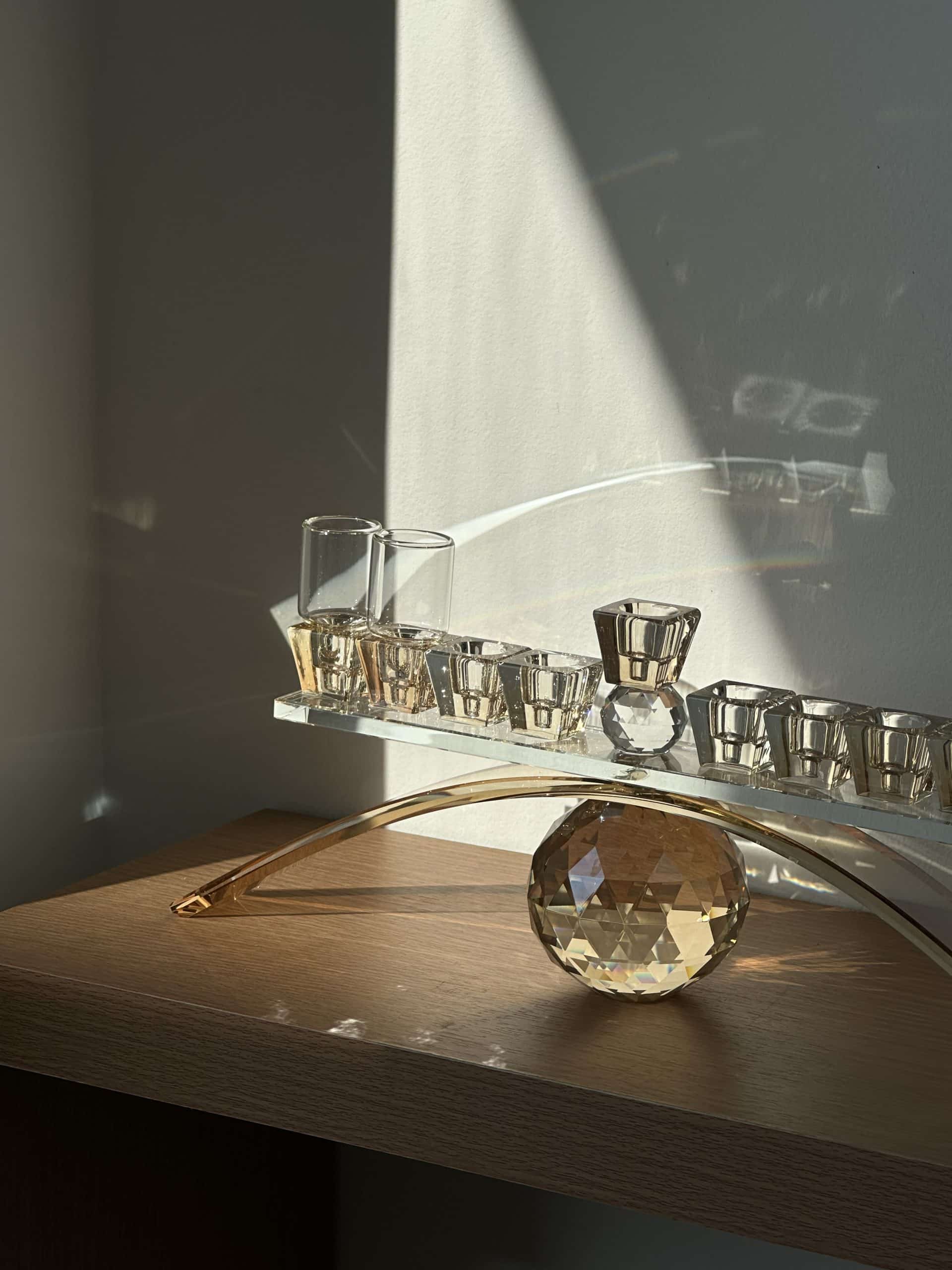חנוכיית קריסטל מהודרת דגם כדור , גוון רוז גולד , אורך 14 ס״מ , רוחב 33 ס״מ .