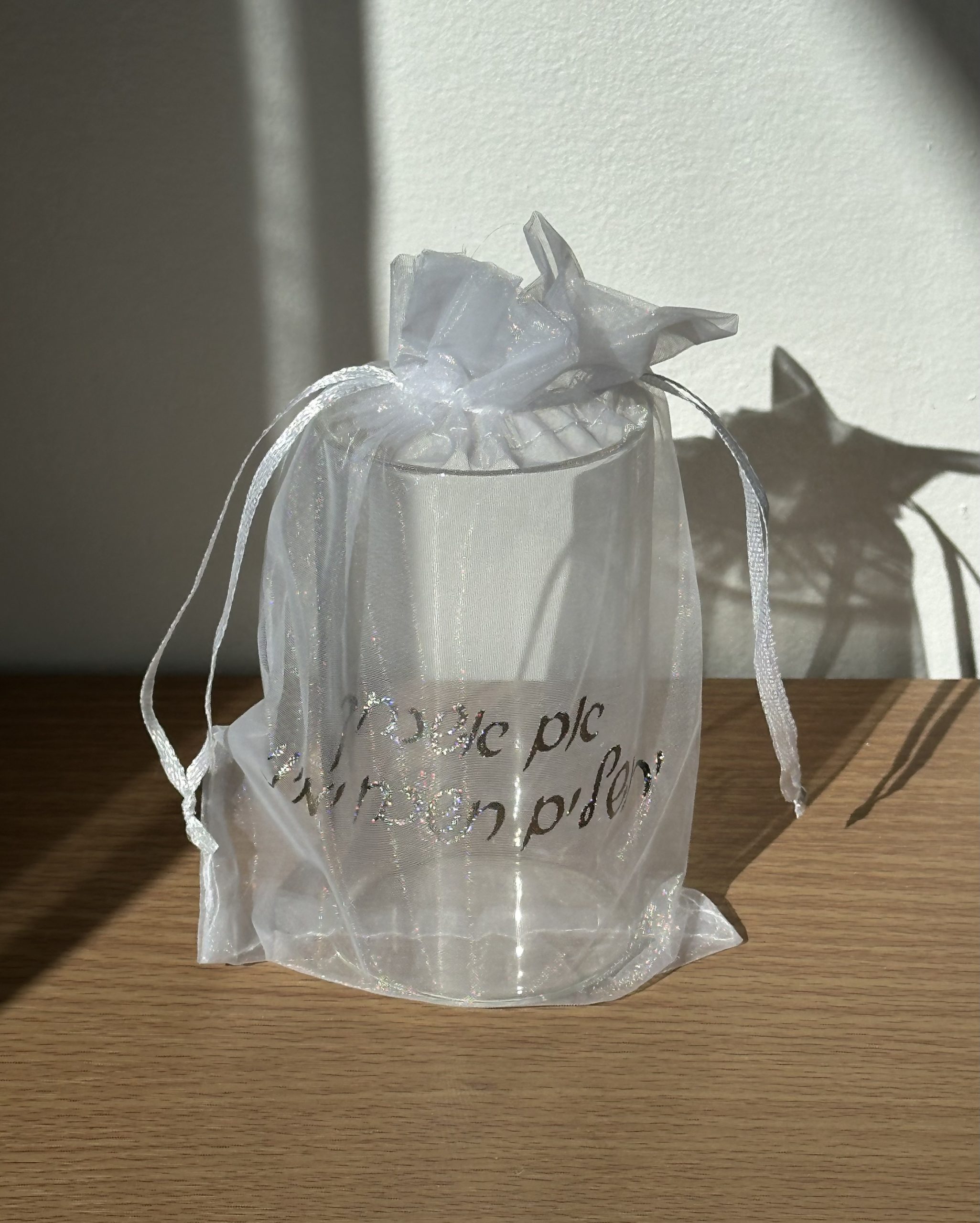 כוס חתנים ״ אם אשכחך ירושלים ״ מזכוכית , גובה 10 ס״מ .