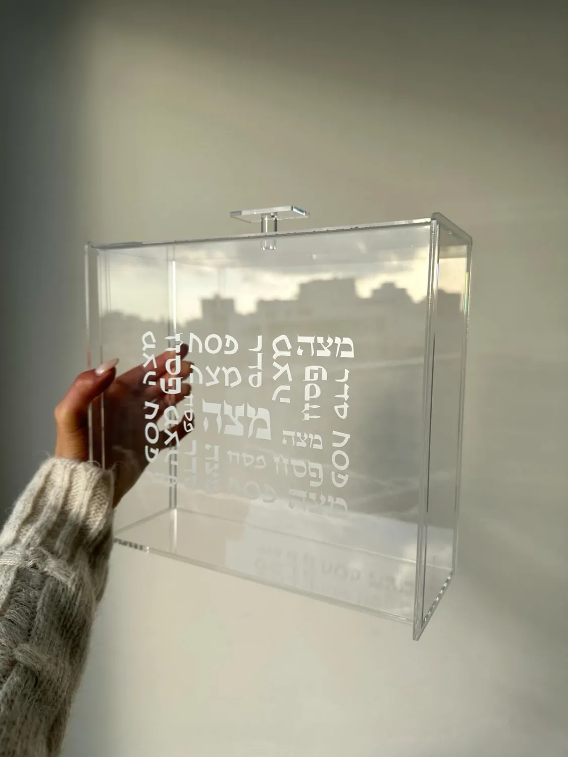 כלי למצה מפרספקס עם הדפסה , גובה 23 ס”מ רוחב 21 ס”מ .