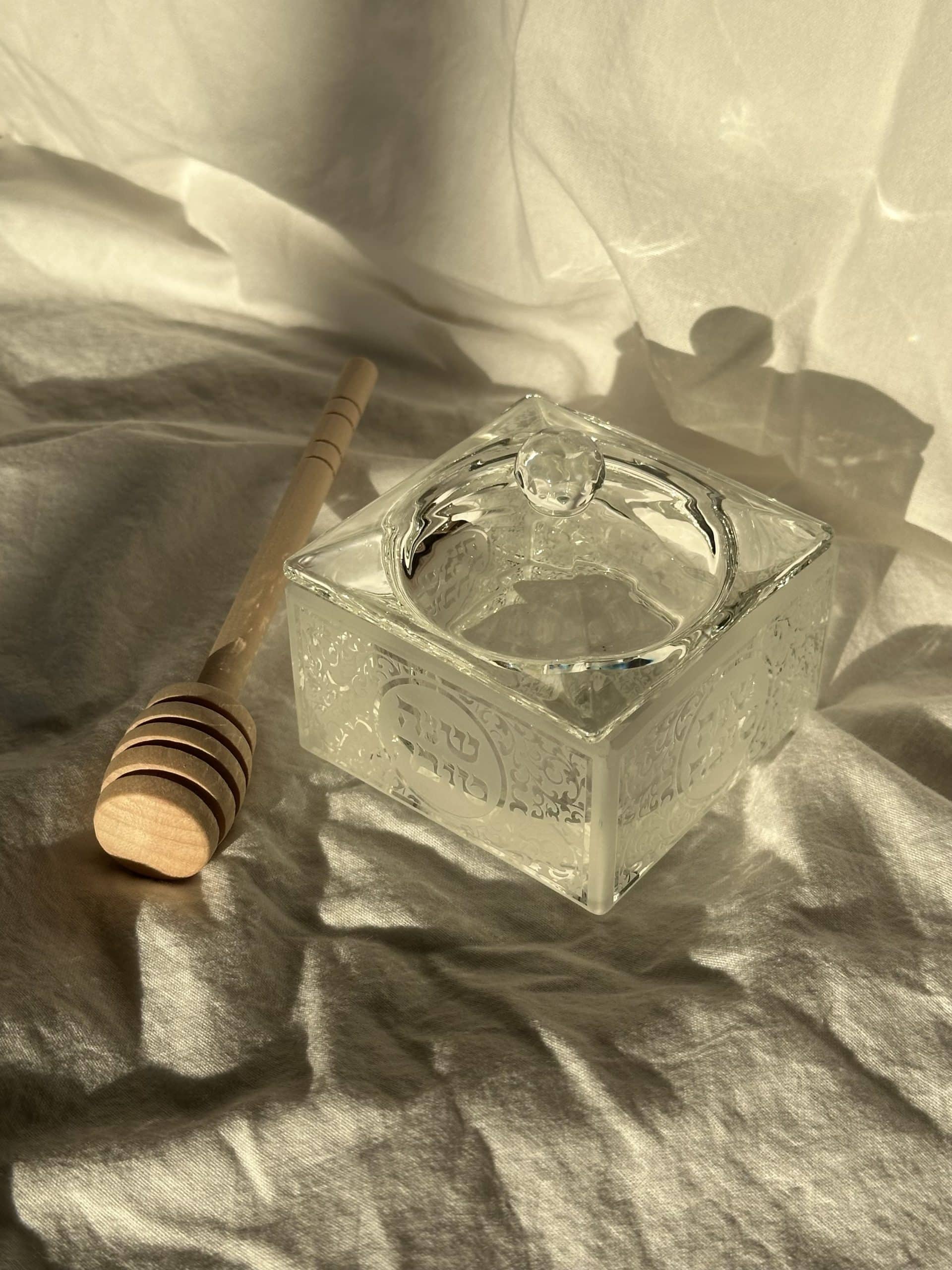 כלי מהודר לדבש מקריסטל , גוון שקוף , רוחב 7 ס״מ , עומק 7 ס״מ .