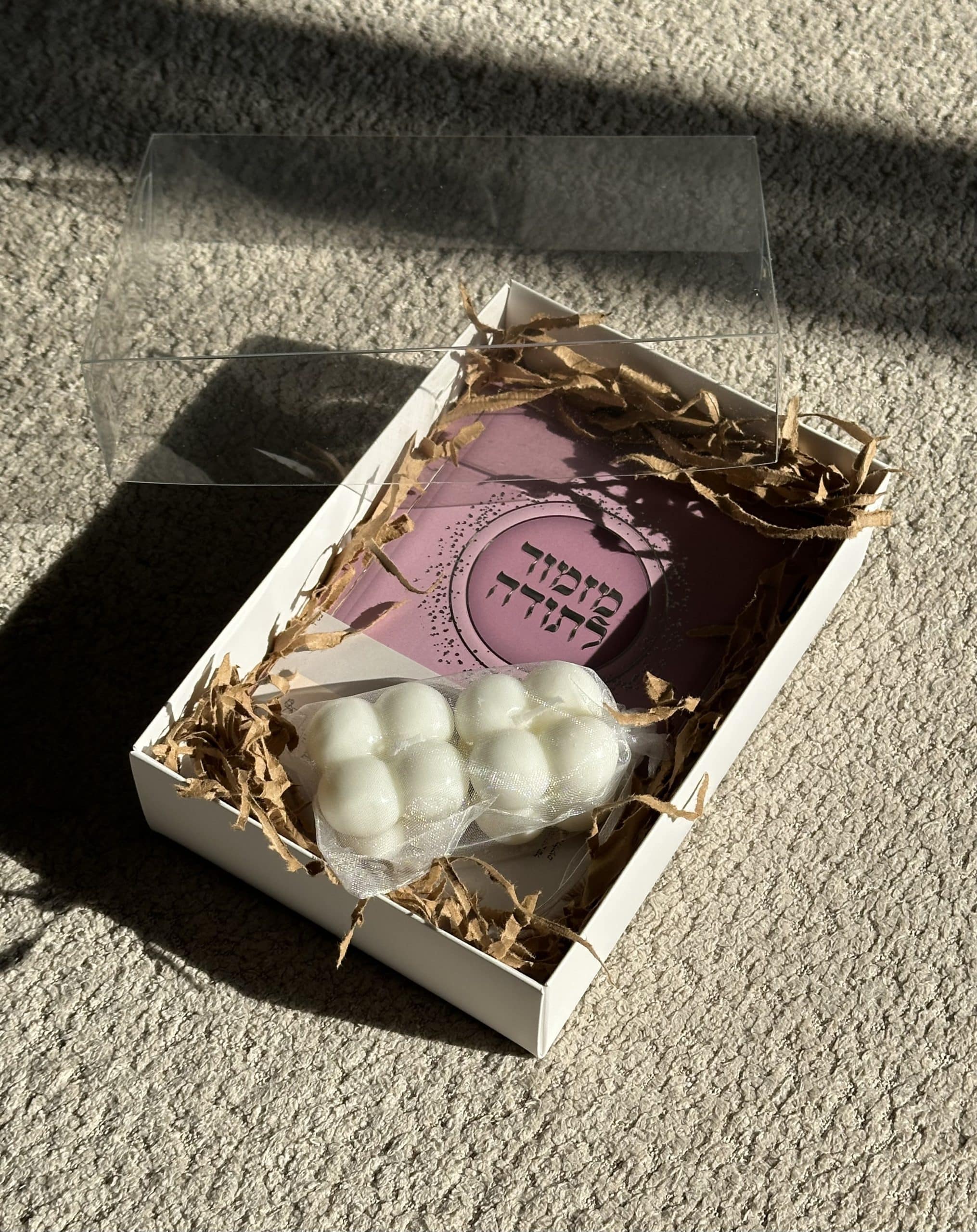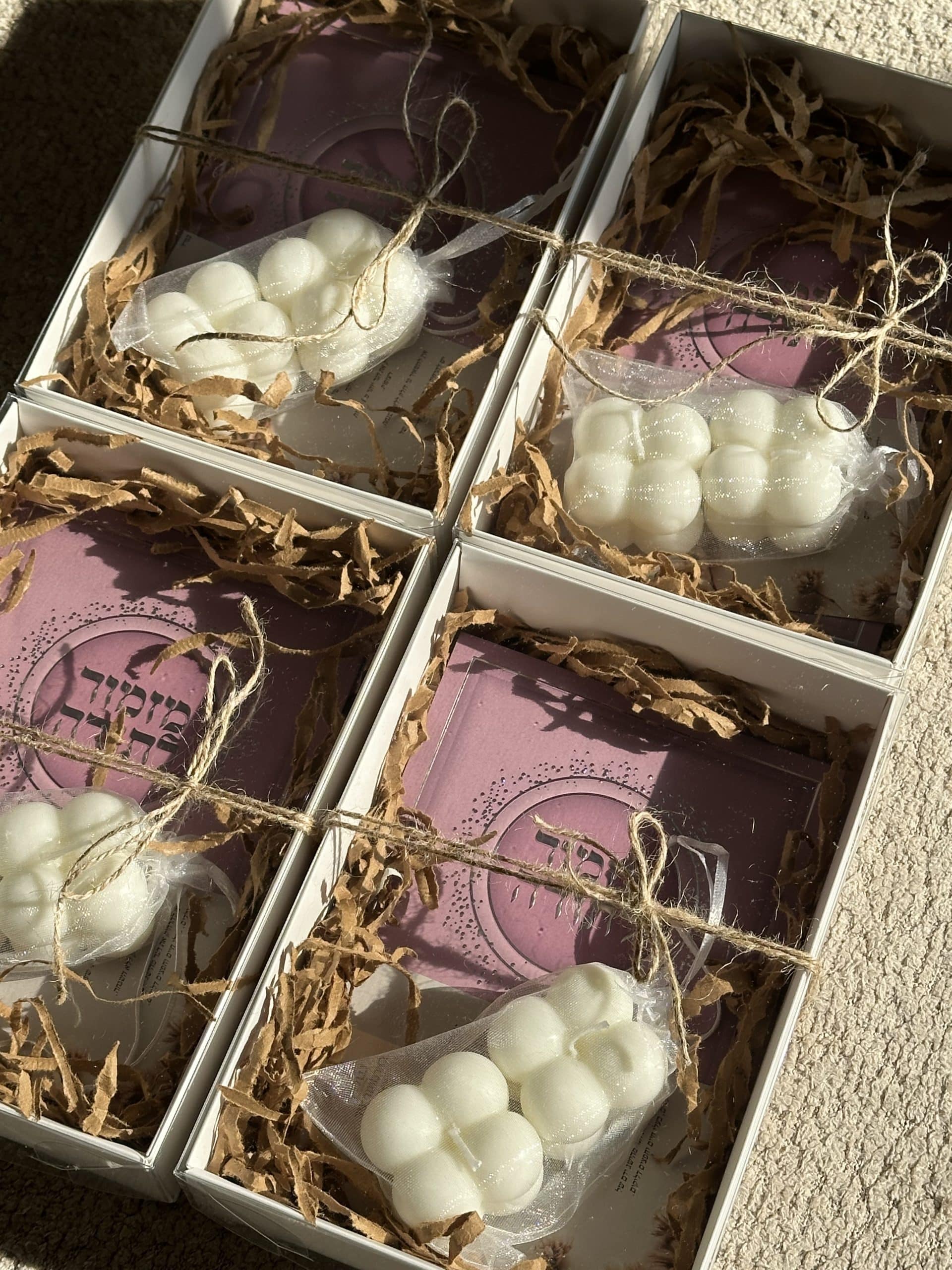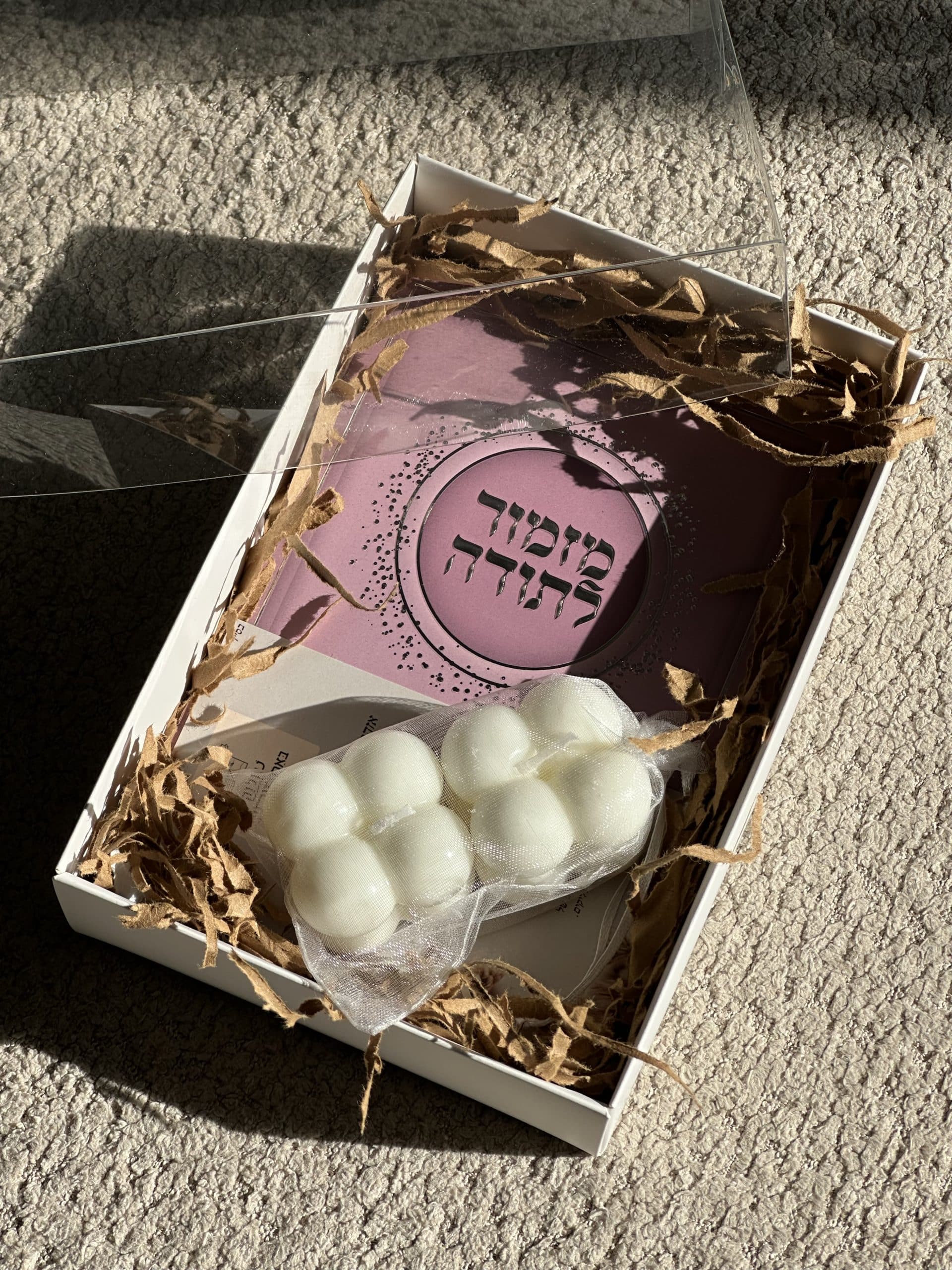 ברכון מזמור תודה , גוון ורוד או לבן , אורך 17 ס”מ , רוחב 12 ס”מ. וזוג נרות באבלס קטנים ריחניים בגוון לבן. גובה: 4 ס״מ , רוחב: 4 ס״מ .