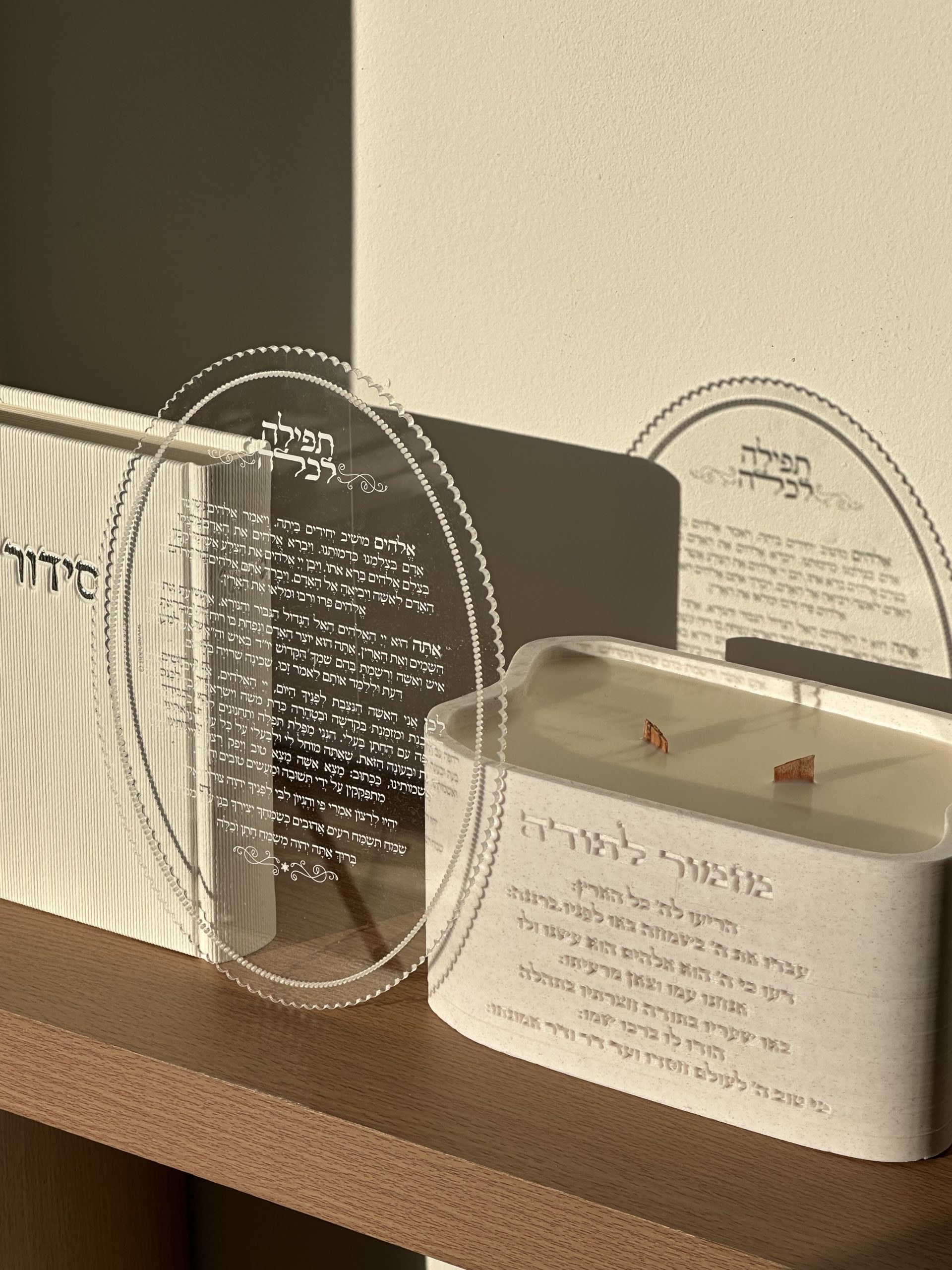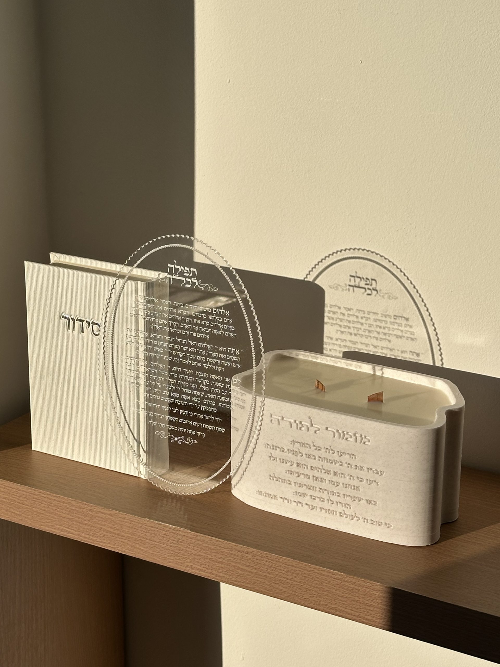 נר מזמור לתודה המכיל קילו שעוות סויה , 20 ס״מ רוחב. 12 ס״מ אורך. גובה 11 ס״מ .