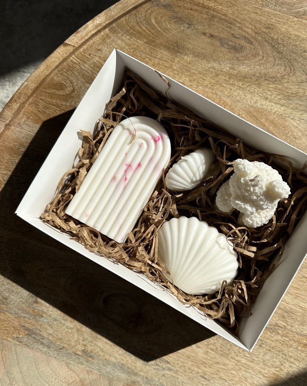 - נר צדפה ריחני קטן בגוון לבן , גובה 5 ס״מ , רוחב 7 ס״מ .