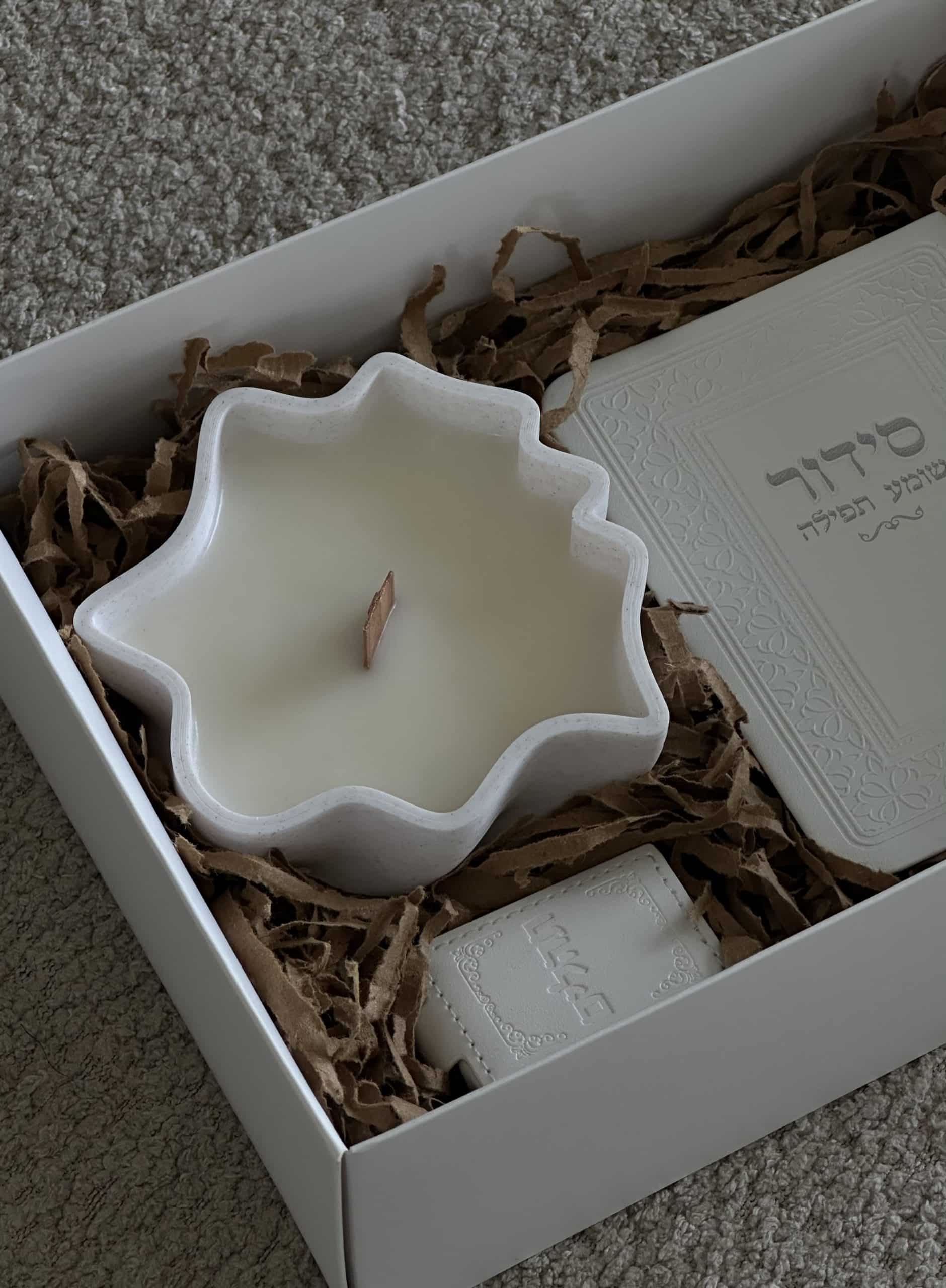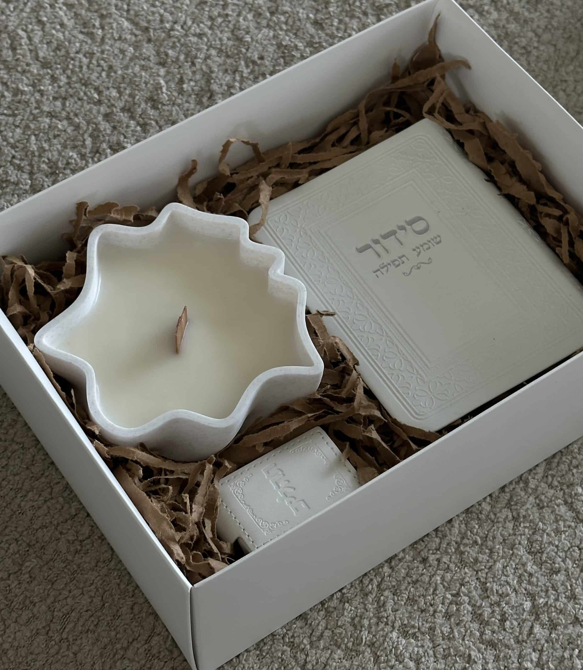 המארז כולל סידור כיס ״שומע תפילה״ בגוון לבן. גובה: 12 ס״מ רוחב: 9 ס״מ. נר מעוצב קטן , קוטר 11 ס״מ , גובה 6.5 ס״מ. ובנוסף מחזיק/שרשרת תהילים לבן .