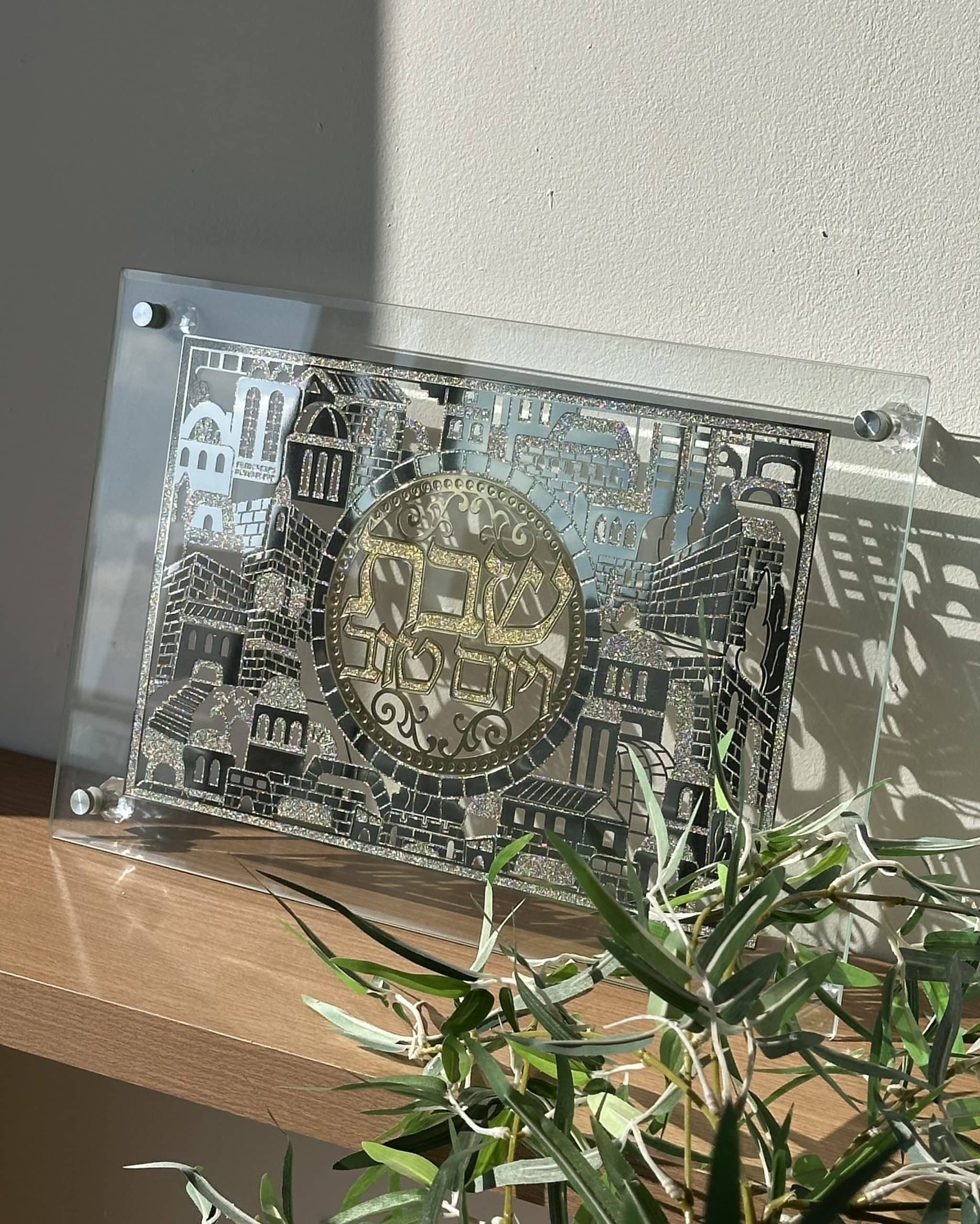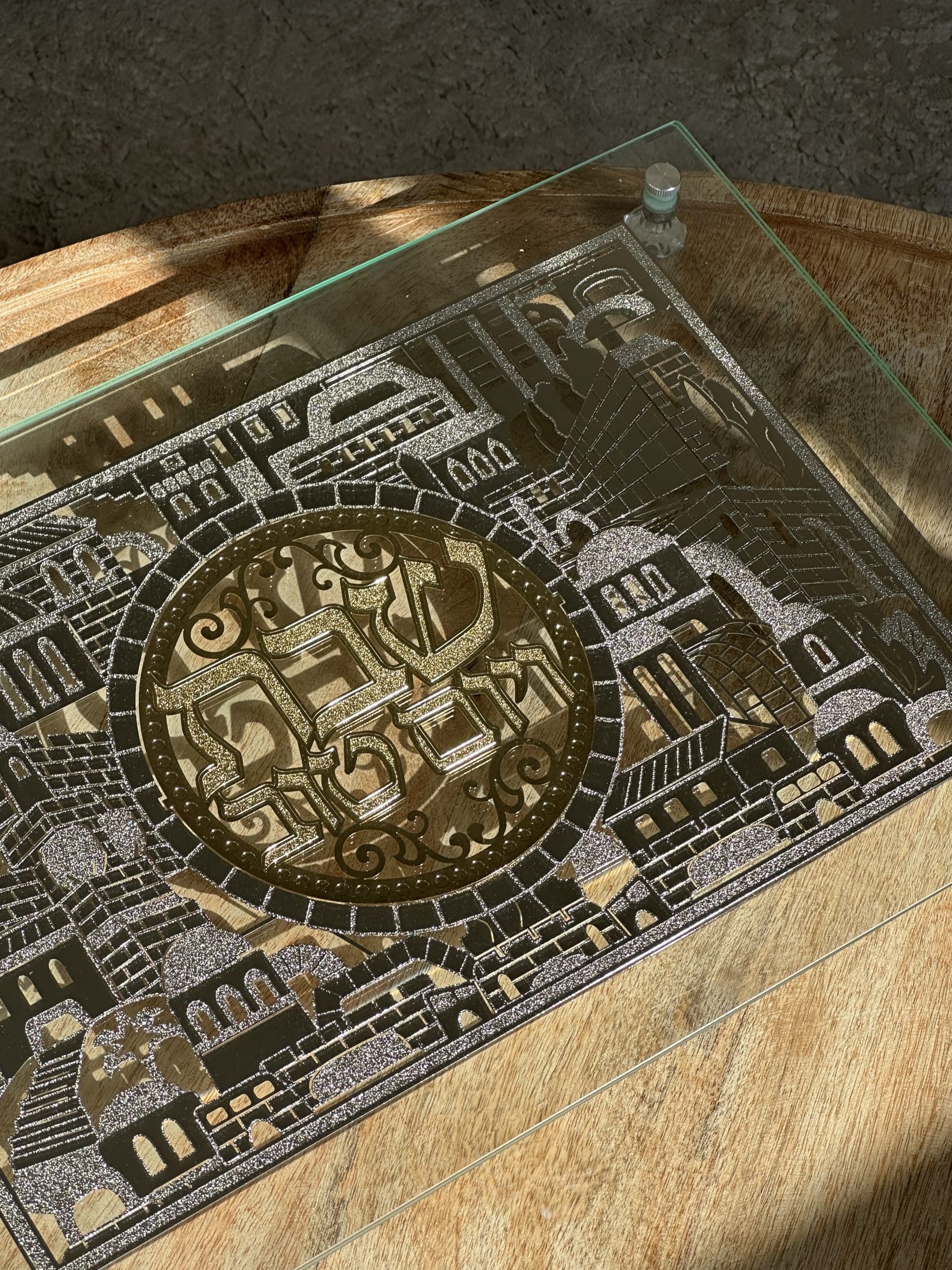 מגש חלה מהודר מזכוכית “ירושלים” , אורך 30 ס”מ , רוחב 45 ס”מ .