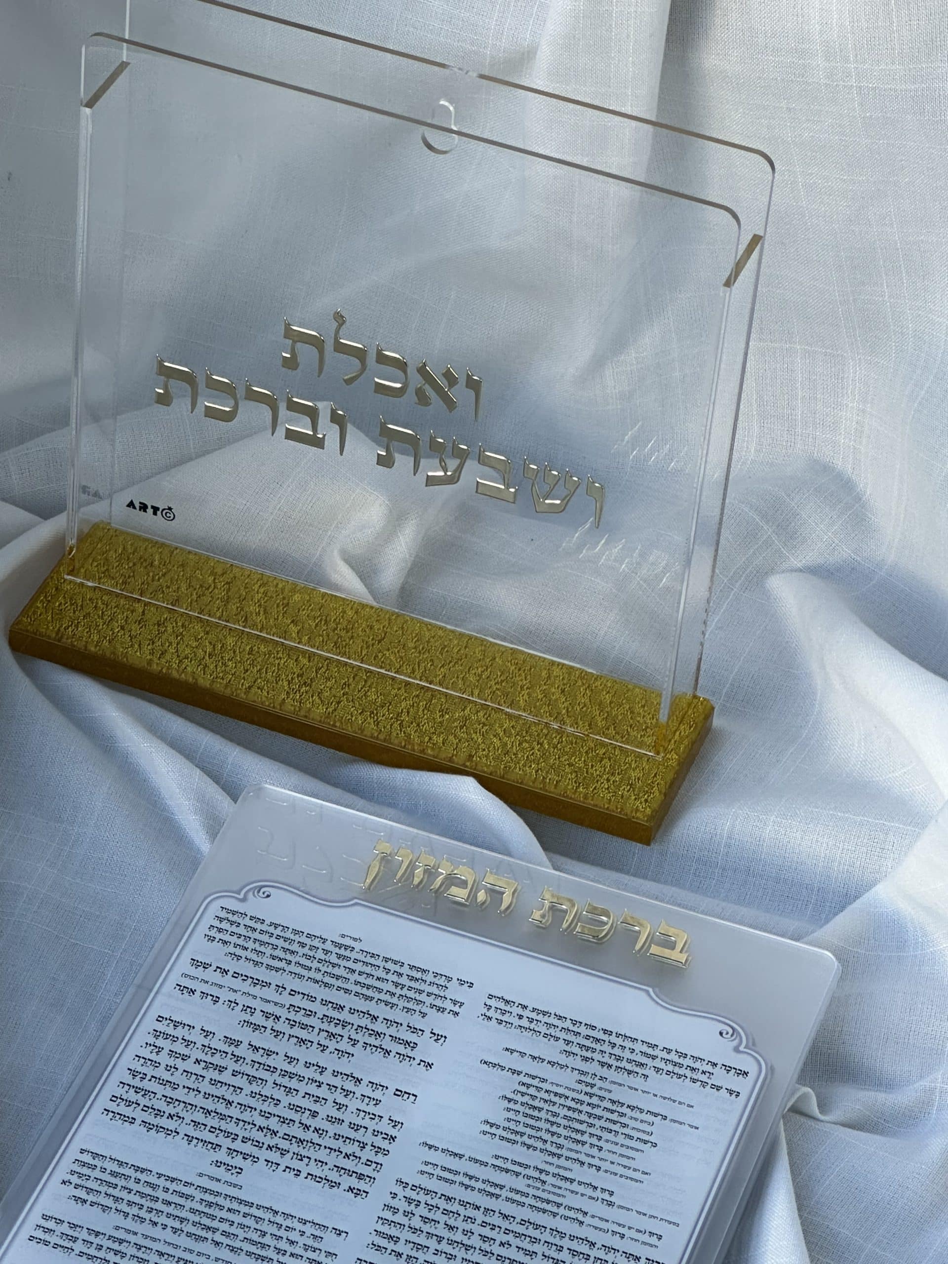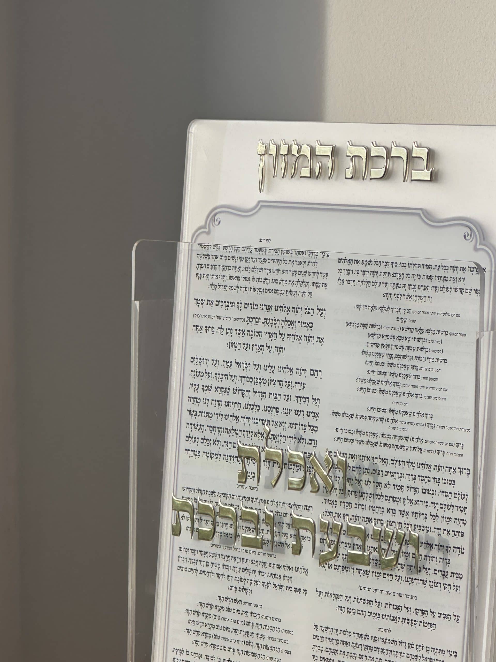 מעמד פרספקס + 6 יחידות ” ברכת המזון ” גוון זהב , אורך 22 ס”מ , רוחב 17 ס”מ .