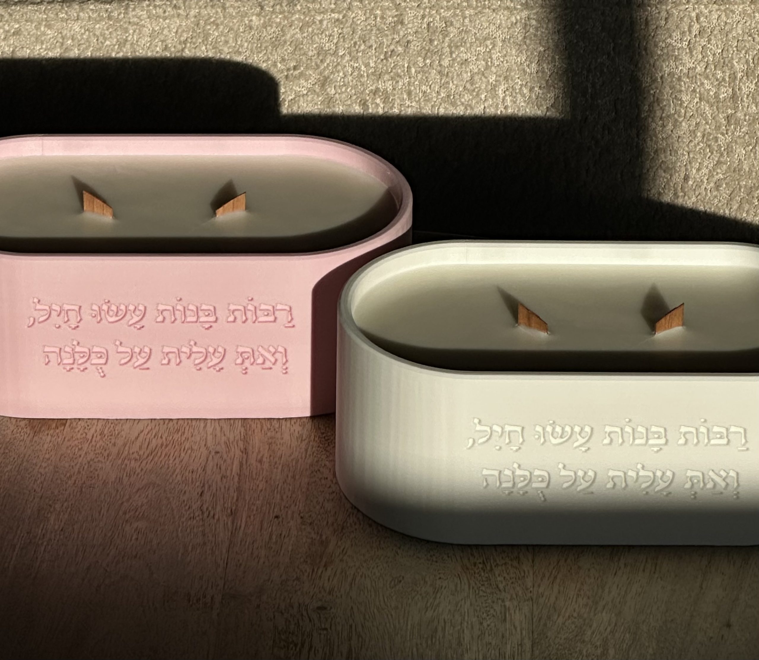 נר ריחני ומיוחד עם חריטה ״ רַבּ֣וֹת בָּ֭נוֹת עָ֣שׂוּ חָ֑יִל וְ֝אַ֗תְּ עָלִ֥ית עַל־כֻּלָּֽנָה ״