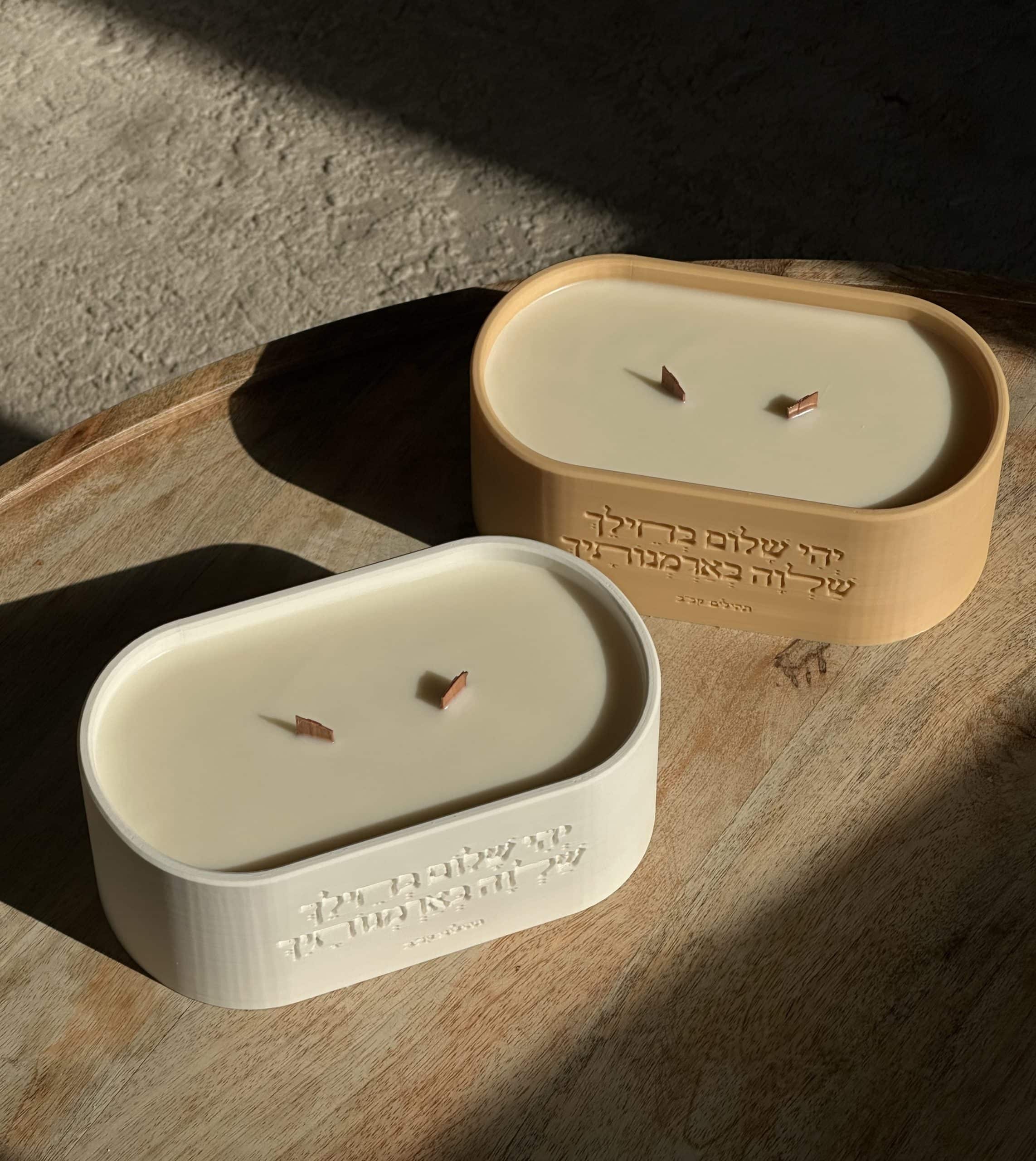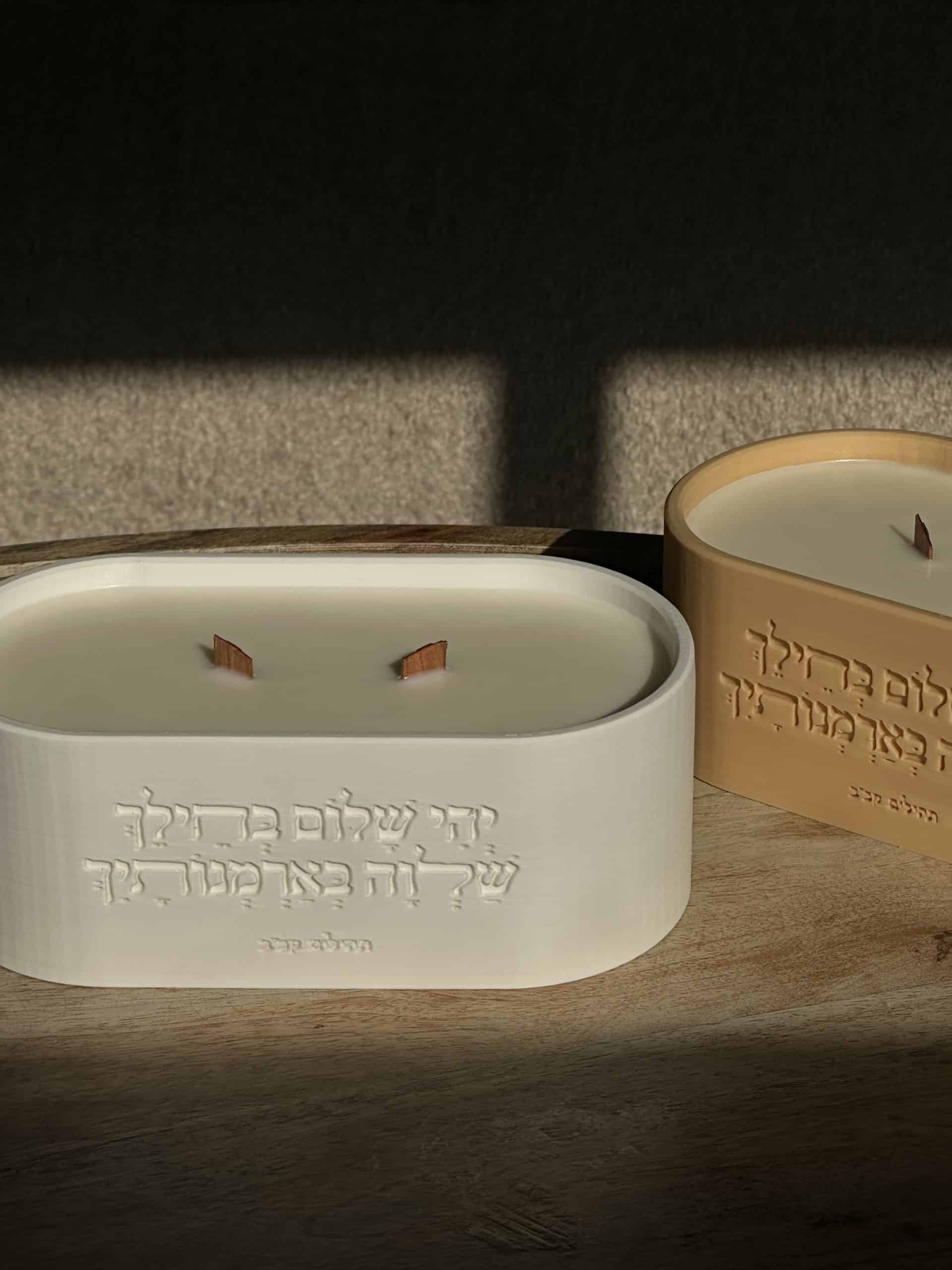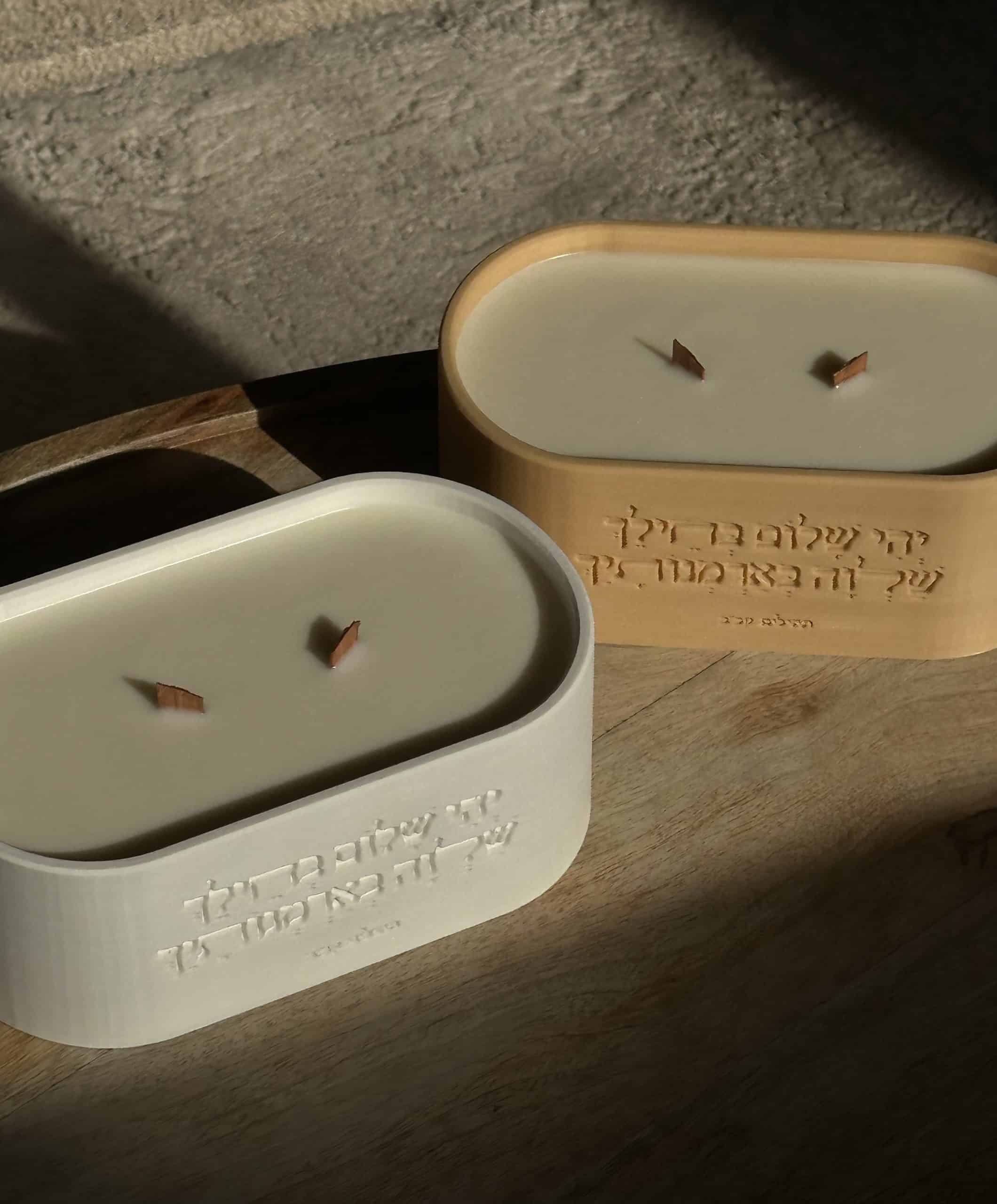 נר ריחני ומיוחד עם חריטה ״ יְהִי־שָׁל֥וֹם בְּחֵילֵ֑ךְ שַׁ֝לְוָ֗ה בְּאַרְמְנוֹתָֽיִךְ ״ מיוצר בטכנולוגיית תלת-ממד חדשנית וידידותית לסביבה בייצור שלנו. מכיל שעוות סויה טבעית ופתילי עץ.