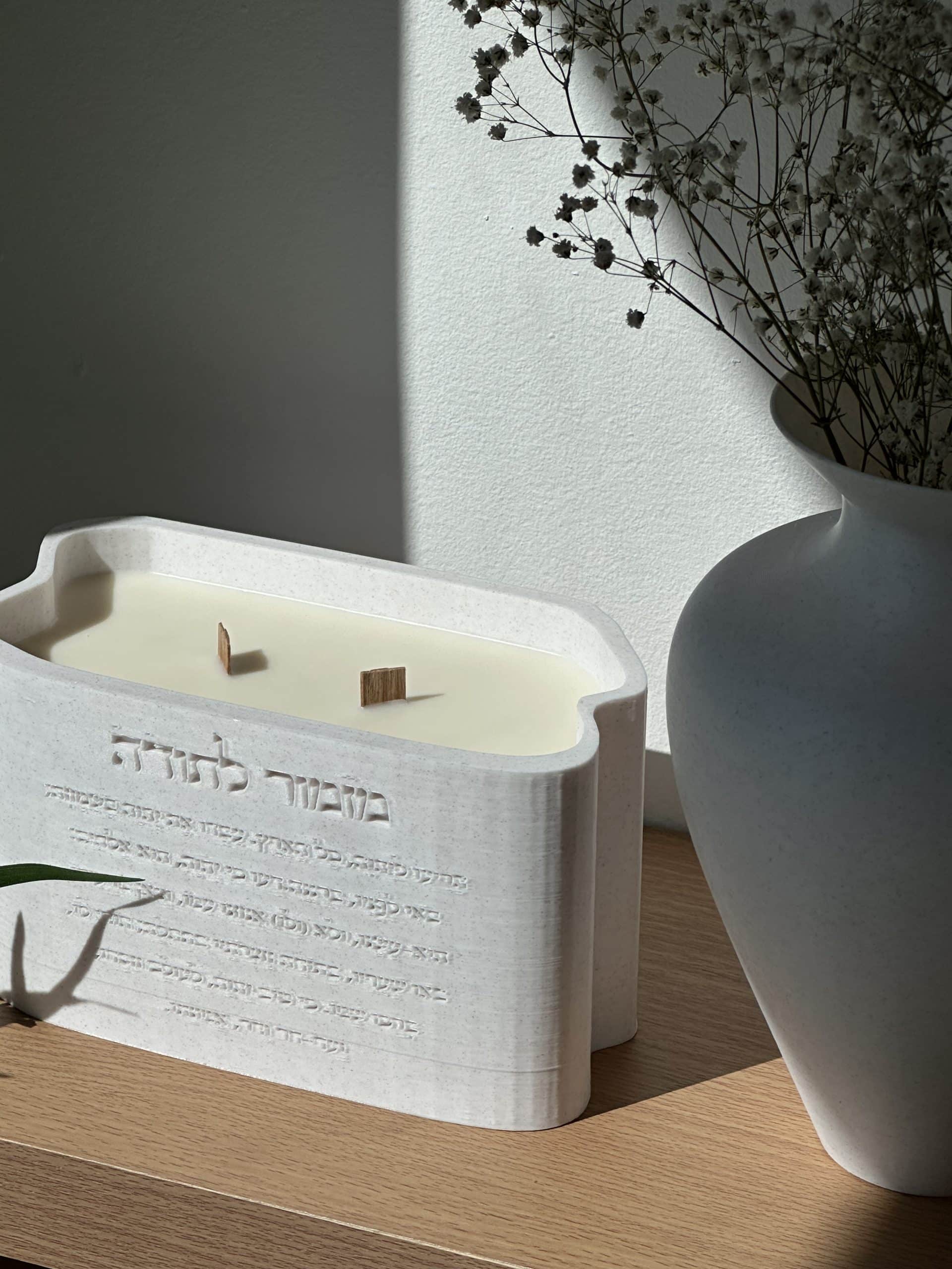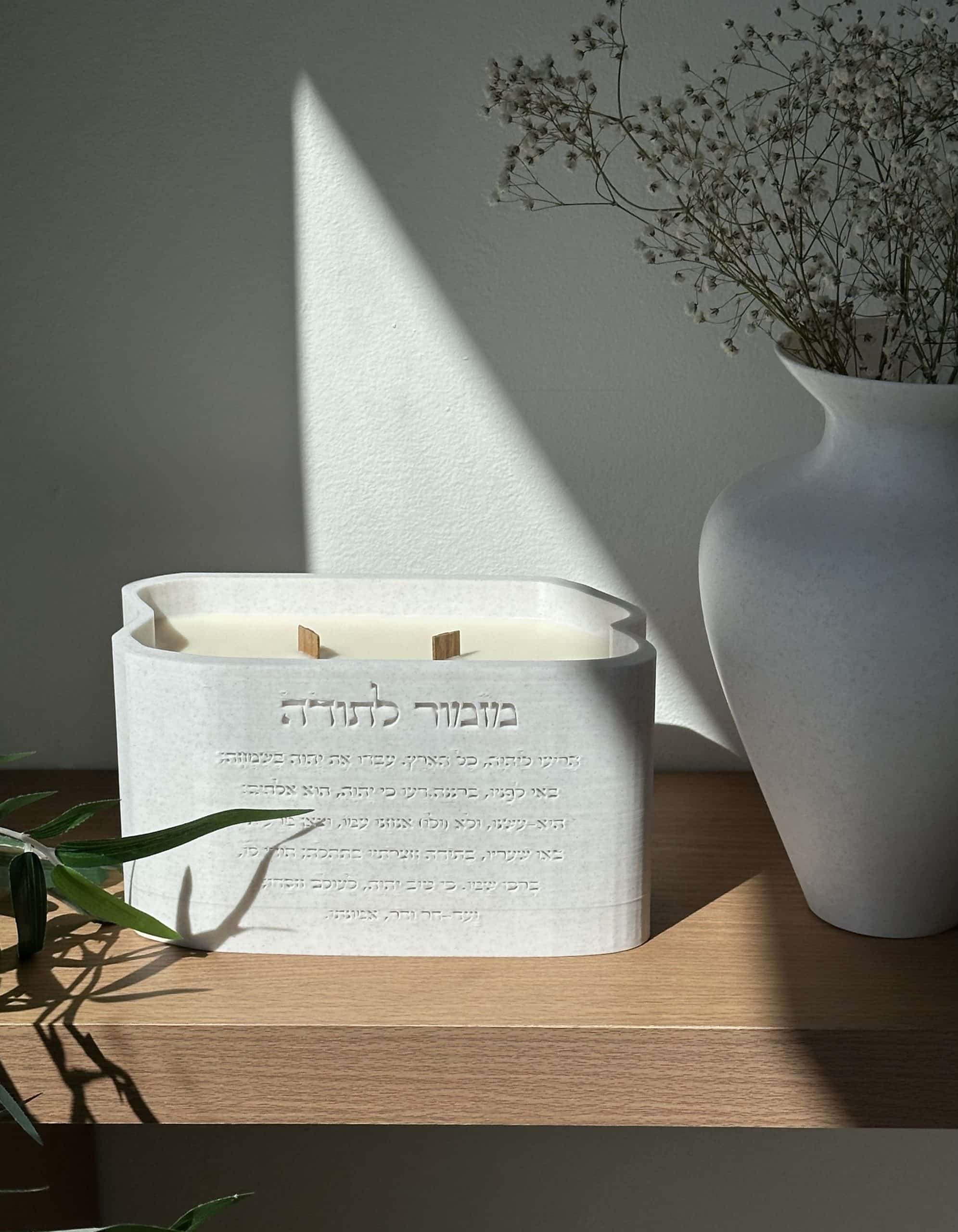 נר גדול ומיוחד עם חריטה של ״מזמור לתודה״ בגוון לבן. מיוצר בטכנולוגיית תלת ממד חדשנית. מגיע בניחוח מושלם לבחירתכם בשילוב שעוות סויה טבעית ופתילי עץ.
