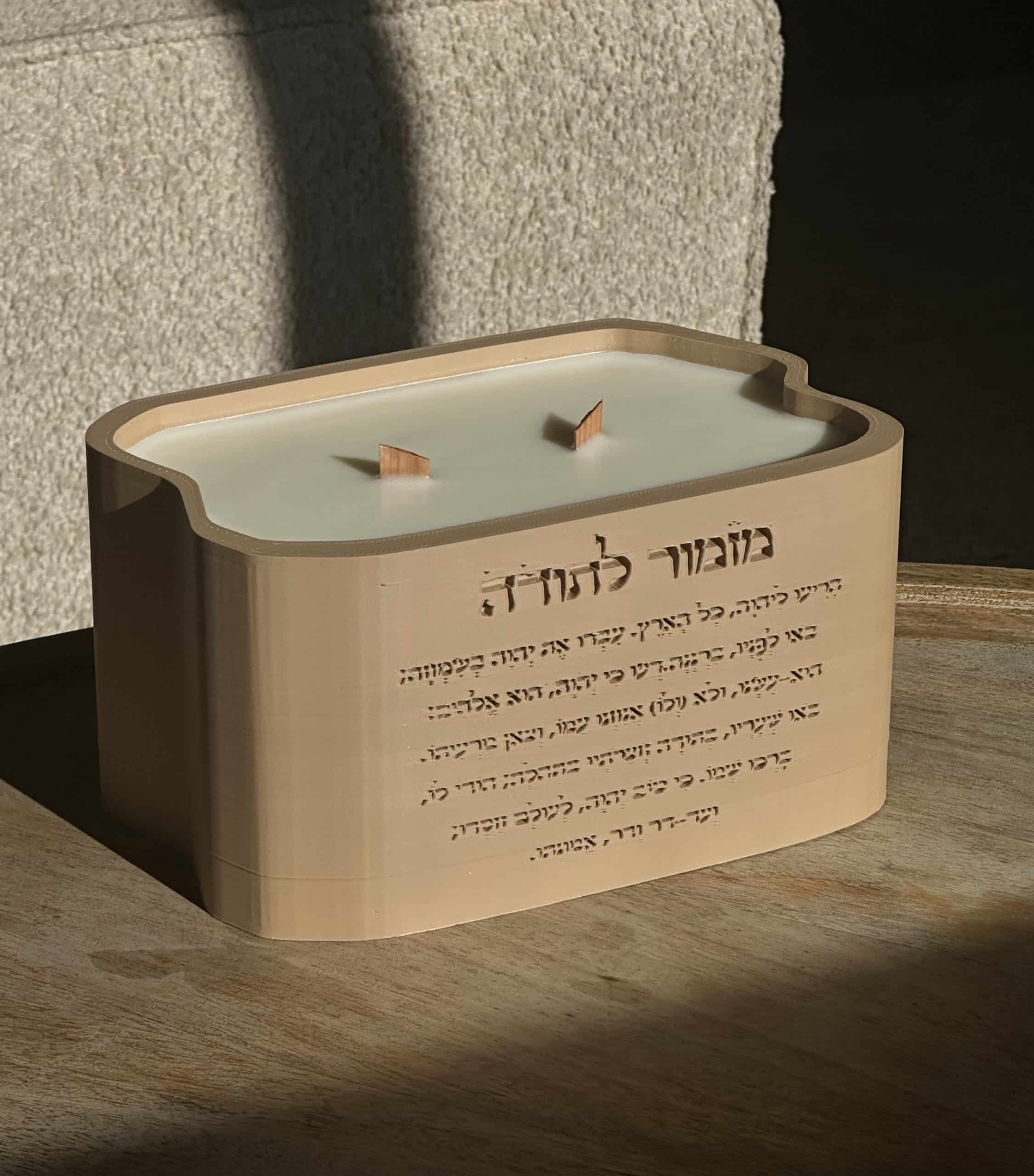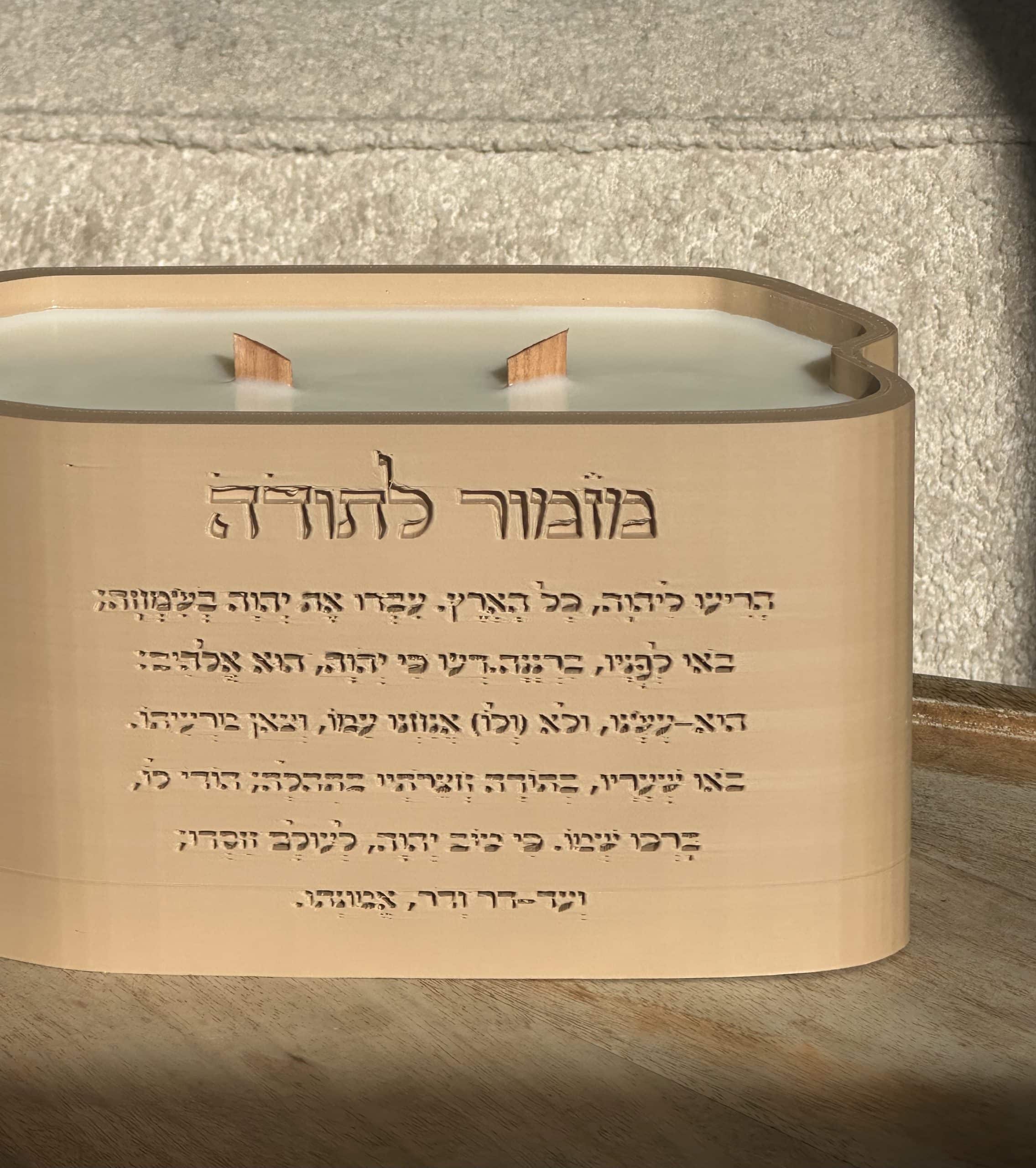 נר גדול ומיוחד עם חריטה של ״מזמור לתודה״ בגוון חום מוקה. מיוצר בטכנולוגיית תלת ממד חדשנית. מגיע בניחוח מושלם לבחירתכם בשילוב שעוות סויה טבעית ופתילי עץ.