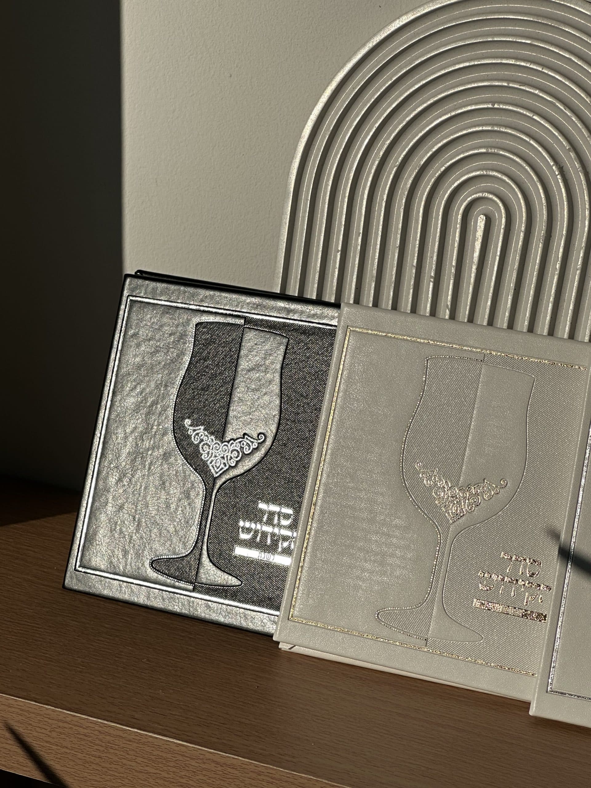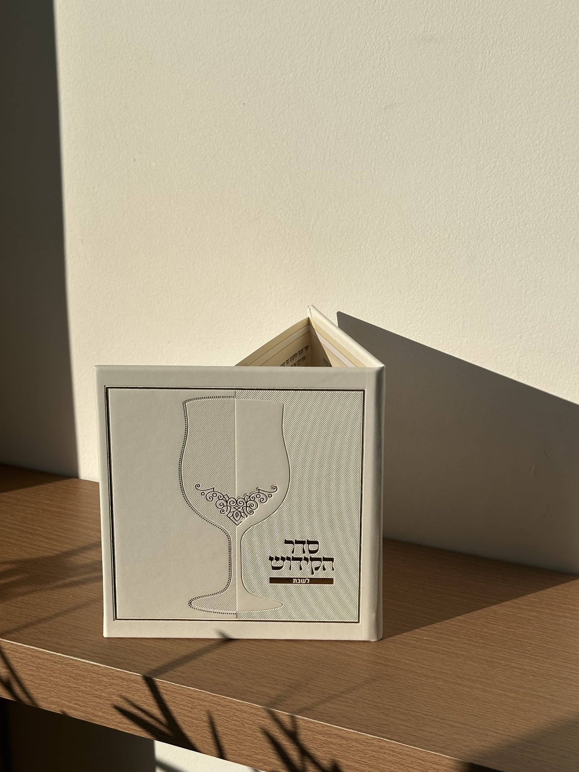 ספר קידוש דמוי עור , גובה 15 ס”מ , רוחב 15 ס”מ .