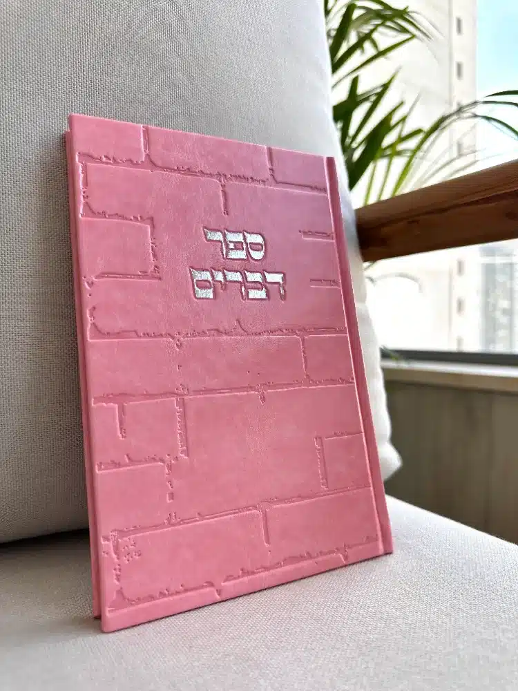 ספר דברים מפואר דגם כותל , גוון ורוד עם כיתוב כסף , אורך 17 ס”מ , רוחב 12 ס”מ .