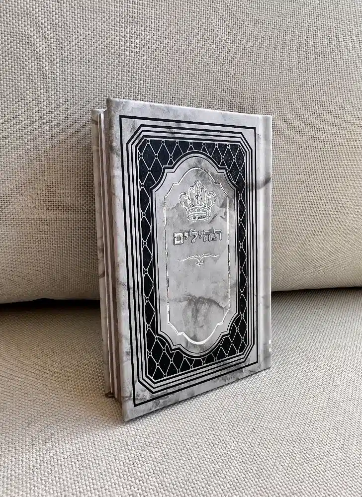 ספר תהילים דמוי עור דגם כתר , גוון אפור עם כיתוב כסף , אורך 13 ס”מ , רוחב 9 ס”מ .