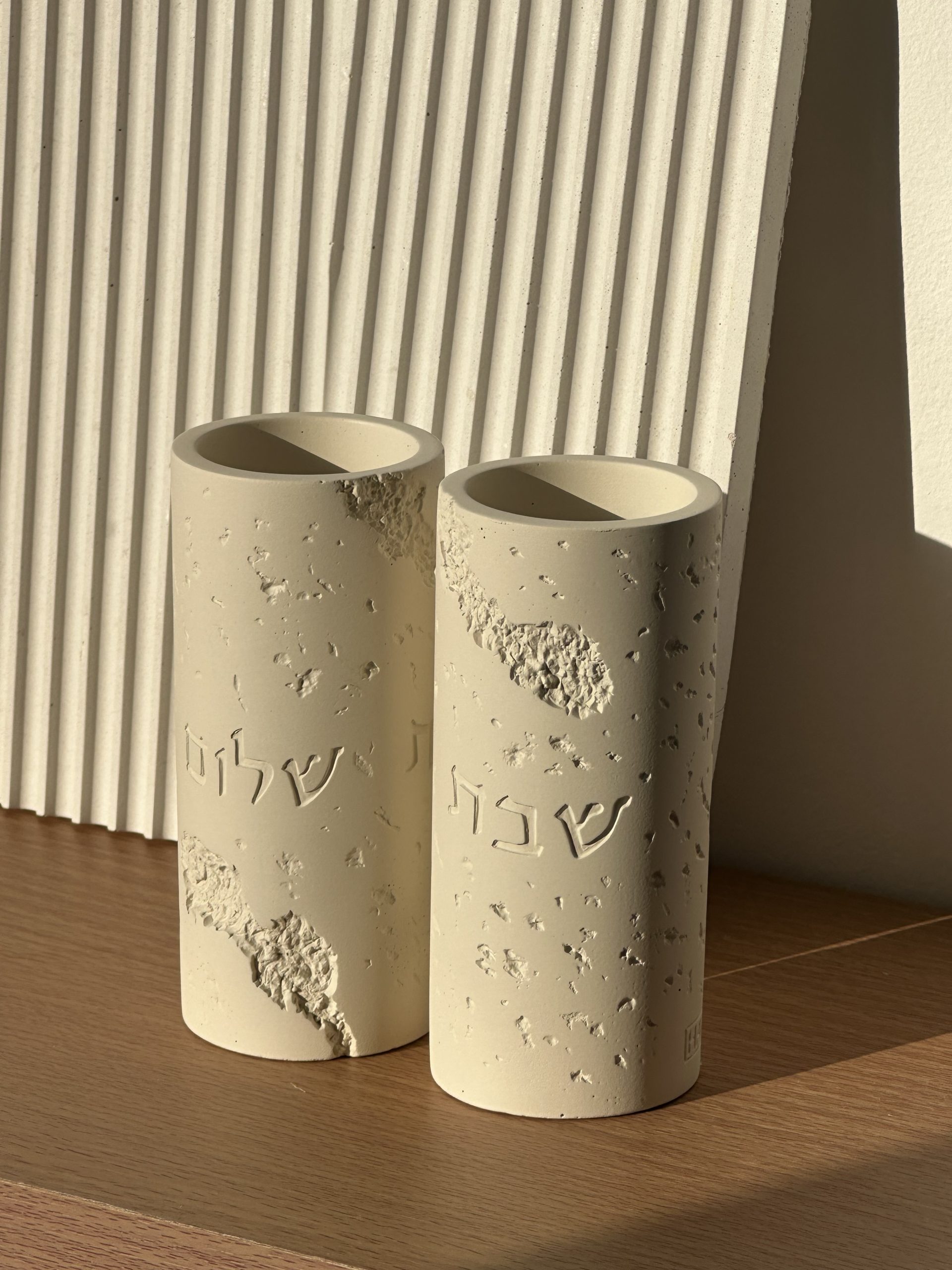 פמוטים לשבת מבטון ״ שבת שלום ״ גוון שמנת , גובה 12 ס”מ .