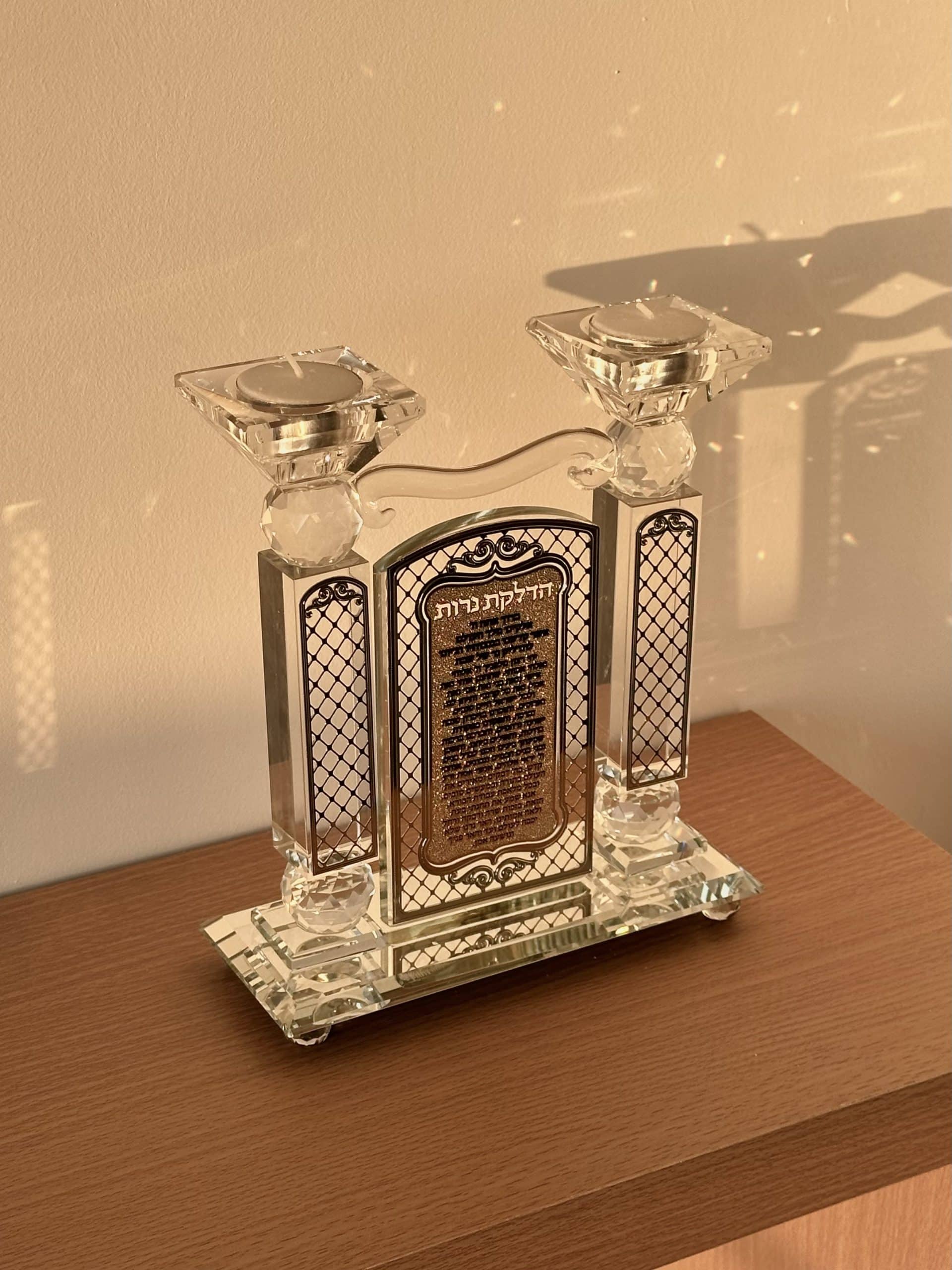 פמוט זוגי עם פלקטה של הדלקת נרות , גוון שקוף ורוז גולד , אורך 21 ס״מ .