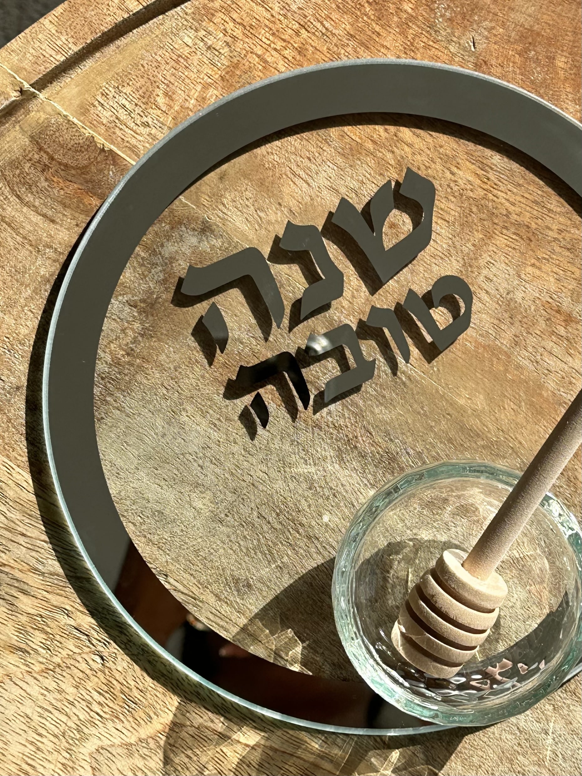 צלחת מהודרת מזכוכית לתפוח בדבש + מקל עץ לדבש וקערה מוטבעת , מסגרת בצבע כסף , 19 ס״מ .
